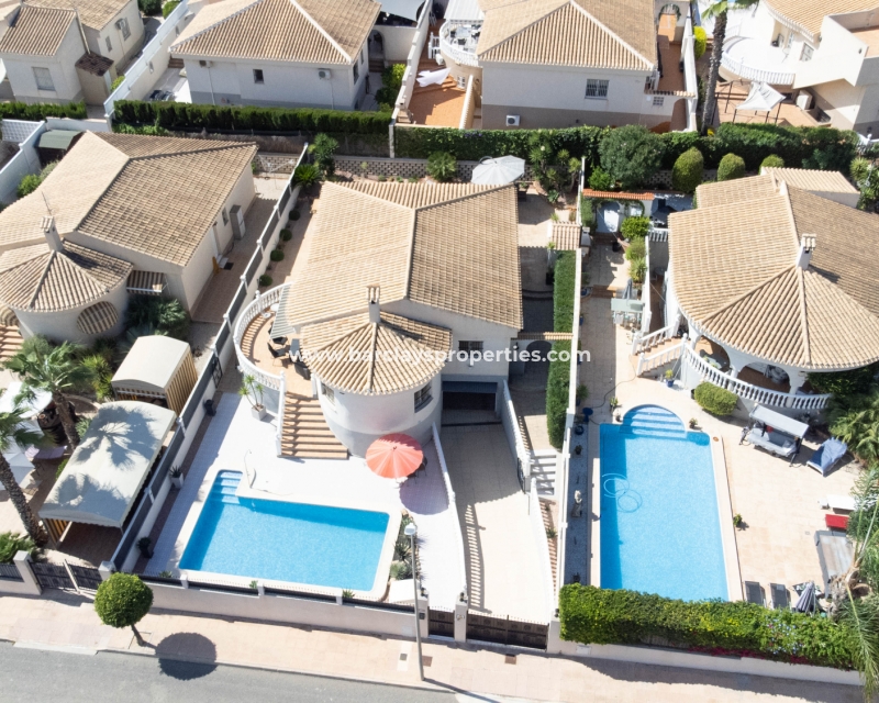 Cette merveilleuse propriété a tout pour plaire ! Elle est située dans un emplacement de choix dans l'urbanisation de La Marina, qui regroupe de nombreuses entreprises multinationales. Située sur un grand terrain d'angle de 800 m2, cette villa orientée sud-ouest se trouve à côté de deux parcs et à seulement cinq minutes à pied de la place Consum où vous trouverez un grand supermarché, divers magasins et un éventail de bars et de restaurants de cuisine mixte, qui offrent des spectacles en direct pendant les mois les plus chauds de l'année. Cinq minutes dans la direction opposée vous mèneront à une autre zone commerciale, en passant par un grand complexe sportif avec un mini golf, une salle de billard et un parc aquatique pour enfants. Vous y trouverez une pharmacie, la mairie, un cabinet médical, des banques, un supermarché, ainsi que d'autres bars et restaurants. Il y a également un supermarché international ouvert sept jours sur sept, qui propose une variété de produits internationaux et du pain fraîchement cuit tous les jours.