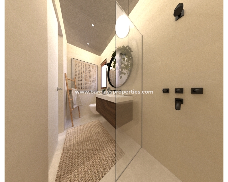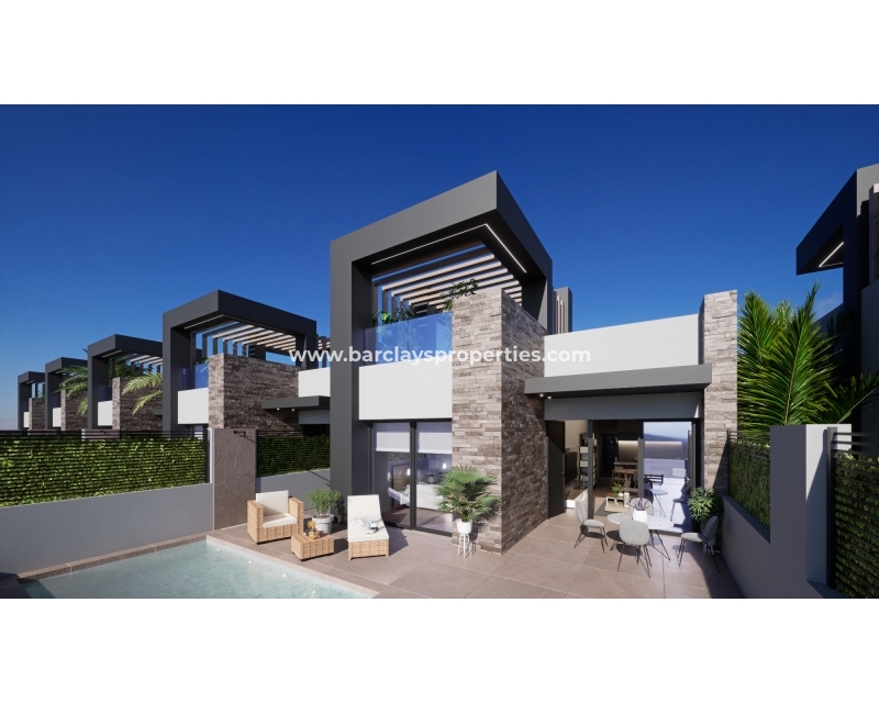Chaque villa est soigneusement conçue avec des caractéristiques modernes et des finitions de haute qualité. Les fenêtres à double vitrage et les stores électriques assurent une efficacité énergétique et une intimité, tandis que la cuisine moderne est équipée d'une hotte pour votre confort. Un élément remarquable de ces villas est le spacieux solarium sur le toit, où vous pourrez vous détendre et profiter du soleil espagnol tout en bénéficiant de l'ombre de la pergola.