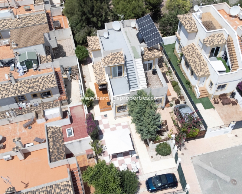 Cette charmante maison mitoyenne offre une expérience de vie merveilleuse avec diverses caractéristiques désirables. Le joli jardin est pavé et recouvert de gravier, avec diverses plantes, arbustes et citronniers, ainsi qu'un parking hors route. Des marches mènent à un porche avant vitré qui nous conduit à l'intérieur de la propriété et au salon spacieux et lumineux avec une cheminée électrique murale et un ventilateur de plafond.