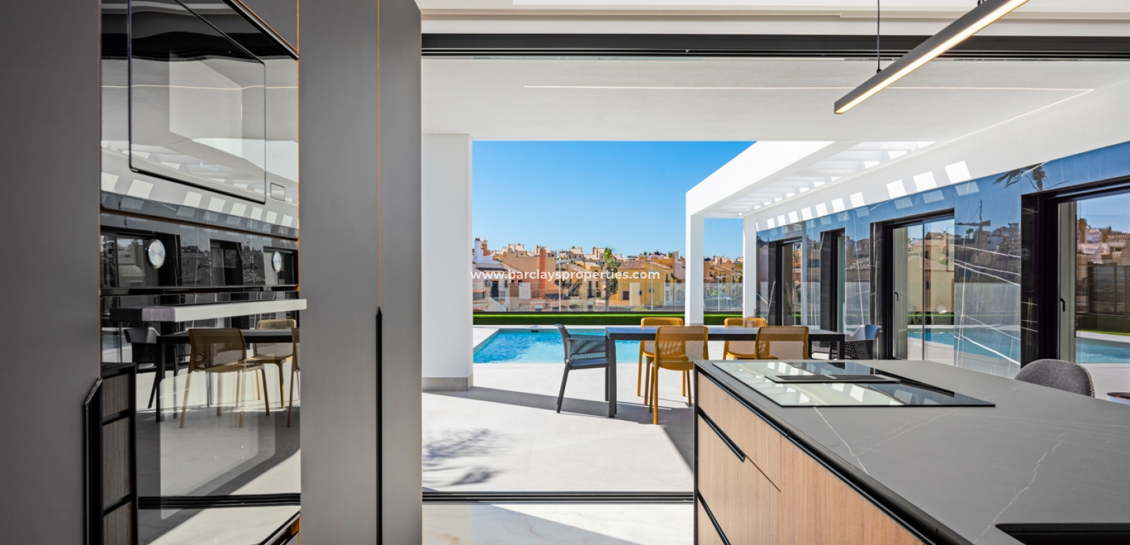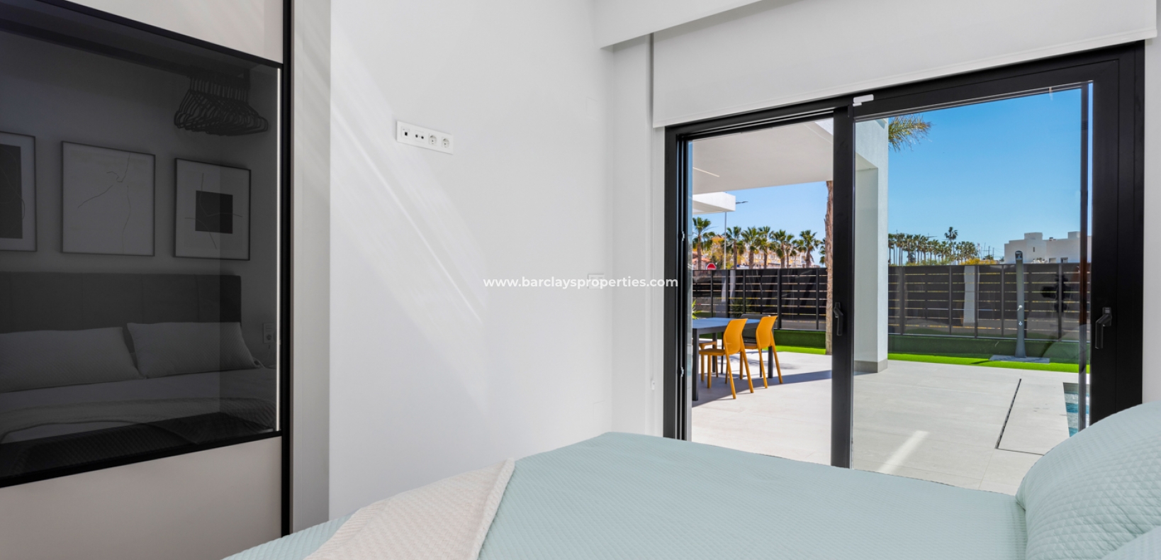Des caractéristiques telles qu'un système de chauffage de l'eau par aérothermie, des stores électriques, des fenêtres à double vitrage et une porte de sécurité renforcée garantissent confort et sécurité. Avec un système d'interphone vidéo et des portails électriques, la maison offre intimité dans une zone calme, tout en étant à seulement 300 mètres des commodités locales et à 1,8 km des parcours de golf.