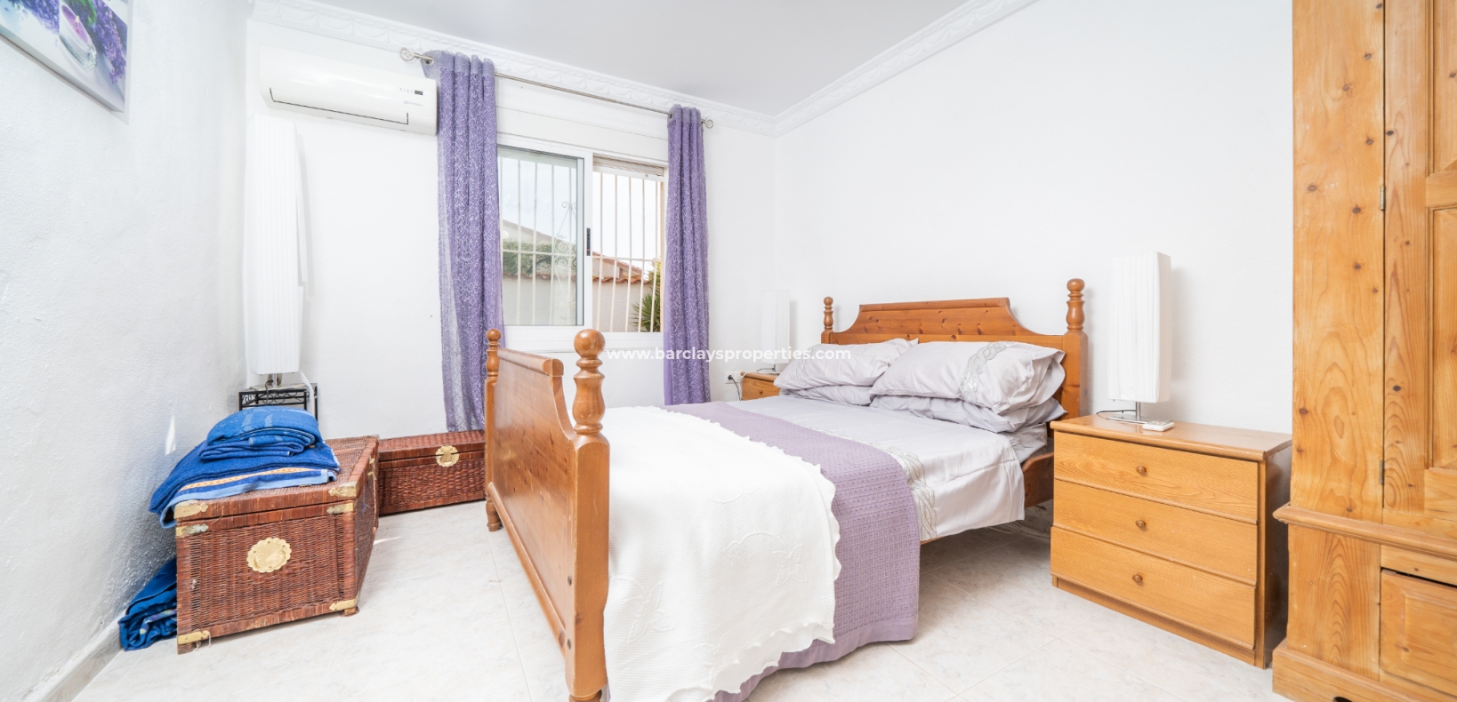La villa dispose de trois chambres spacieuses. La première est une chambre double confortable avec climatisation, offrant un havre de détente. La deuxième chambre est particulièrement grande, également équipée de la climatisation et comprend une grande armoire encastrée. La troisième chambre est une autre chambre double avec une armoire encastrée, offrant beaucoup de rangement.