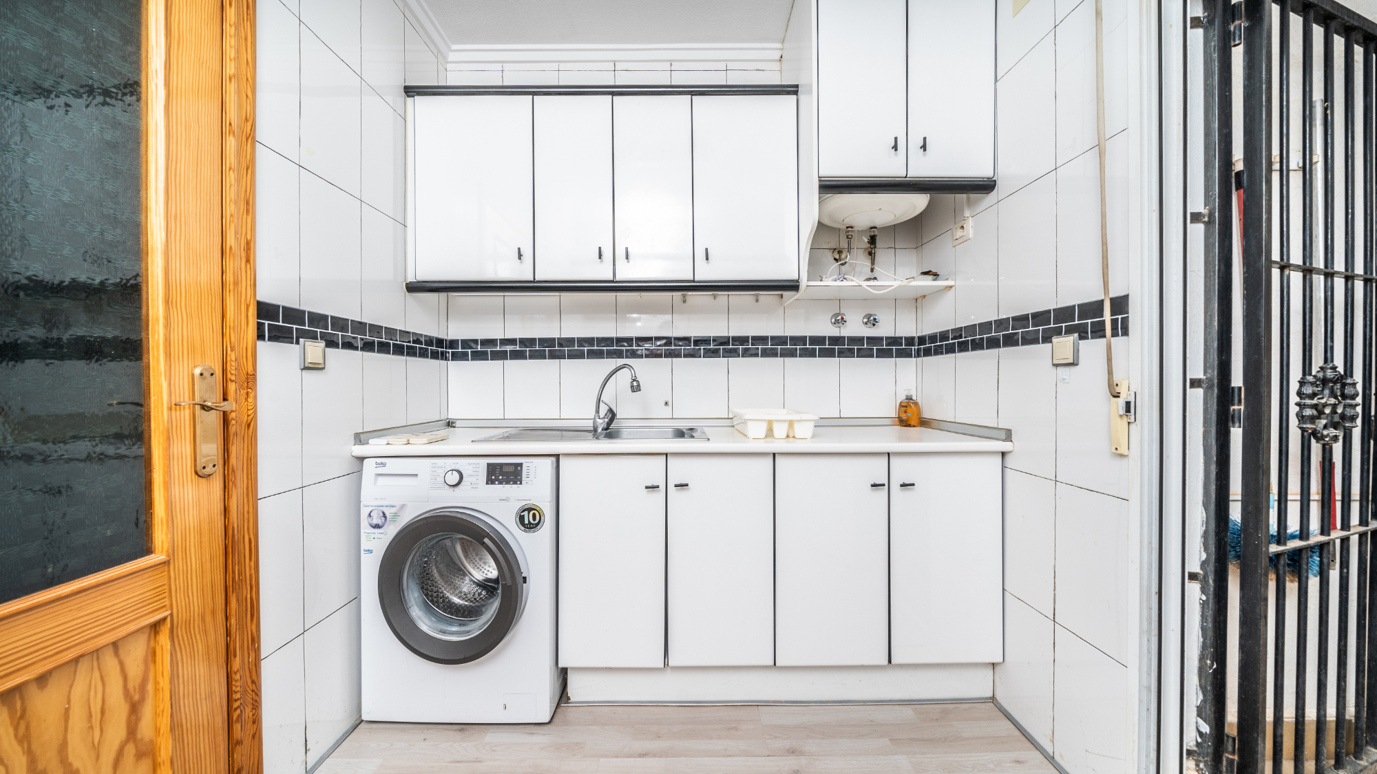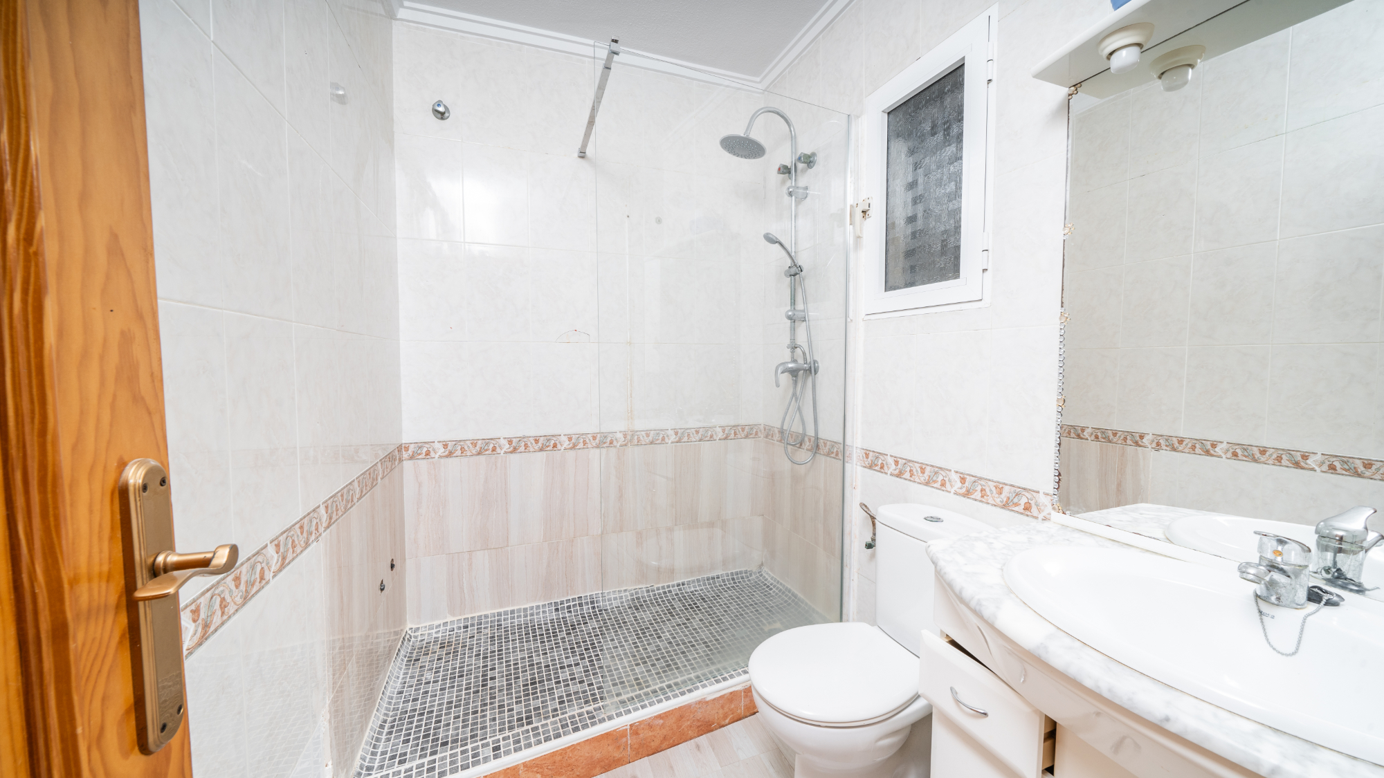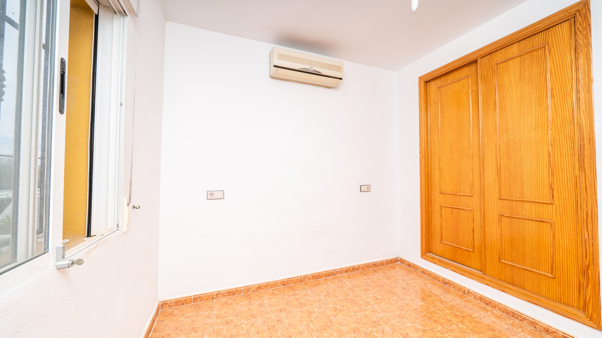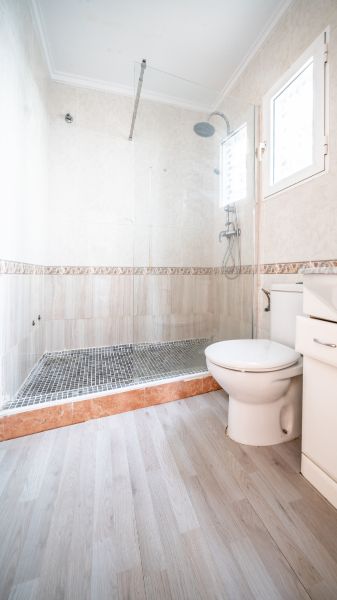 À l'intérieur, le salon est équipé de la climatisation et de parquet, créant un espace confortable et élégant. Il y a trois chambres : la chambre principale double est équipée de placards intégrés et de climatisation ; une deuxième chambre double comprend également la climatisation et un placard intégré, et la troisième chambre est une chambre double. La salle de bain est moderne et dispose d'une grande douche mur à mur. La cuisine indépendante est entièrement électrique et mène à une buanderie.