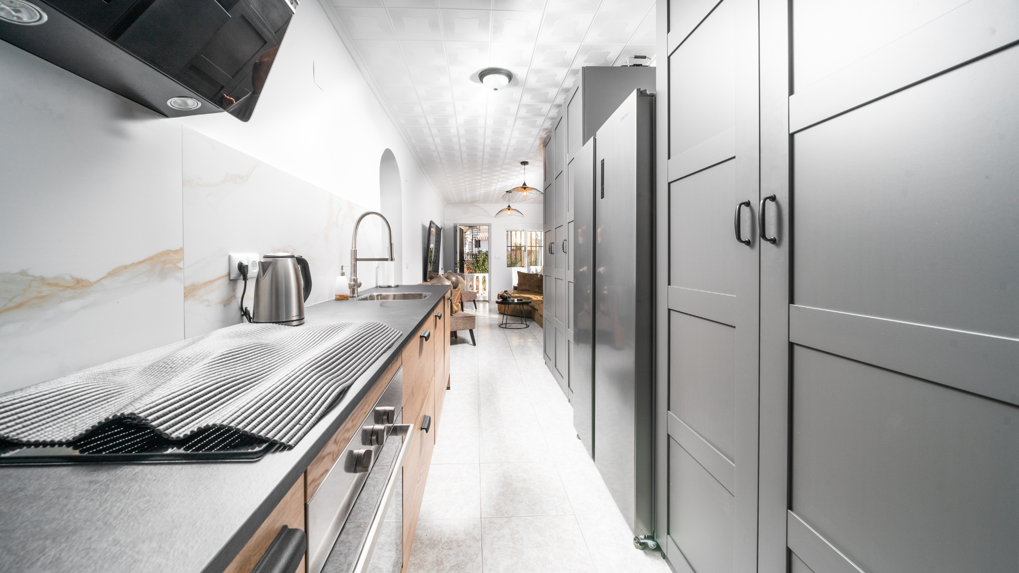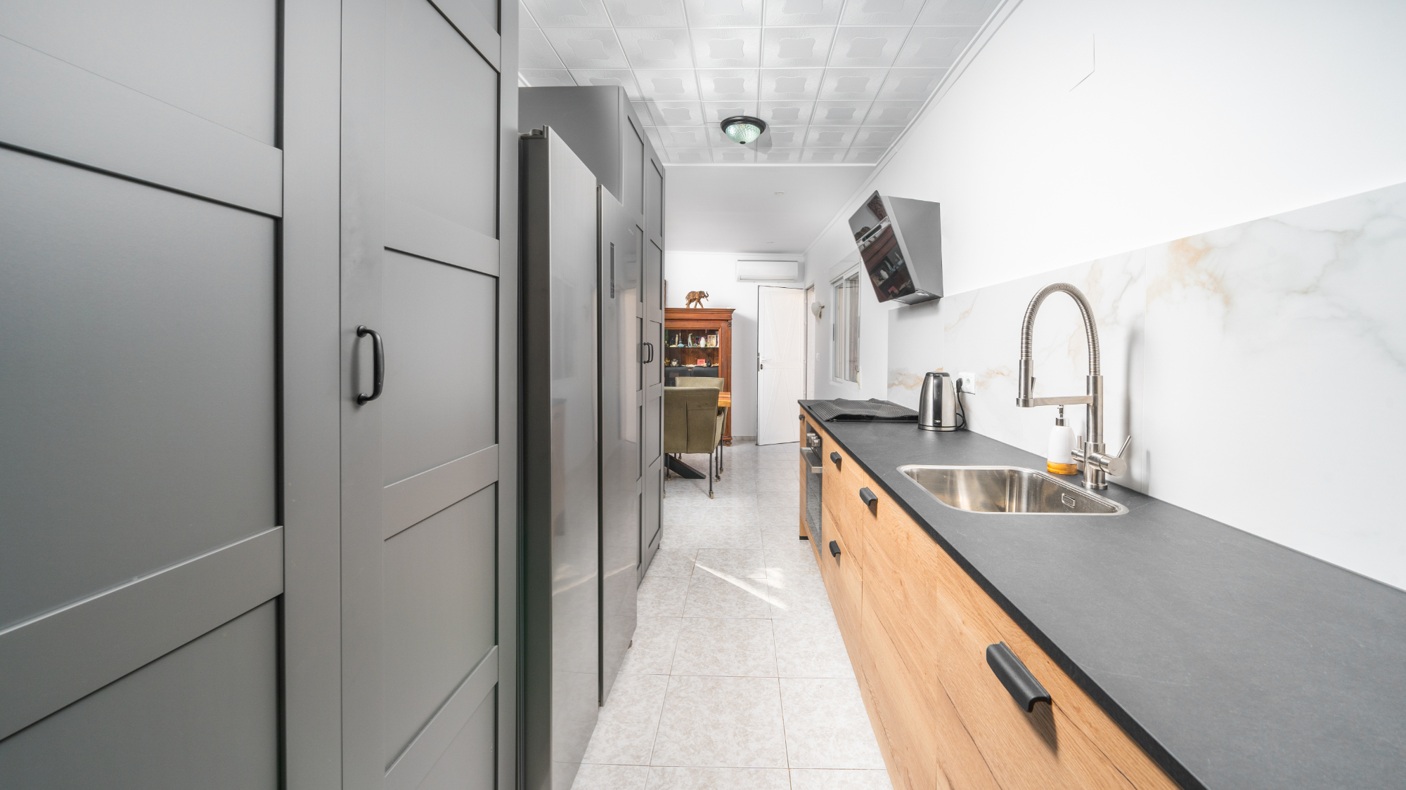 Le salon moderne est équipé de la climatisation et mène à une nouvelle cuisine, ➡️ qui comprend les appareils électroménagers. Une salle à manger séparée, également climatisée, crée un espace parfait pour recevoir.