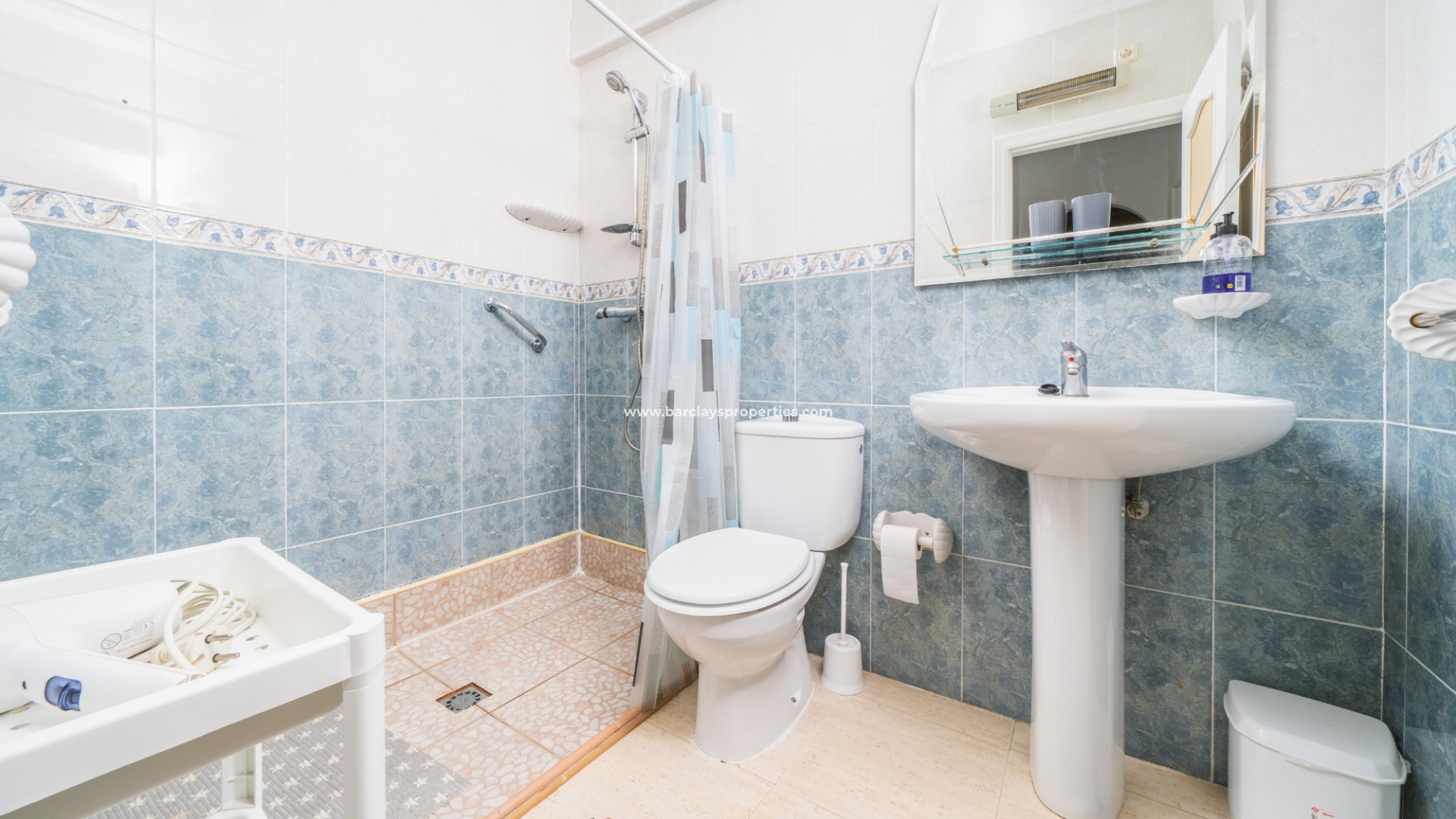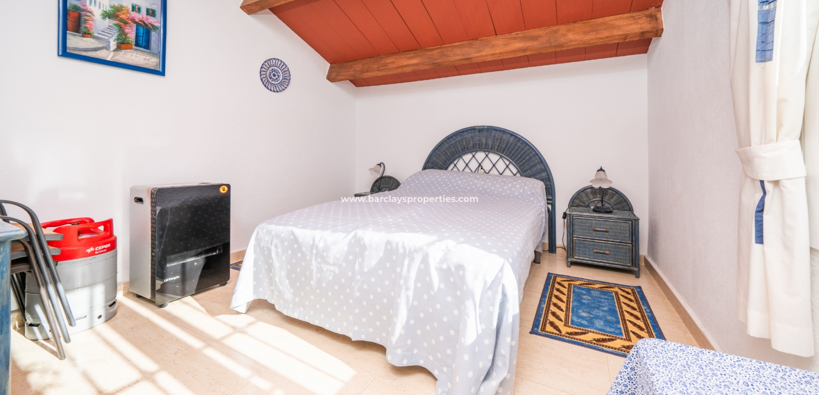 Une jolie terrasse couverte à l'avant avec coin salon et auvents solaires mène à l'intérieur de la propriété et au salon accueillant avec coin repas, cheminée ouverte et climatisation pour un confort toute l'année. Depuis le hall, nous trouvons une chambre double avec climatisation et armoires encastrées, une chambre à deux lits avec ventilateur au plafond et armoire encastrée, ainsi qu'une salle de bains avec douche mur-à-mur, WC et lavabo avec miroir. La cuisine indépendante équipée possède une porte d'accès au jardin arrière avec coin salon, auvent solaire, espace de rangement/buanderie et un accès direct par la porte du jardin à la piscine commune.