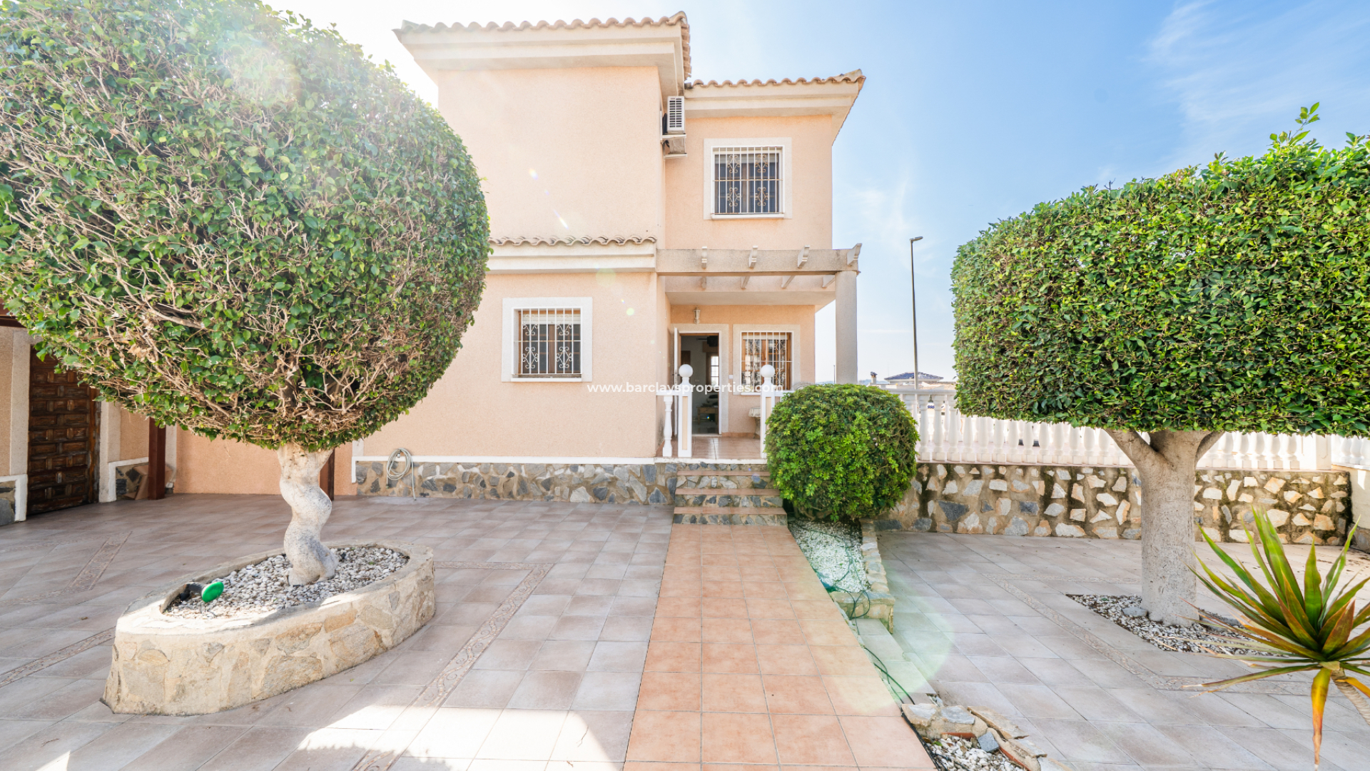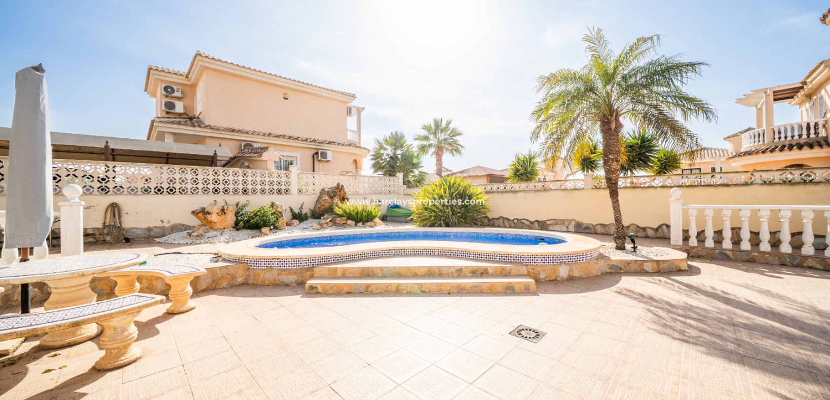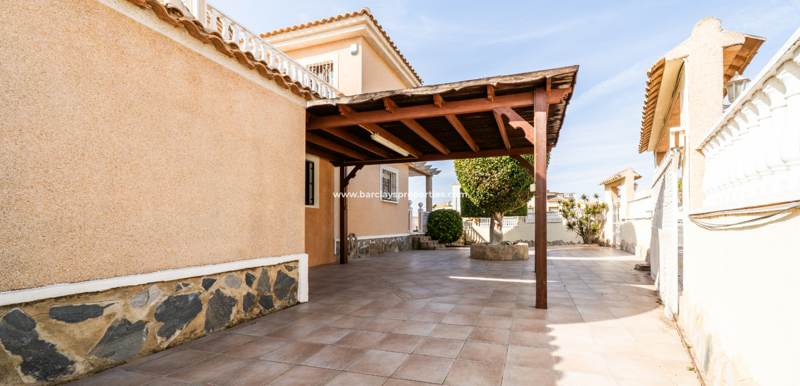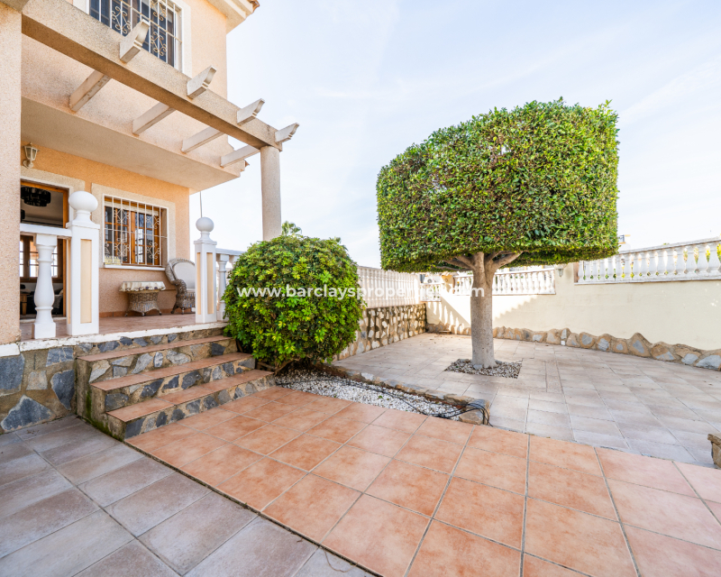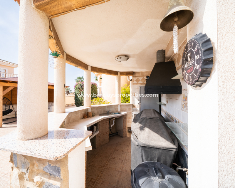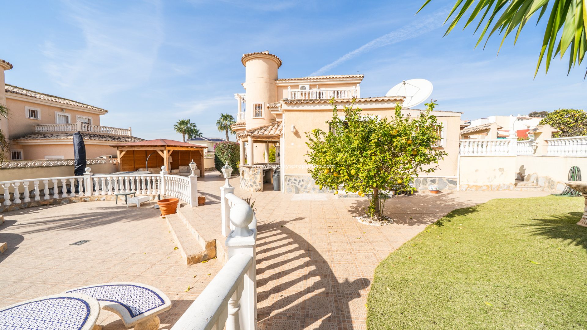 Située à Urb La Marina, cette villa indépendante modèle “Azucena” offre un ✅grand terrain d'angle de 555 m2 avec intimité et tranquillité. Le jardin pavé est complété par un abri extérieur, des arbres à oranges et à citrons, une ✅piscine privée en forme de rein, un gazebo avec salon extérieur et une douche extérieure. Un carport avec entrée fermée offre un stationnement sécurisé, tandis qu'une cuisine extérieure avec évier et barbecue à gaz crée un espace idéal pour les repas en plein air. L'éclairage extérieur améliore l'ambiance, rendant les espaces extérieurs agréables à toute heure de la journée.