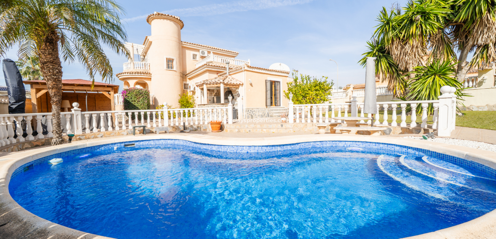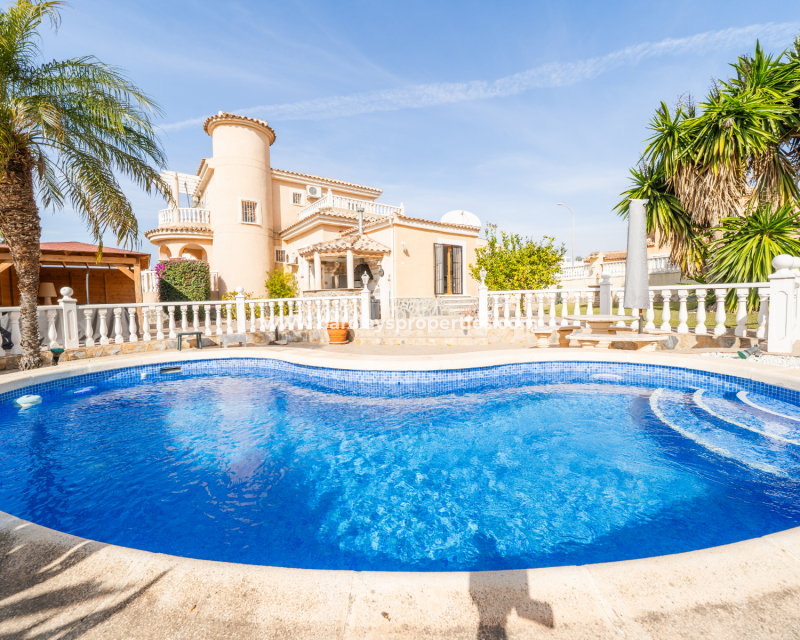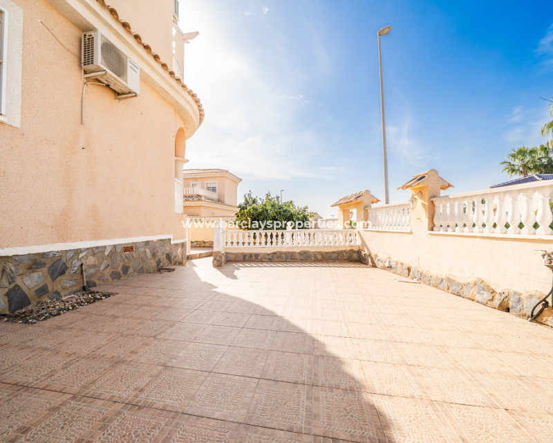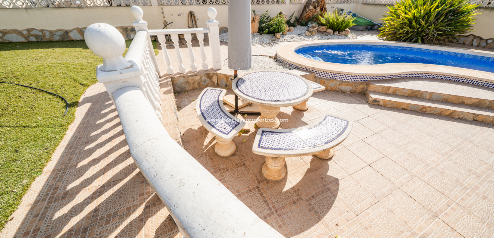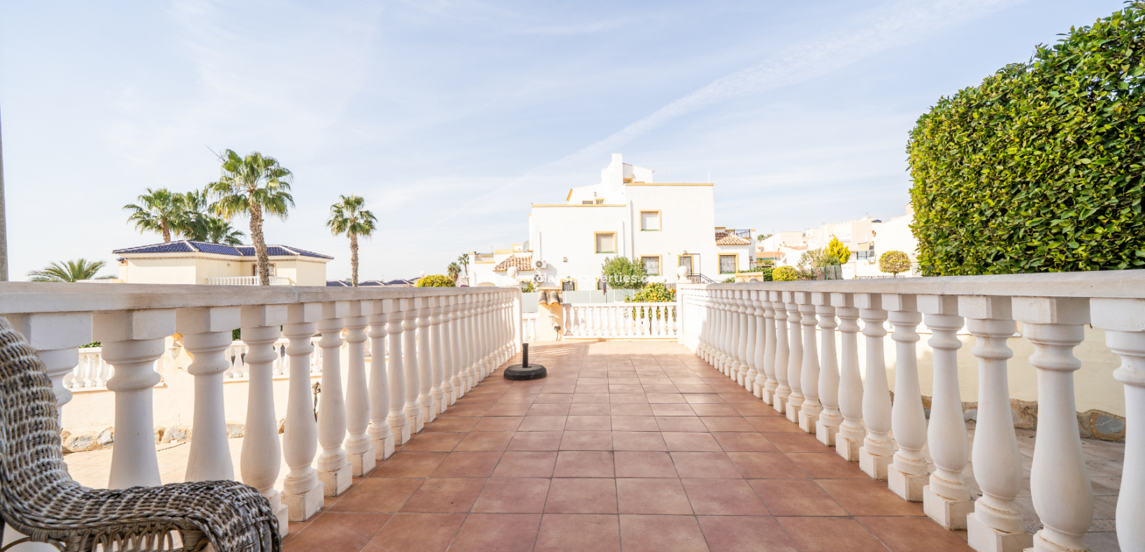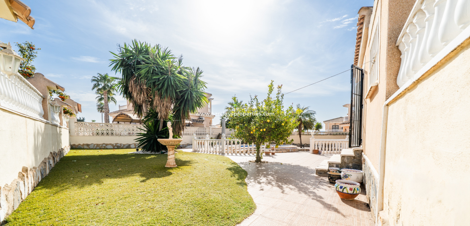 Située à Urb La Marina, cette villa indépendante modèle “Azucena” offre un ✅grand terrain d'angle de 555 m2 avec intimité et tranquillité. Le jardin pavé est complété par un abri extérieur, des arbres à oranges et à citrons, une ✅piscine privée en forme de rein, un gazebo avec salon extérieur et une douche extérieure. Un carport avec entrée fermée offre un stationnement sécurisé, tandis qu'une cuisine extérieure avec évier et barbecue à gaz crée un espace idéal pour les repas en plein air. L'éclairage extérieur améliore l'ambiance, rendant les espaces extérieurs agréables à toute heure de la journée.
