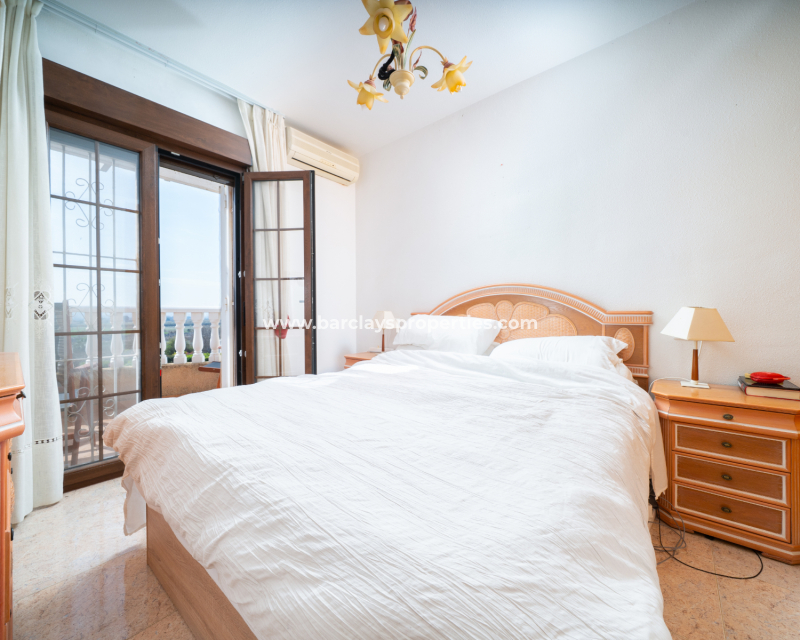 Un impressionnant escalier en marbre mène au premier étage, où la deuxième chambre dispose de placards intégrés, de la climatisation et de portes-fenêtres donnant sur un balcon avec vue sud-ouest sur les montagnes. La salle de bain familiale comprend un bidet, des toilettes, une baignoire et un lavabo. Deux autres chambres doubles, toutes deux avec climatisation, offrent du confort, l'une disposant de placards intégrés et l'autre ayant un accès direct au balcon, offrant des vues imprenables sur les couchers de soleil sur les montagnes.