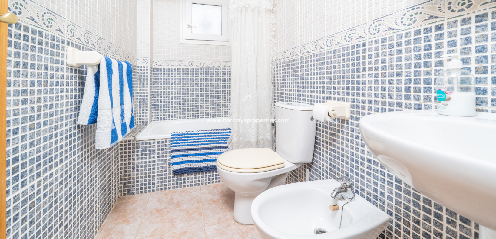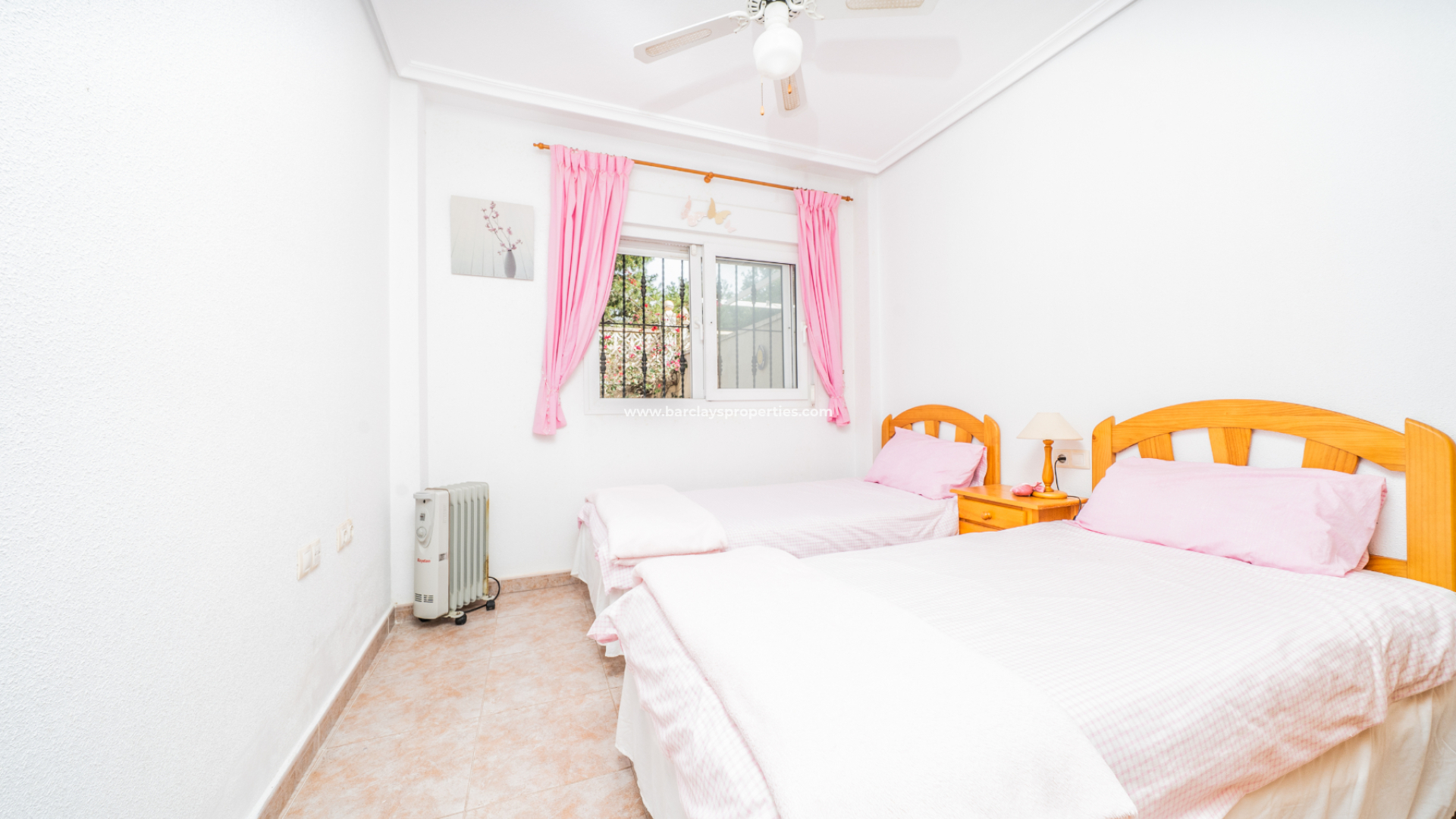 La propriété se compose de trois chambres. La première est une chambre simple pouvant accueillir deux lits jumeaux, avec un ventilateur de plafond et une porte-fenêtre donnant accès au jardin. La deuxième chambre est une chambre double avec un ventilateur de plafond et une armoire encastrée. La chambre principale comprend une armoire encastrée, la climatisation et une salle de bains attenante avec baignoire, WC, bidet et lavabo.
