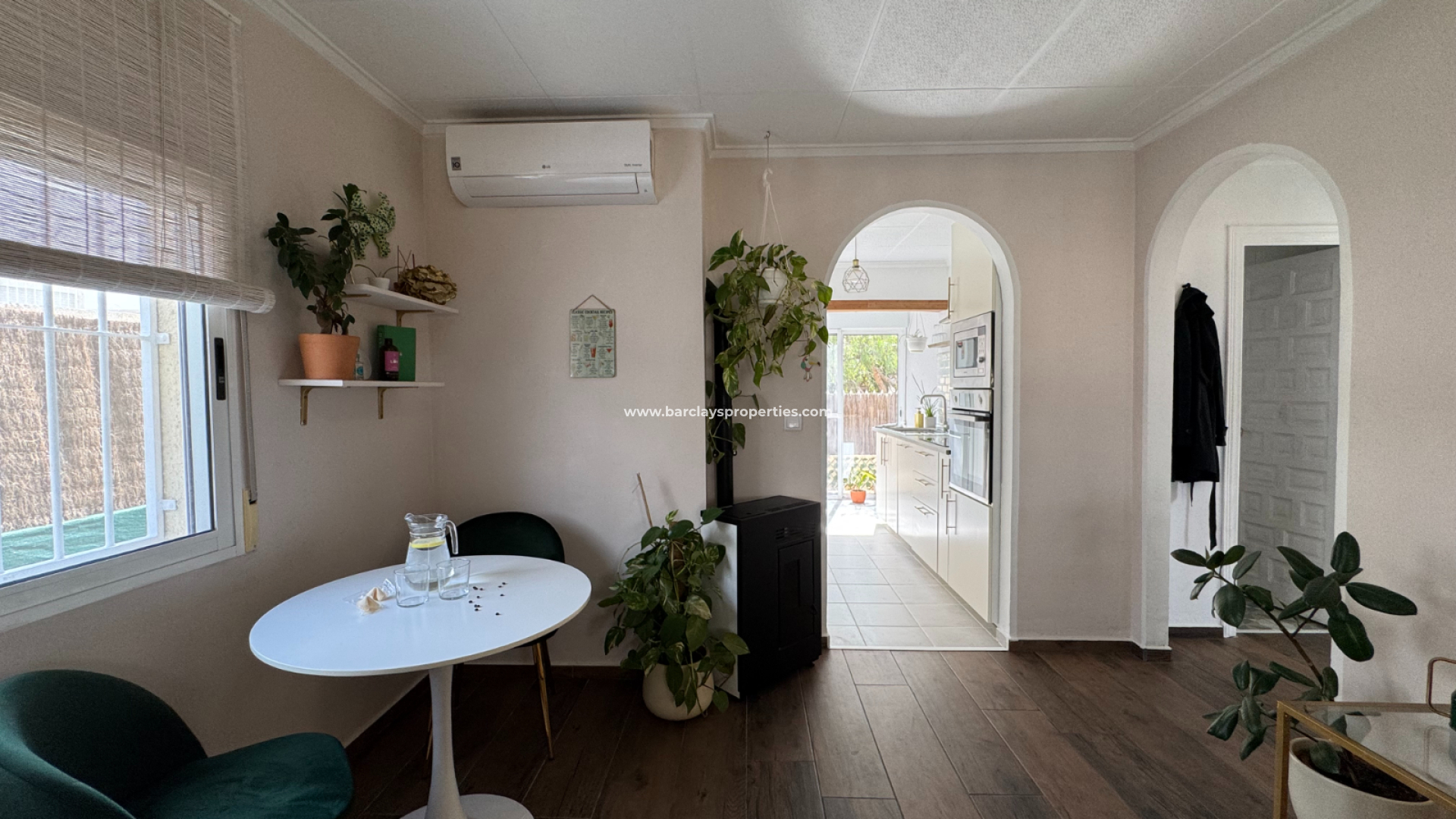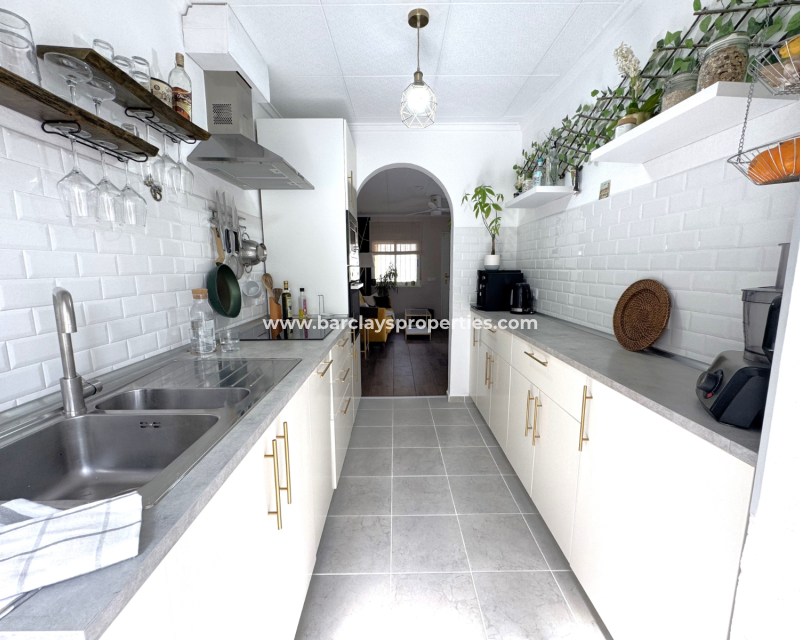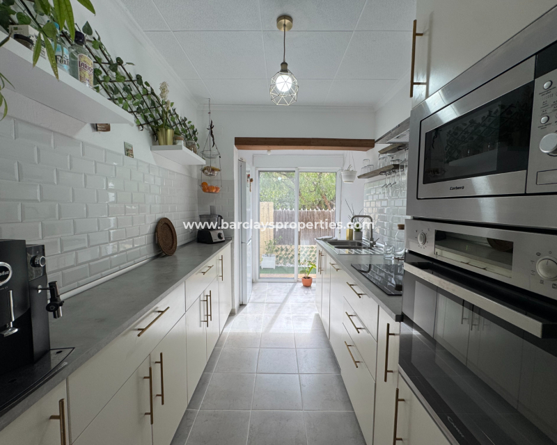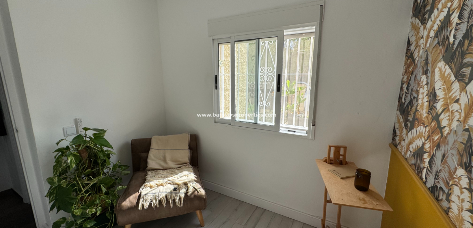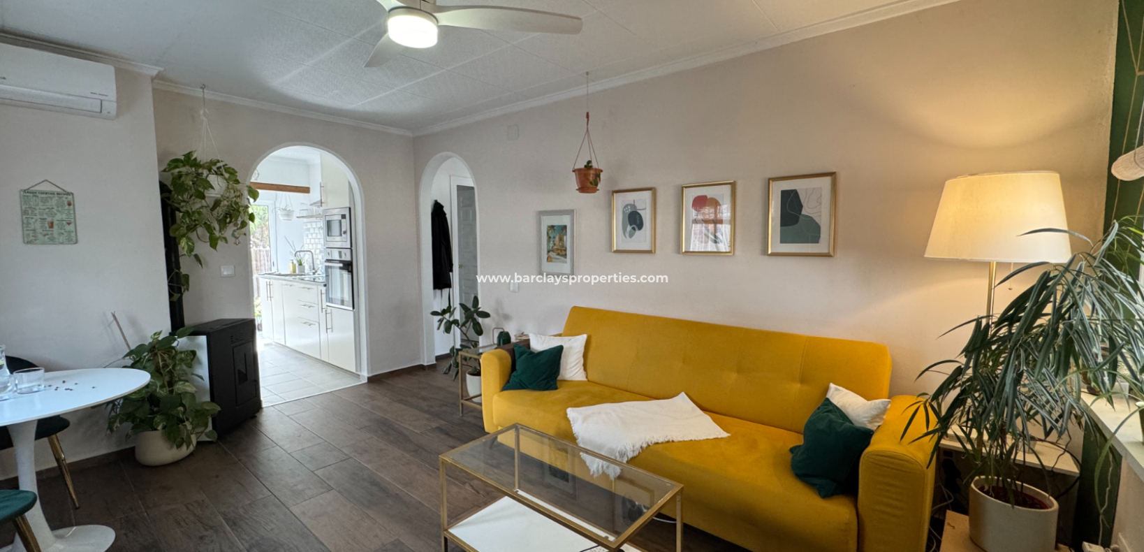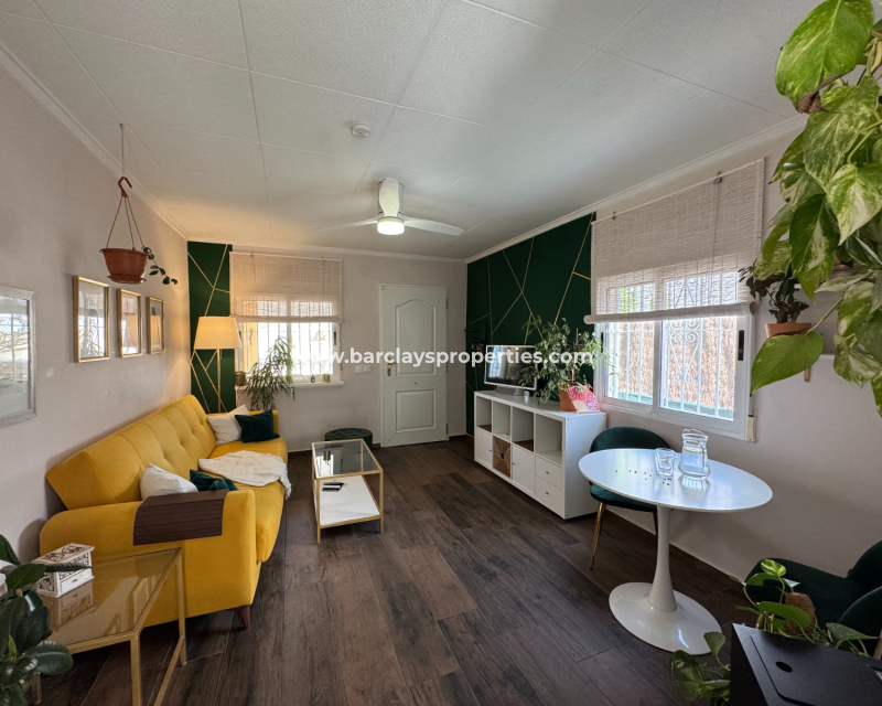 Un escalier mène au porche couvert à l’avant, qui donne accès à l’intérieur de la villa avec un salon lumineux et moderne incluant une salle à manger. La cuisine rénovée, au style contemporain, est entièrement équipée, avec une buanderie et un accès direct au jardin par des portes-fenêtres. Le couloir mène à deux chambres ainsi qu’à une salle de bains moderne récemment rénovée. Le mobilier soigné et le choix harmonieux des couleurs rendent cette villa très accueillante – parfaite pour y vivre toute l’année ou comme maison de vacances sur la Costa Blanca.