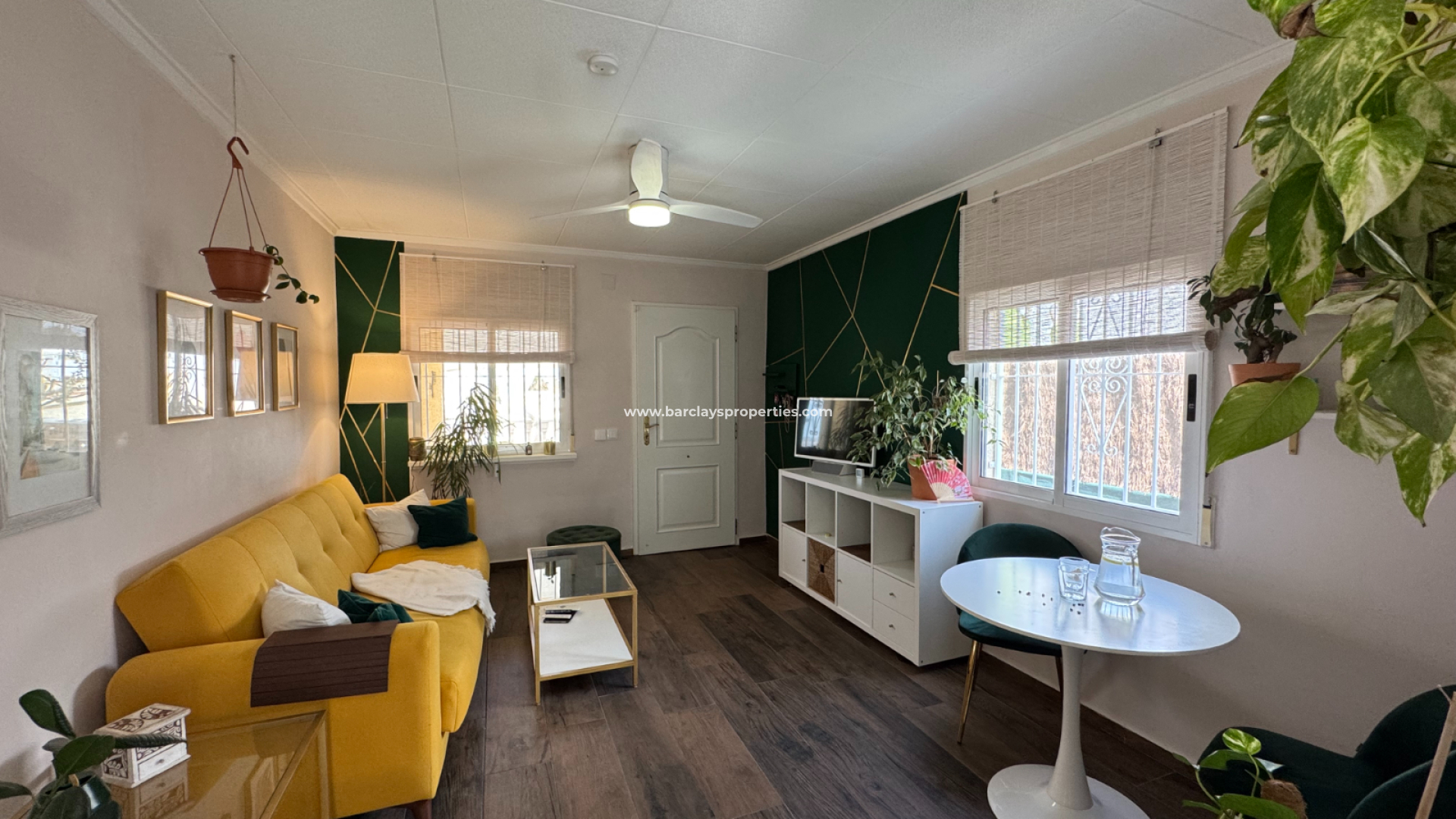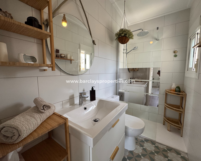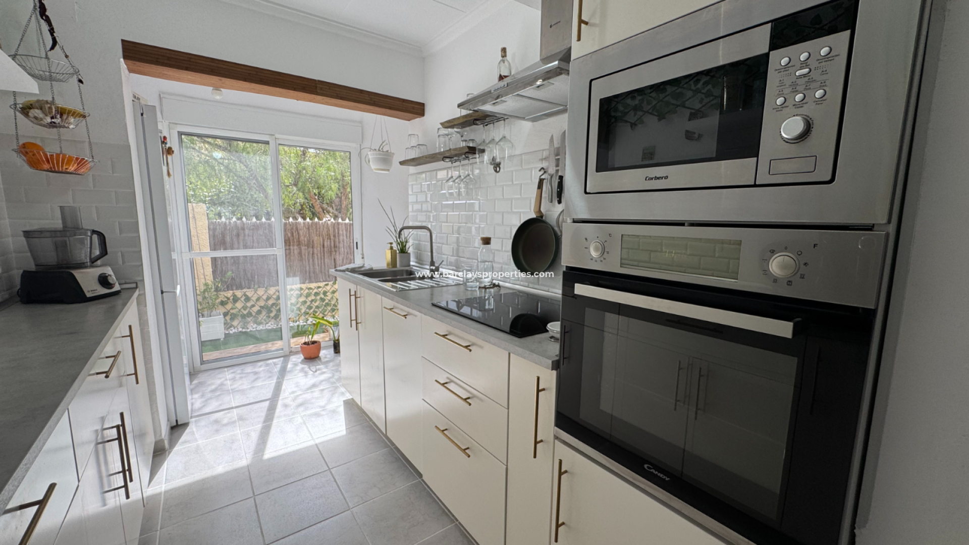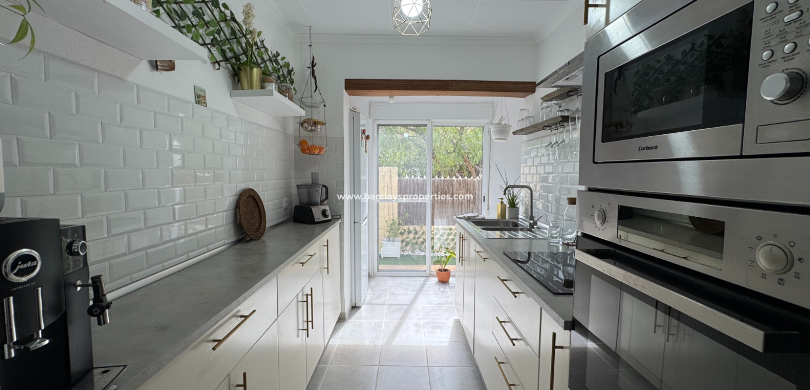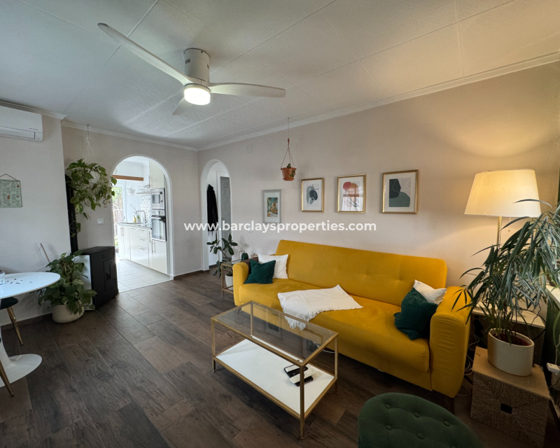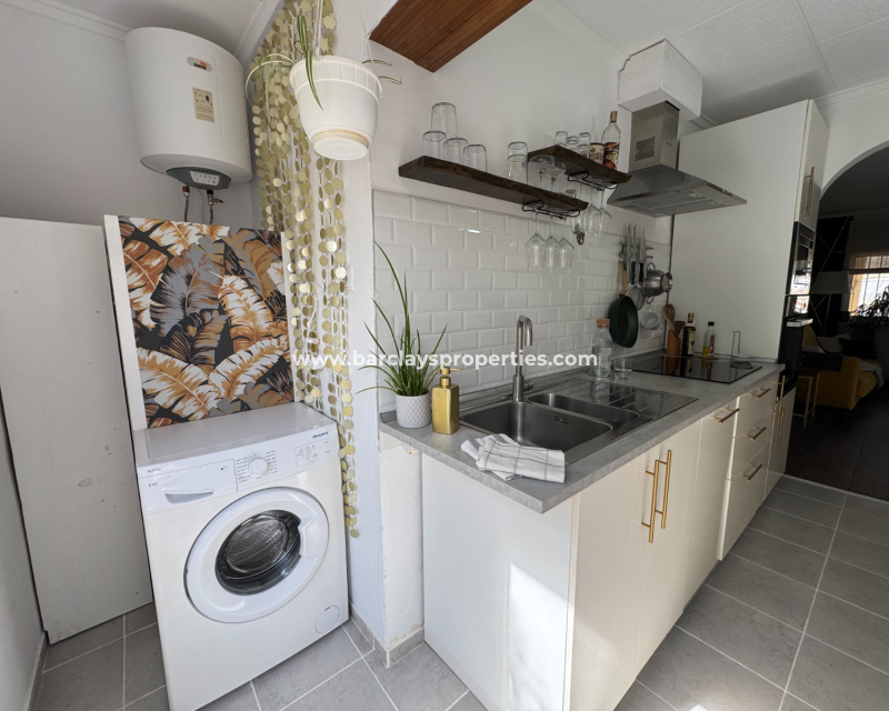 Un escalier mène au porche couvert à l’avant, qui donne accès à l’intérieur de la villa avec un salon lumineux et moderne incluant une salle à manger. La cuisine rénovée, au style contemporain, est entièrement équipée, avec une buanderie et un accès direct au jardin par des portes-fenêtres. Le couloir mène à deux chambres ainsi qu’à une salle de bains moderne récemment rénovée. Le mobilier soigné et le choix harmonieux des couleurs rendent cette villa très accueillante – parfaite pour y vivre toute l’année ou comme maison de vacances sur la Costa Blanca.