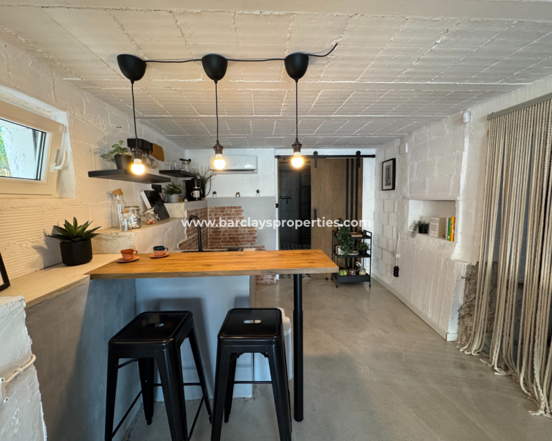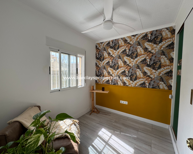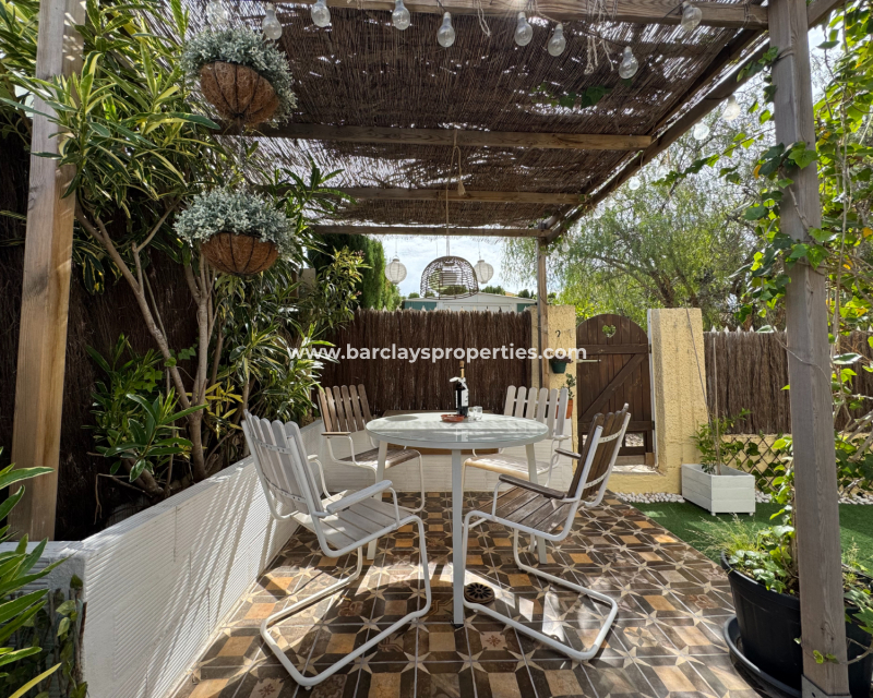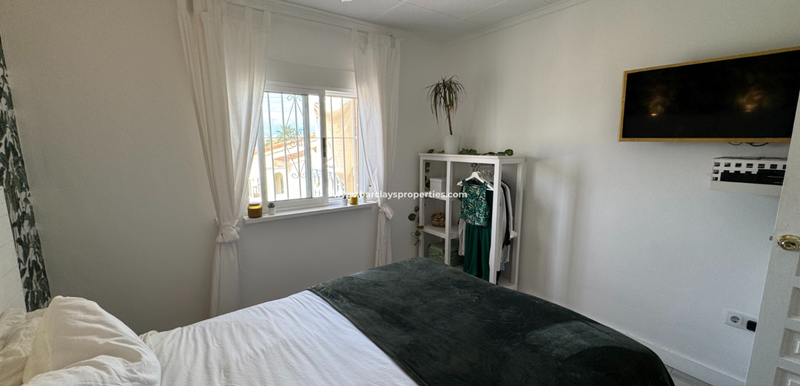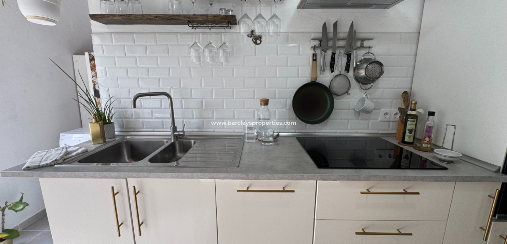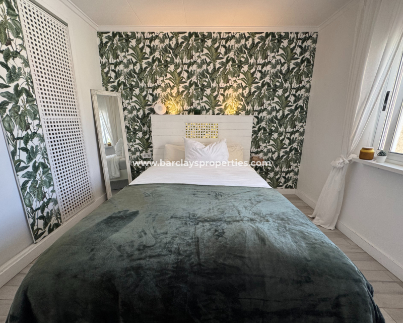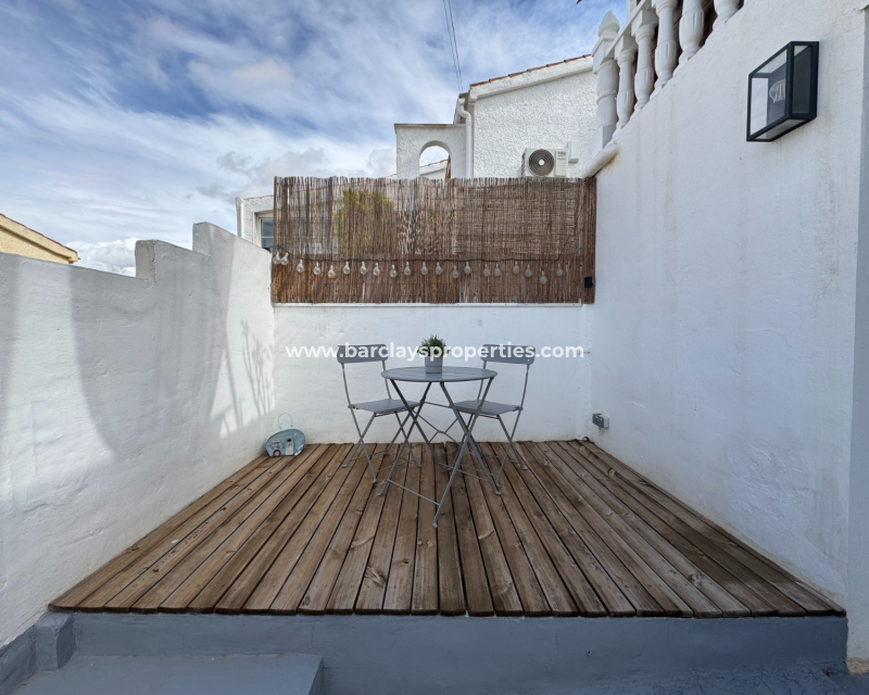 Un escalier mène au porche couvert à l’avant, qui donne accès à l’intérieur de la villa avec un salon lumineux et moderne incluant une salle à manger. La cuisine rénovée, au style contemporain, est entièrement équipée, avec une buanderie et un accès direct au jardin par des portes-fenêtres. Le couloir mène à deux chambres ainsi qu’à une salle de bains moderne récemment rénovée. Le mobilier soigné et le choix harmonieux des couleurs rendent cette villa très accueillante – parfaite pour y vivre toute l’année ou comme maison de vacances sur la Costa Blanca.
