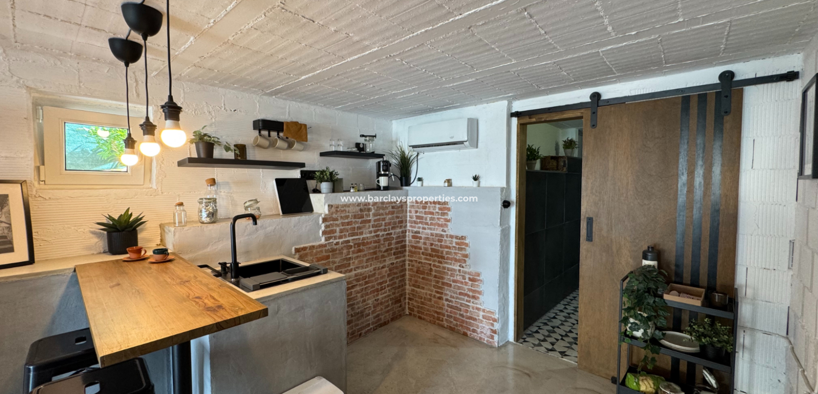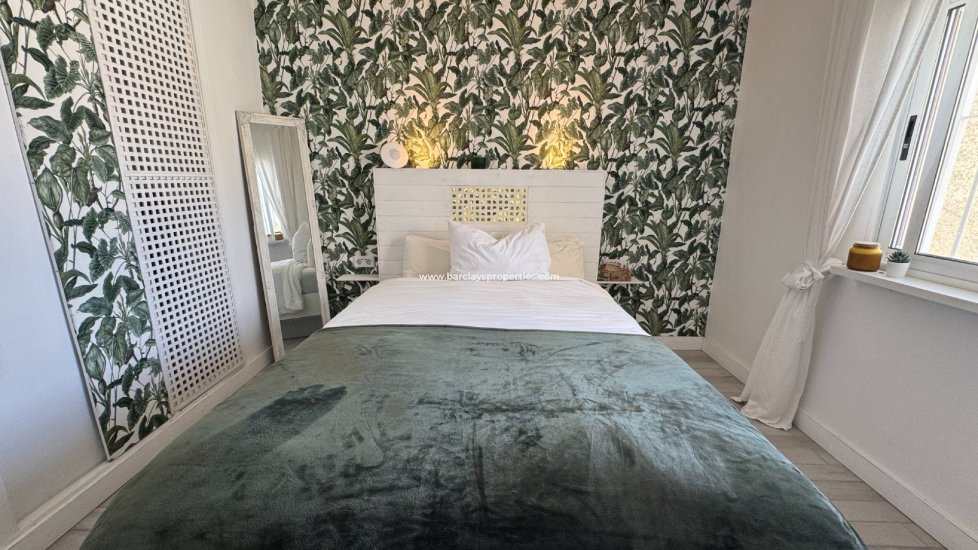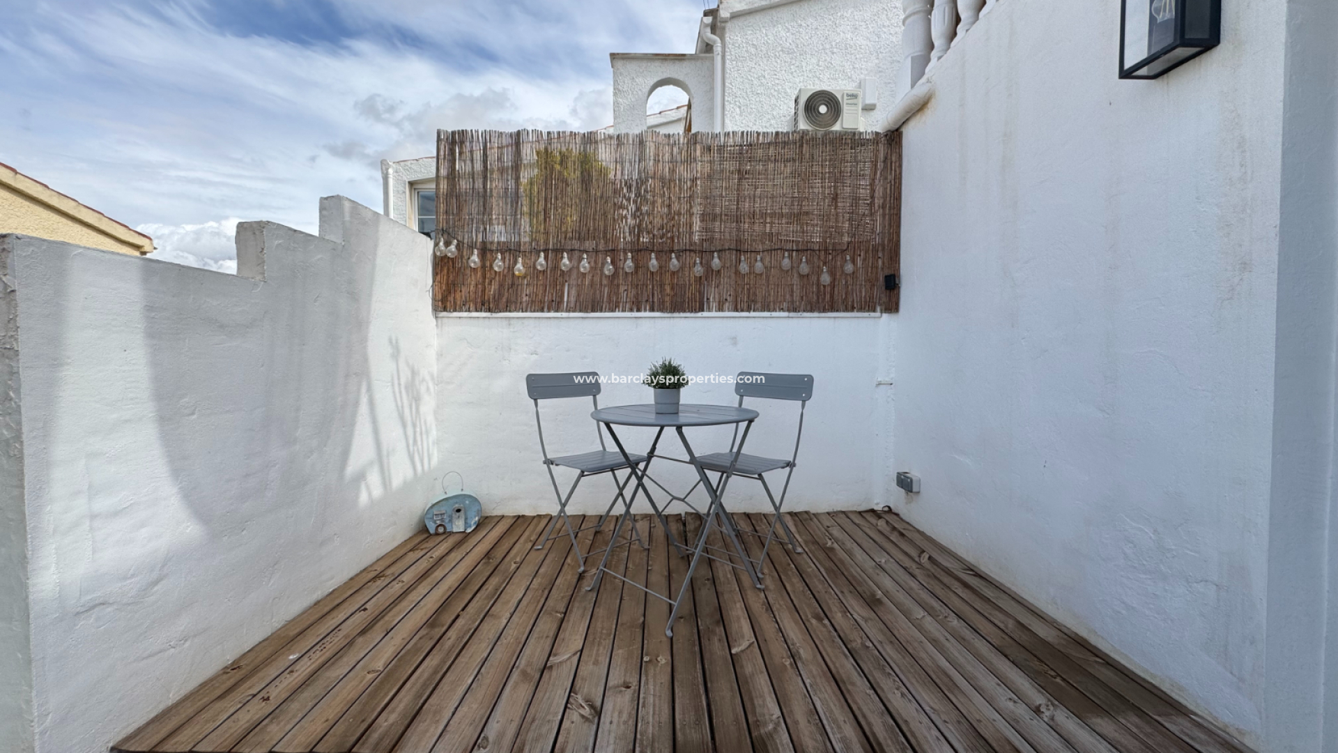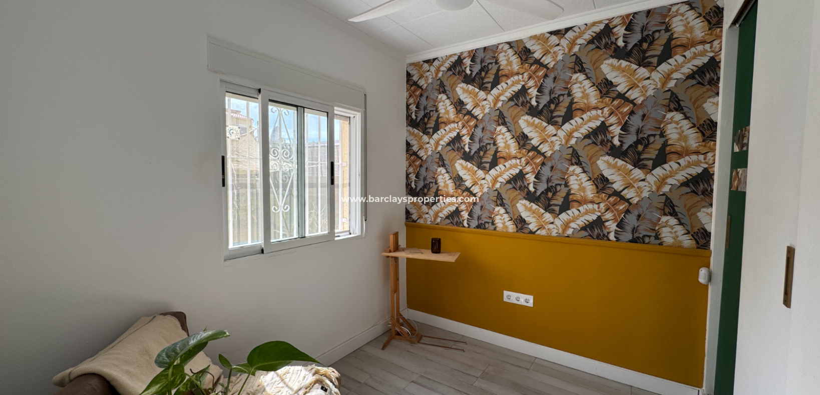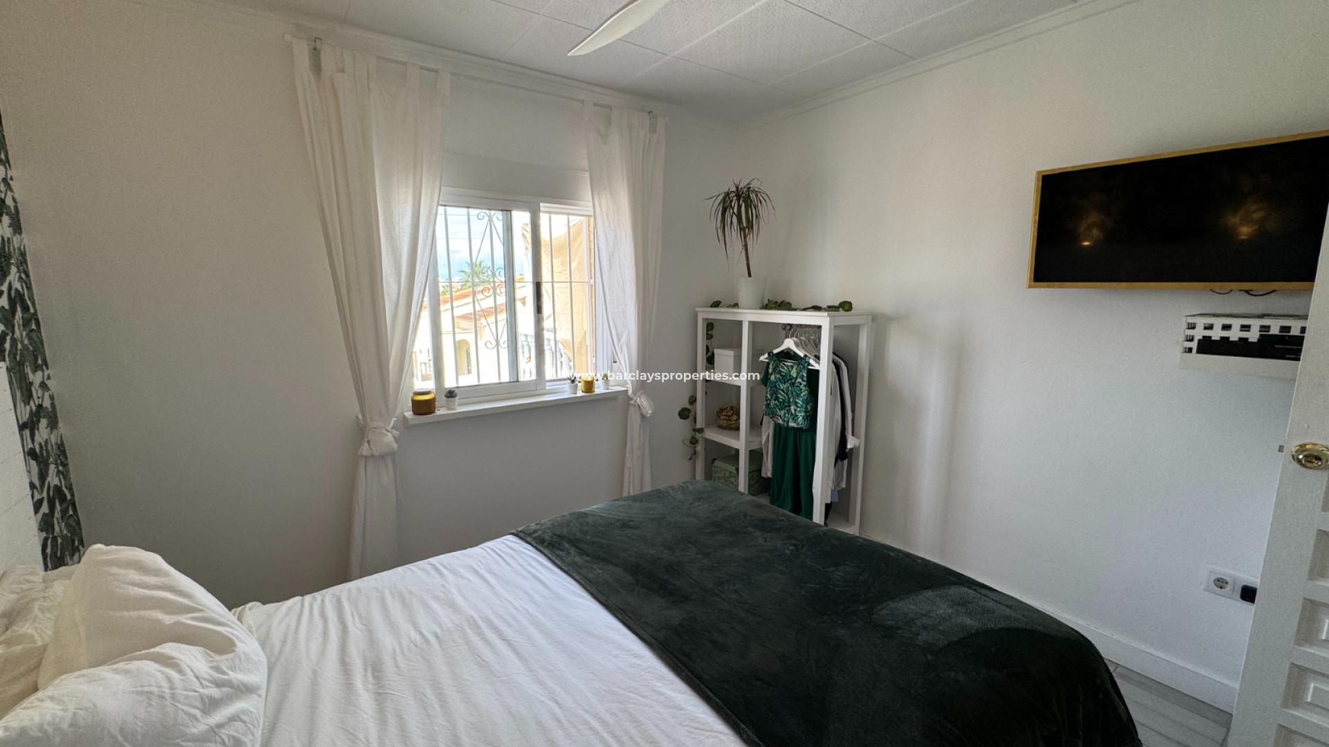 Un escalier mène au porche couvert à l’avant, qui donne accès à l’intérieur de la villa avec un salon lumineux et moderne incluant une salle à manger. La cuisine rénovée, au style contemporain, est entièrement équipée, avec une buanderie et un accès direct au jardin par des portes-fenêtres. Le couloir mène à deux chambres ainsi qu’à une salle de bains moderne récemment rénovée. Le mobilier soigné et le choix harmonieux des couleurs rendent cette villa très accueillante – parfaite pour y vivre toute l’année ou comme maison de vacances sur la Costa Blanca.