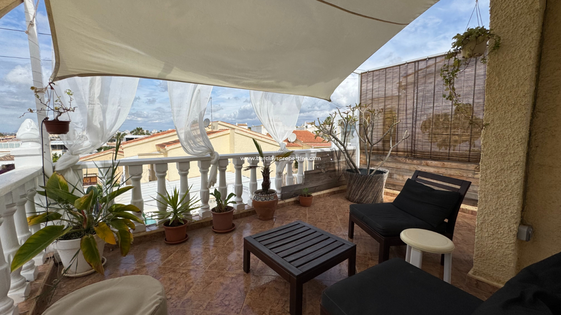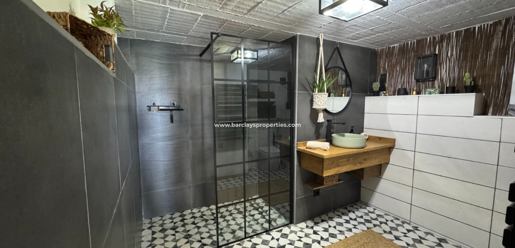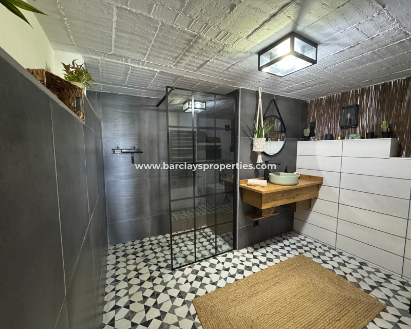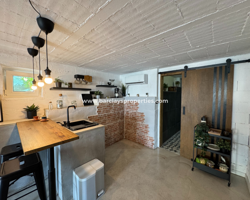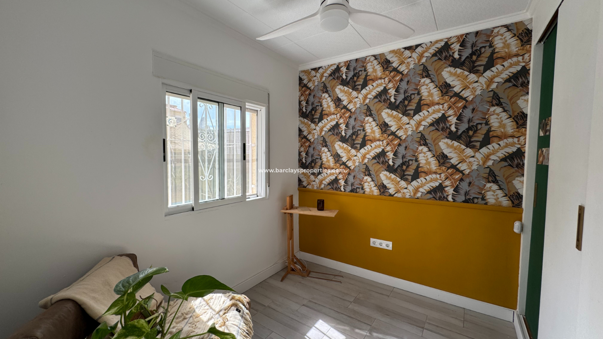 Un escalier mène au porche couvert à l’avant, qui donne accès à l’intérieur de la villa avec un salon lumineux et moderne incluant une salle à manger. La cuisine rénovée, au style contemporain, est entièrement équipée, avec une buanderie et un accès direct au jardin par des portes-fenêtres. Le couloir mène à deux chambres ainsi qu’à une salle de bains moderne récemment rénovée. Le mobilier soigné et le choix harmonieux des couleurs rendent cette villa très accueillante – parfaite pour y vivre toute l’année ou comme maison de vacances sur la Costa Blanca.