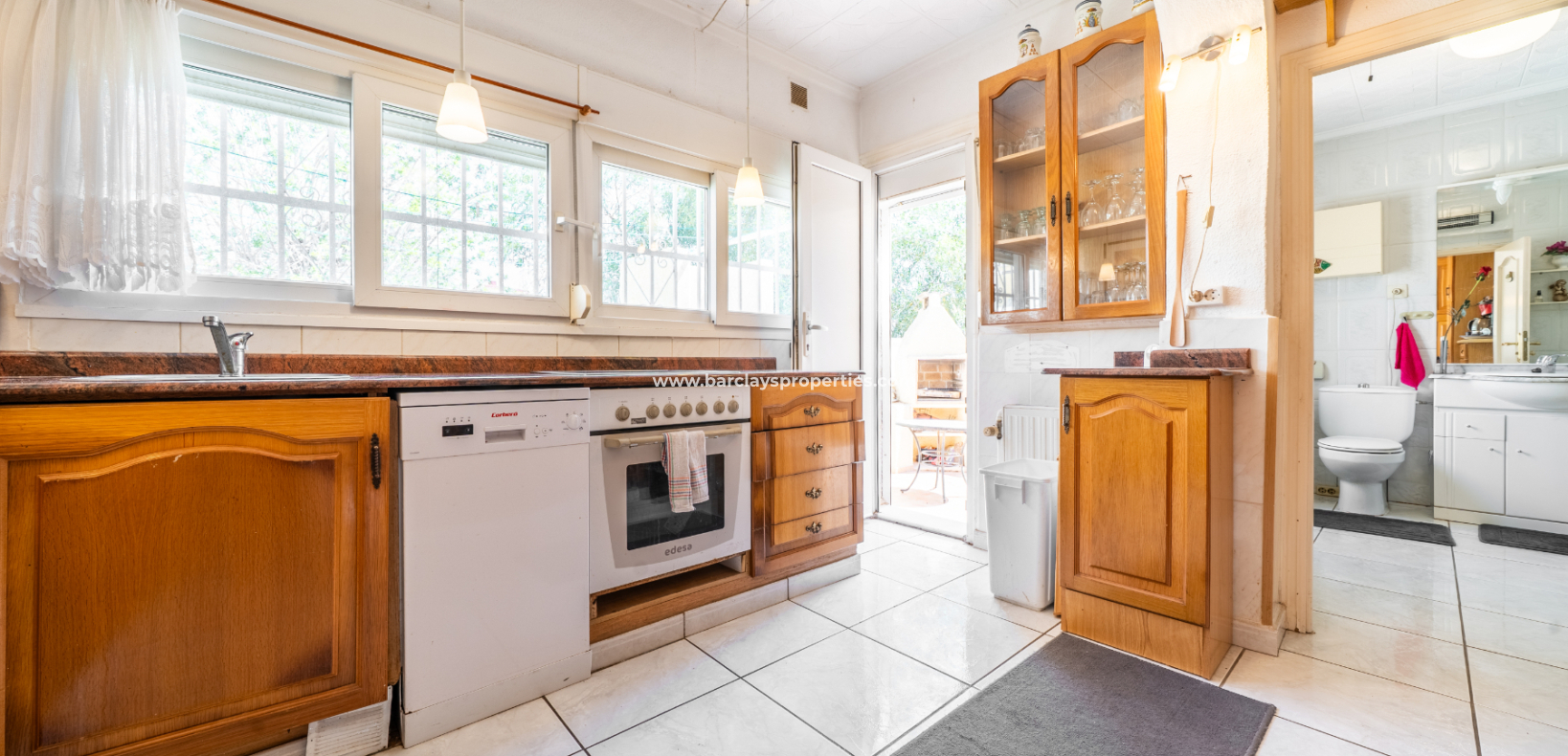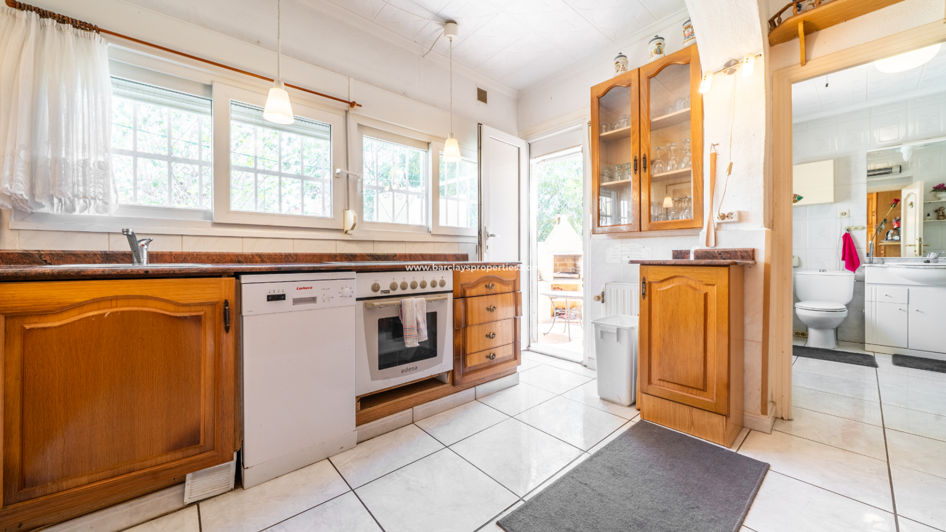 L’intérieur comprend un grand salon/salle à manger lumineux, avec climatisation et poêle à bois – un espace agréable à vivre tout au long de l’année. La cuisine, de belle taille, s’ouvre sur un coin barbecue privé à l’arrière, parfait pour les repas en plein air et les moments conviviaux.
