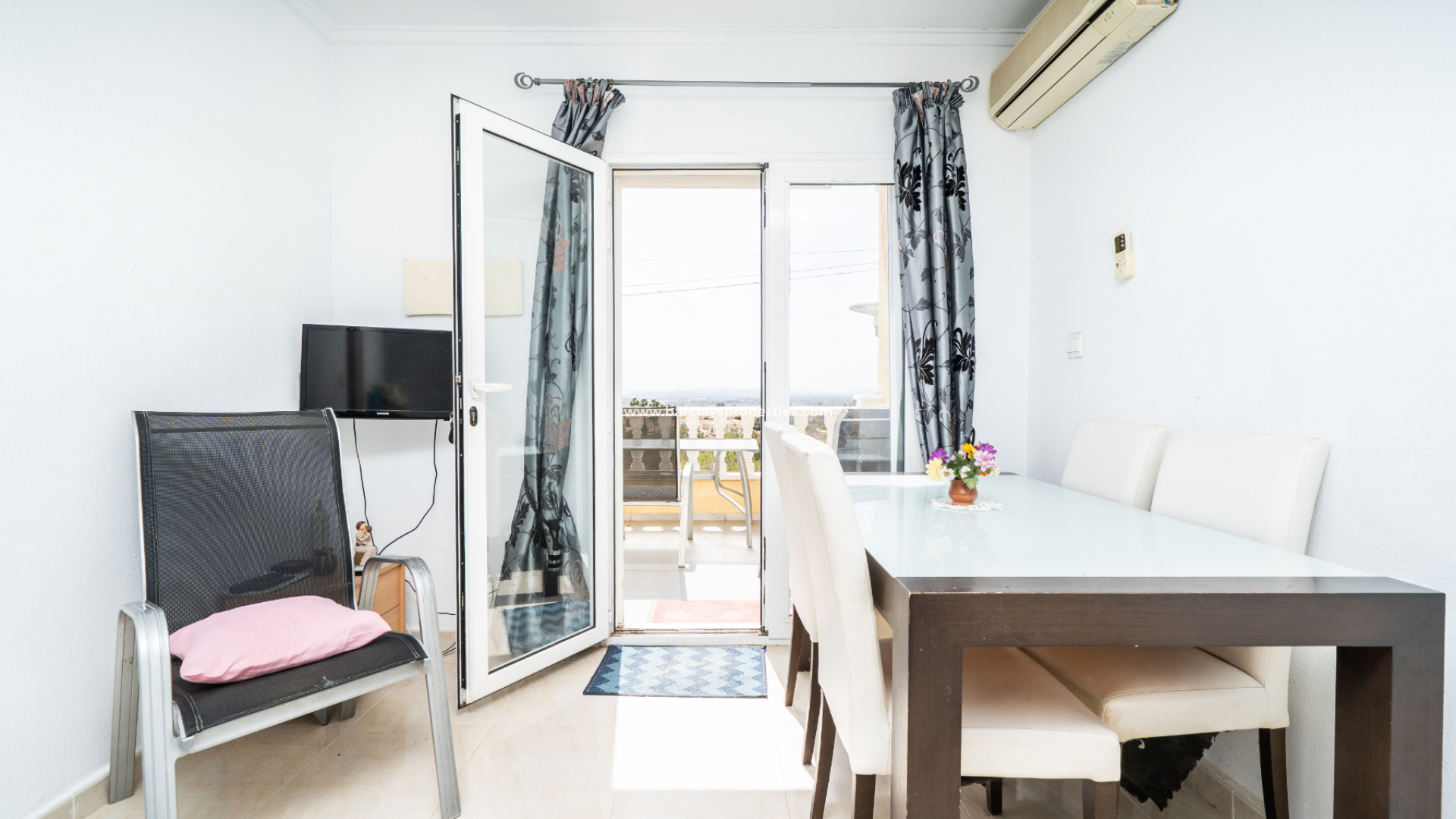 À l’intérieur, la maison s’ouvre sur une salle à manger confortable avec climatisation et de nombreux rangements intégrés. Le rez-de-chaussée comprend également une cuisine indépendante entièrement équipée, une chambre double avec climatisation, placards intégrés et ventilateur de plafond, ainsi qu’une salle de bains avec douche d’angle et meuble vasque.