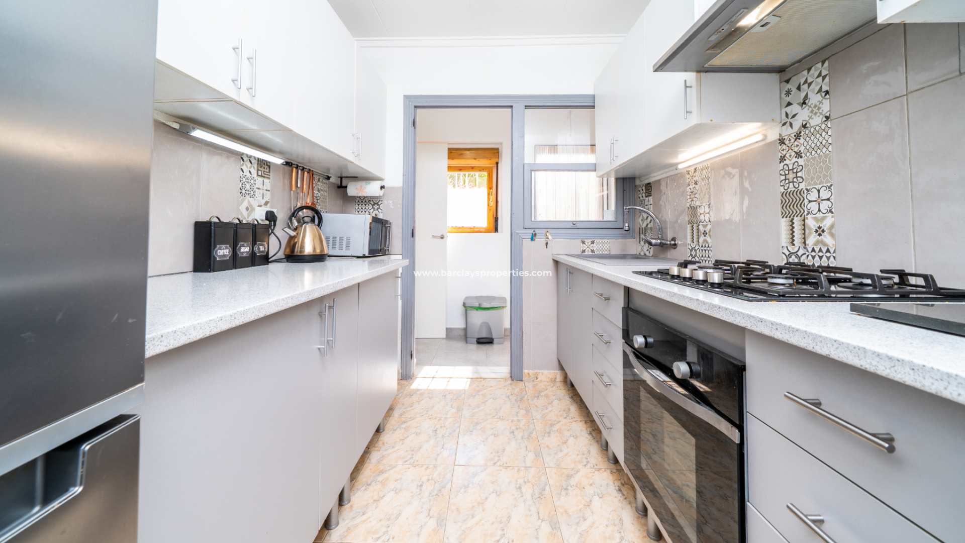 La propriété s’ouvre sur une véranda vitrée qui mène à un salon spacieux et lumineux, équipé de ventilateurs de plafond et de la climatisation – un espace accueillant, parfait pour se détendre ou recevoir. La cuisine, récemment rénovée, dispose d’éléments contemporains, d’une plaque de cuisson au gaz et d’une buanderie séparée, alliant style et fonctionnalité.
