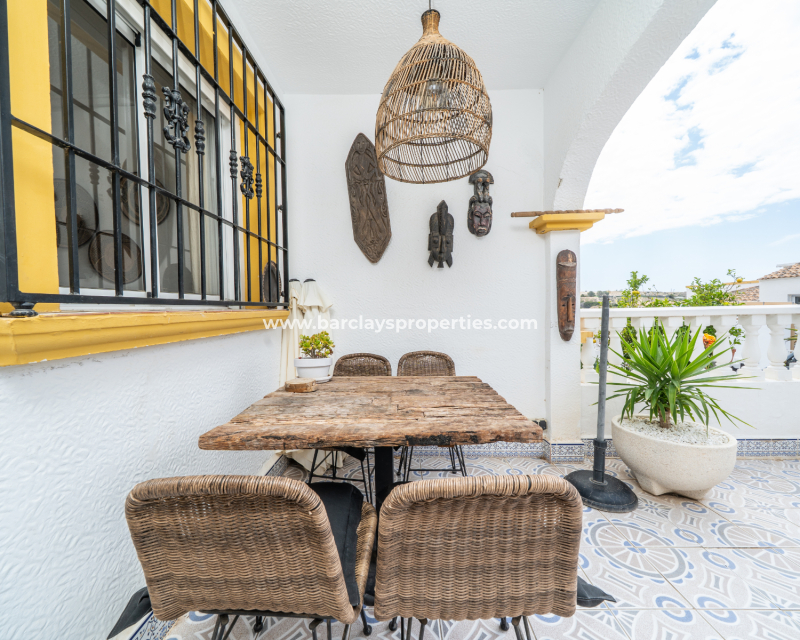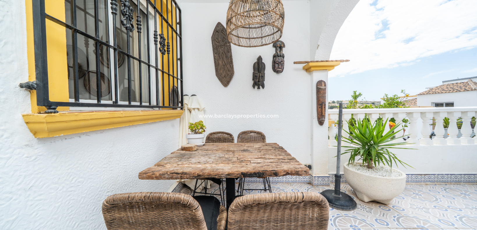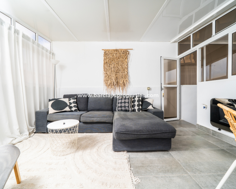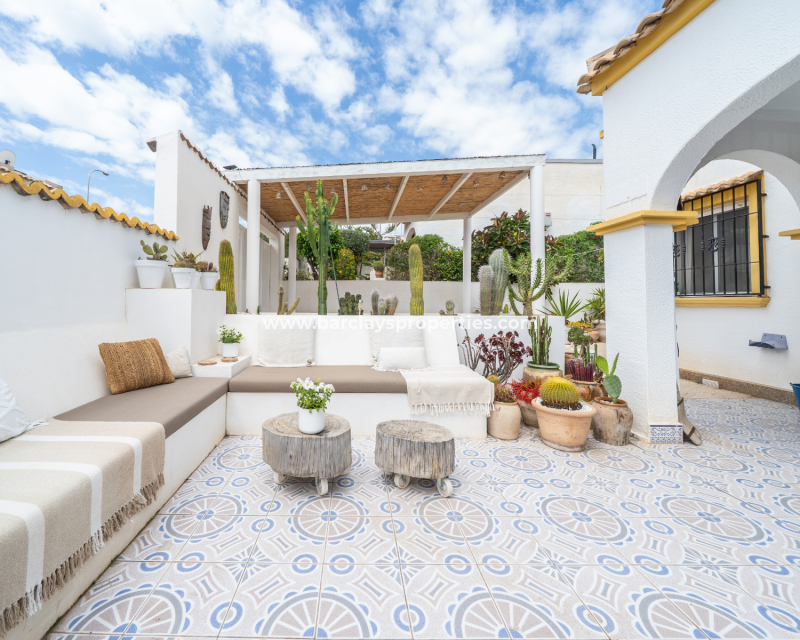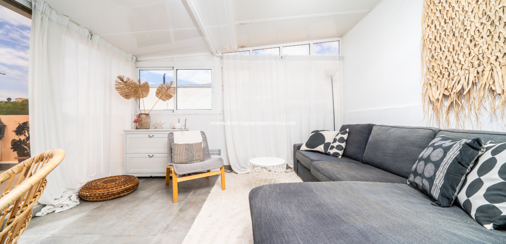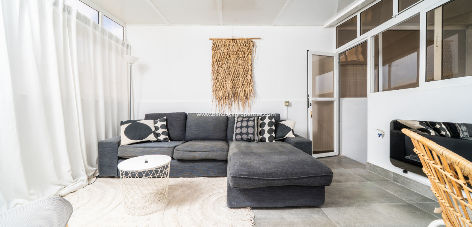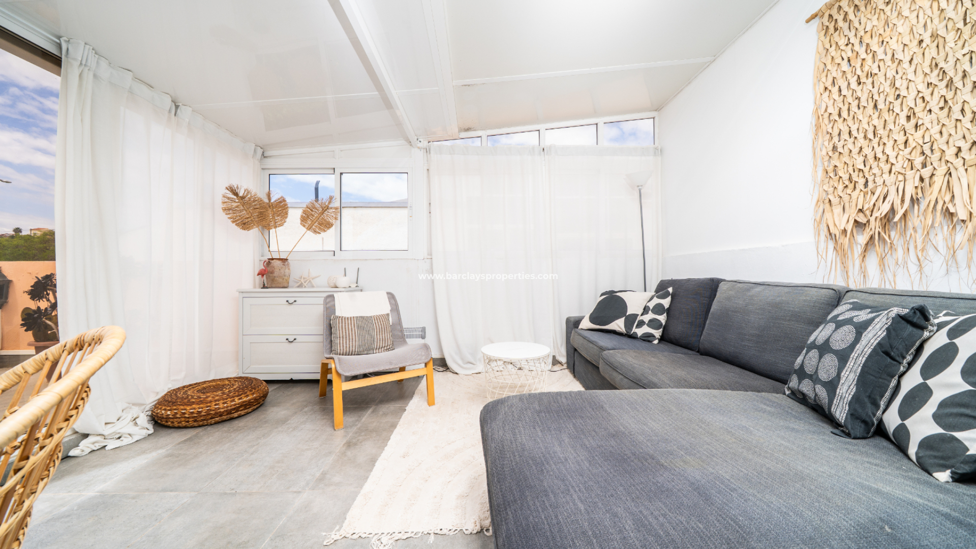 L’un des grands atouts de cette maison est la véranda spacieuse, qui a été agrandie pour offrir un espace de vie supplémentaire lumineux – idéal pour les repas, la détente ou recevoir des invités. Le solarium a été récemment carrelé et comprend un espace de rangement supplémentaire, avec une vue dégagée vers la ville voisine de Guardamar del Segura.