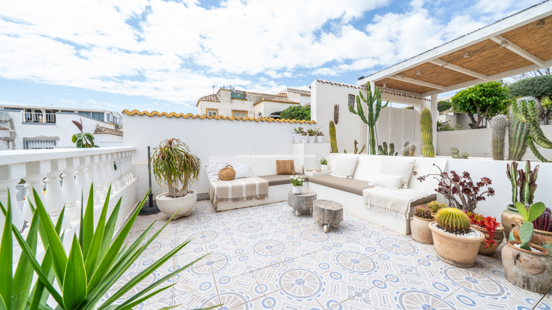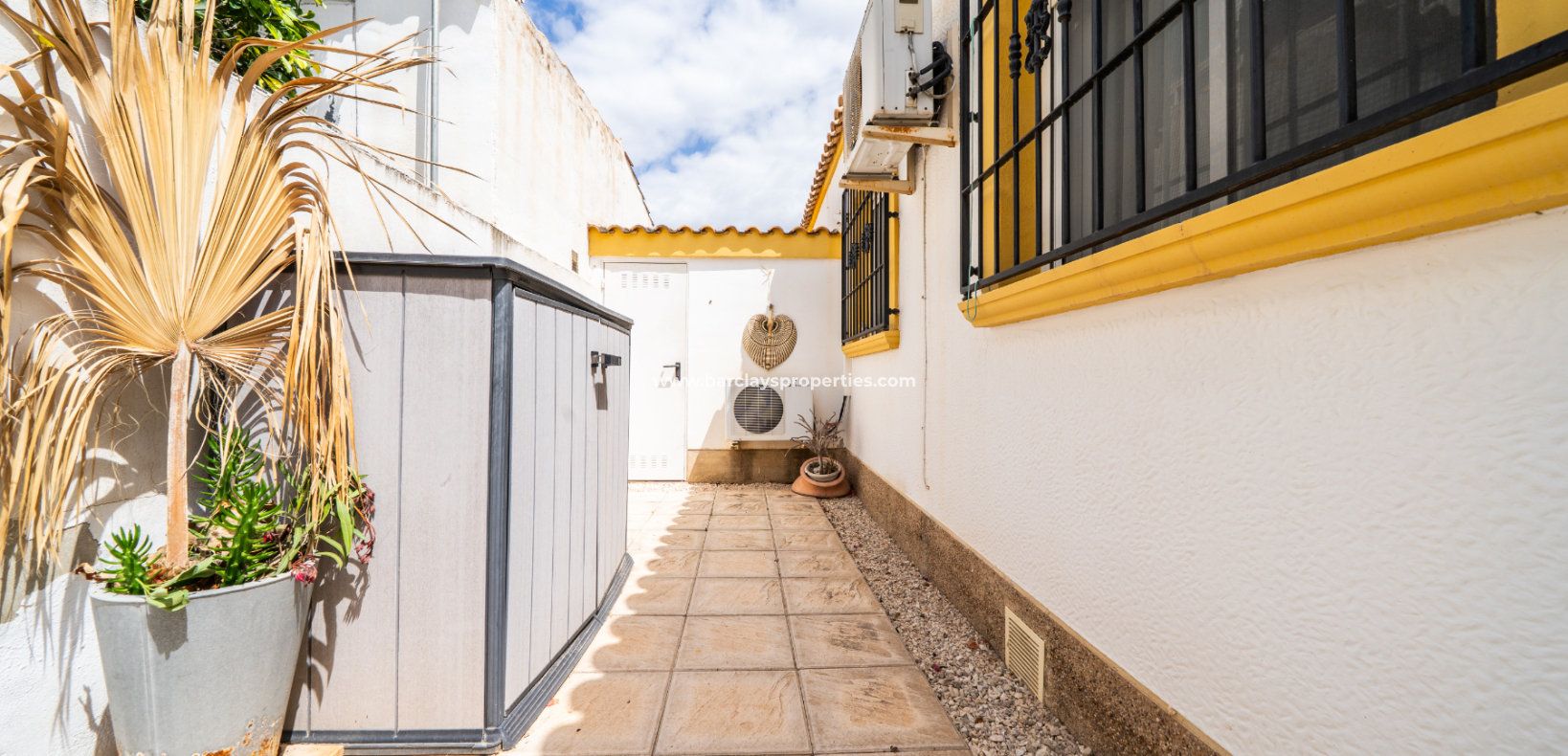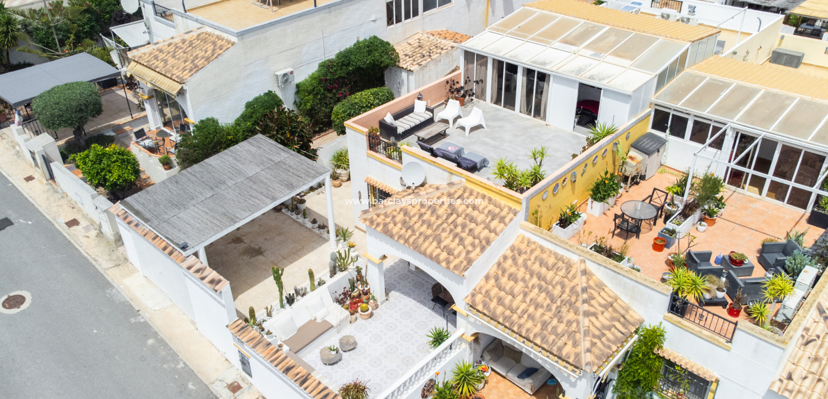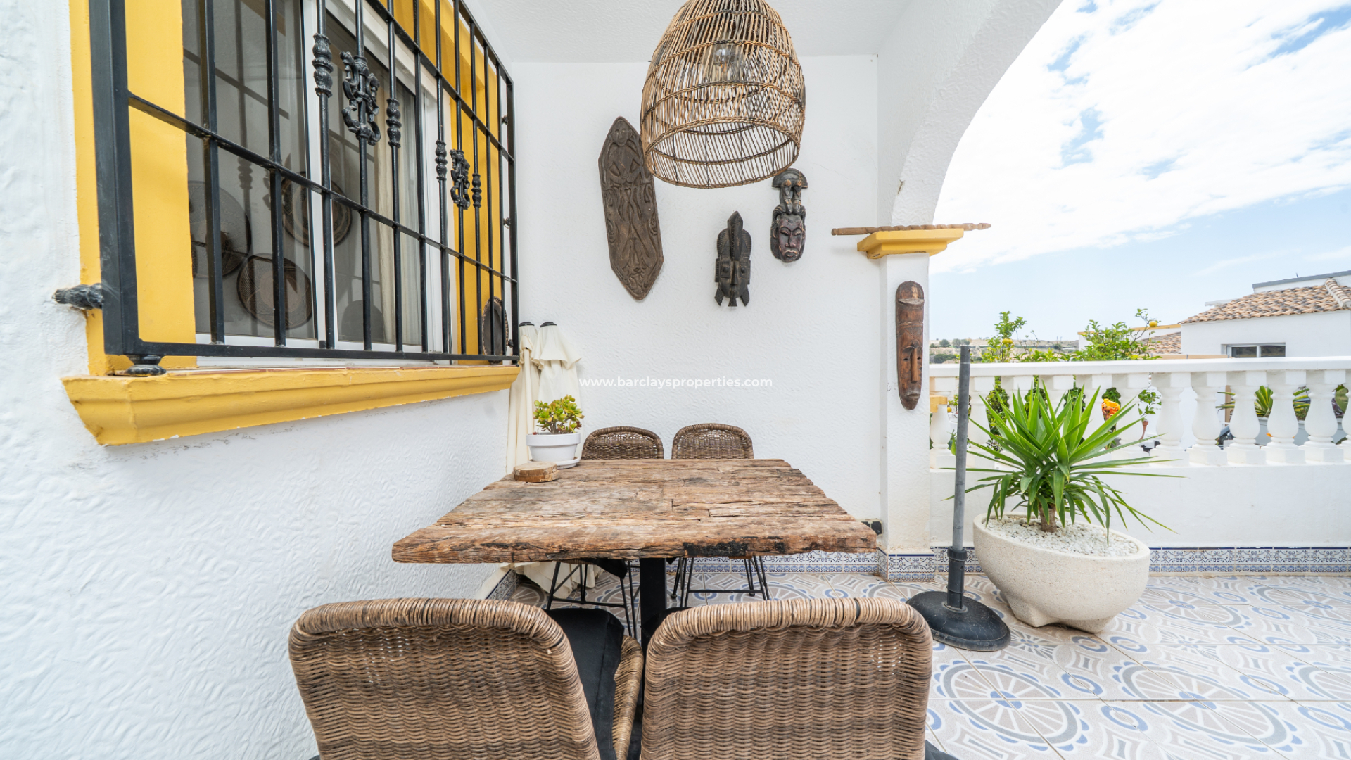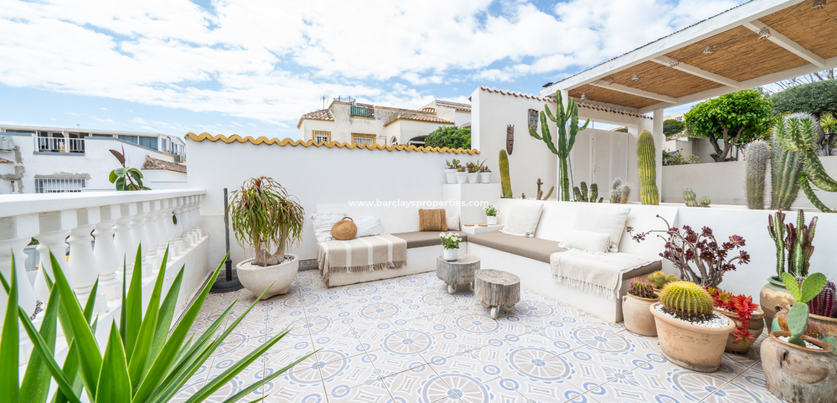 L’un des grands atouts de cette maison est la véranda spacieuse, qui a été agrandie pour offrir un espace de vie supplémentaire lumineux – idéal pour les repas, la détente ou recevoir des invités. Le solarium a été récemment carrelé et comprend un espace de rangement supplémentaire, avec une vue dégagée vers la ville voisine de Guardamar del Segura.
