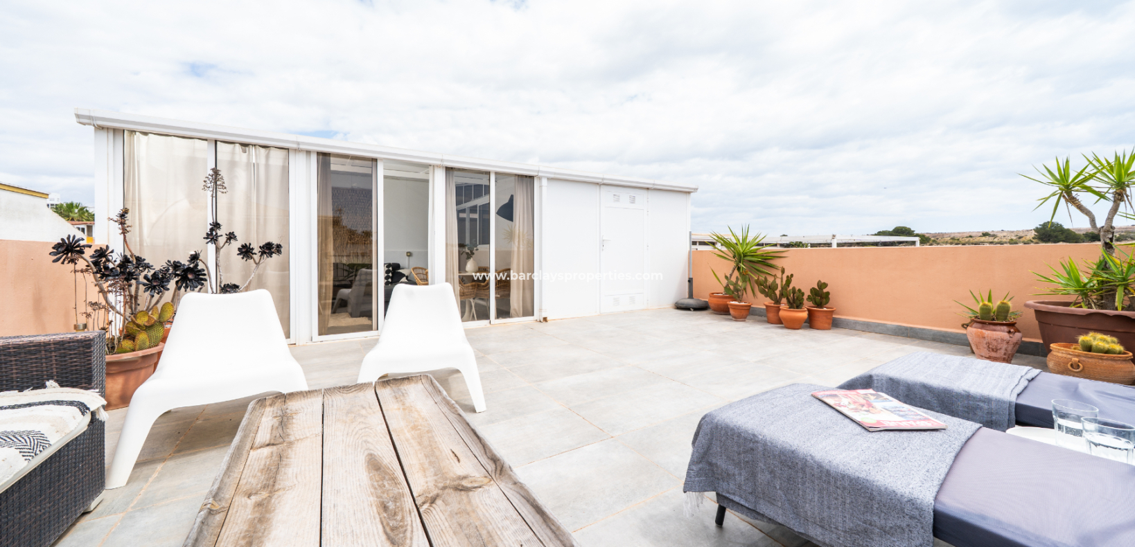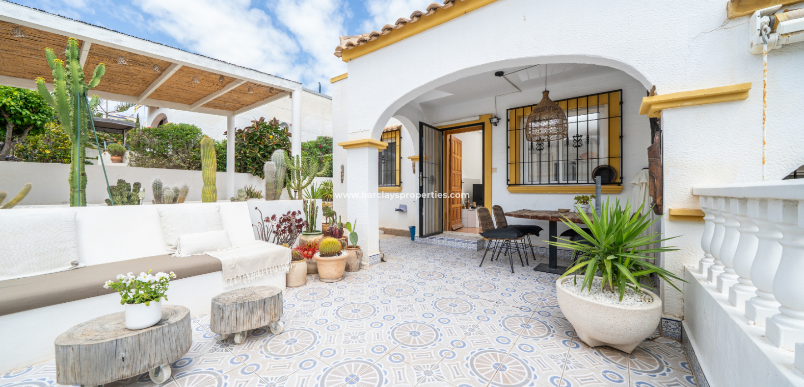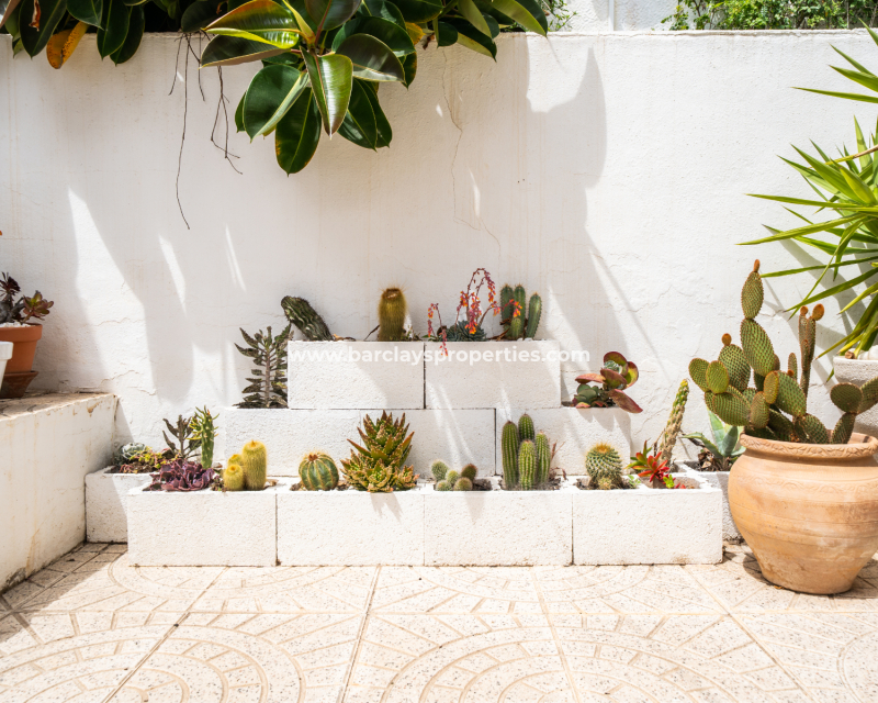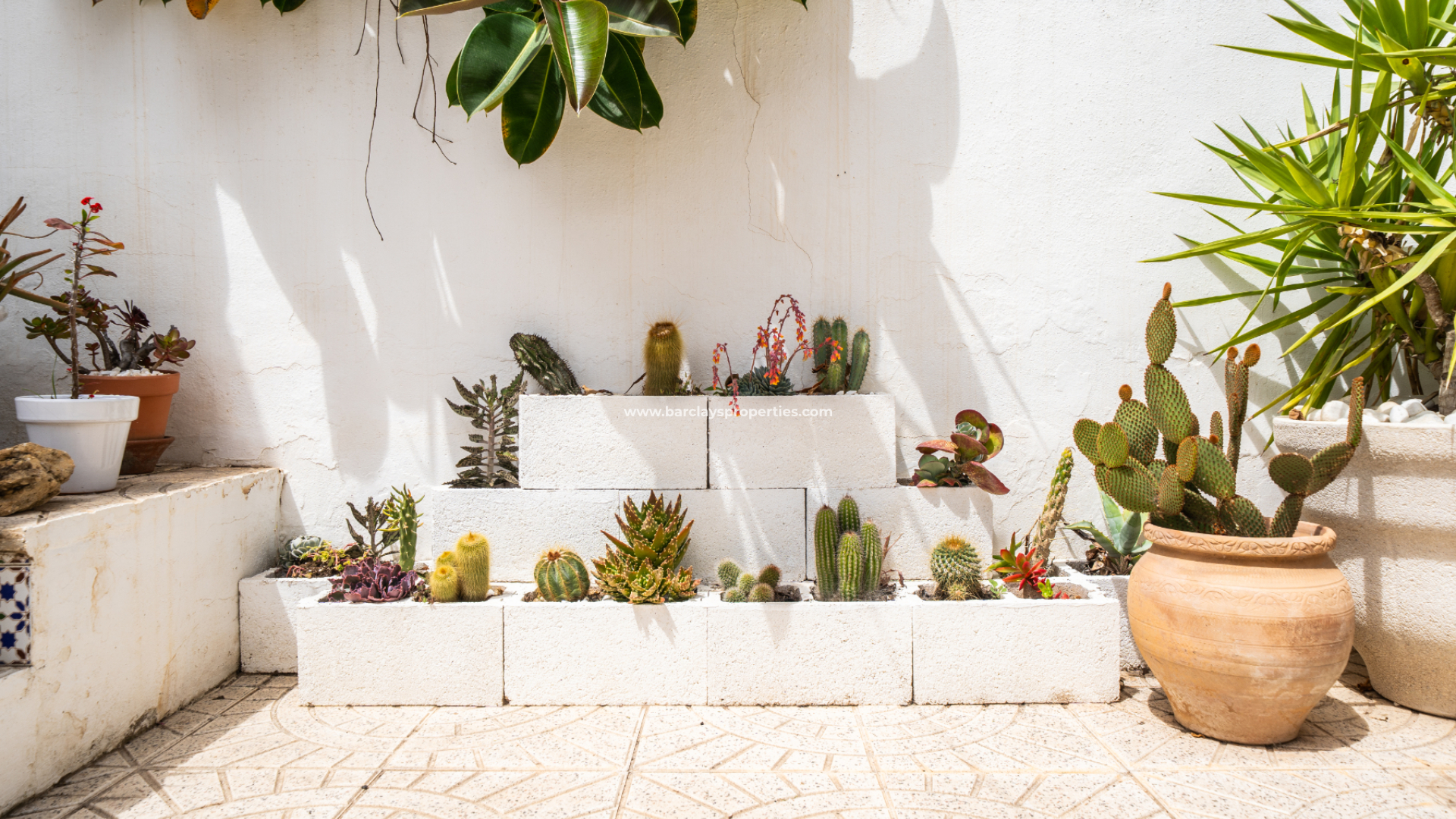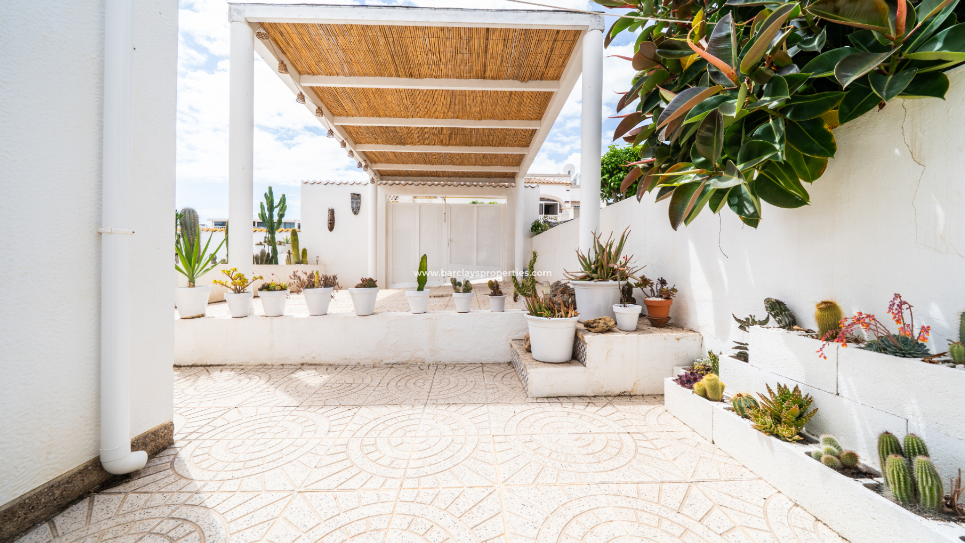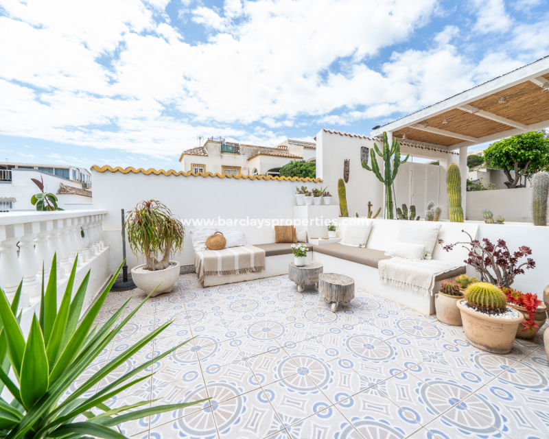 L’un des grands atouts de cette maison est la véranda spacieuse, qui a été agrandie pour offrir un espace de vie supplémentaire lumineux – idéal pour les repas, la détente ou recevoir des invités. Le solarium a été récemment carrelé et comprend un espace de rangement supplémentaire, avec une vue dégagée vers la ville voisine de Guardamar del Segura.