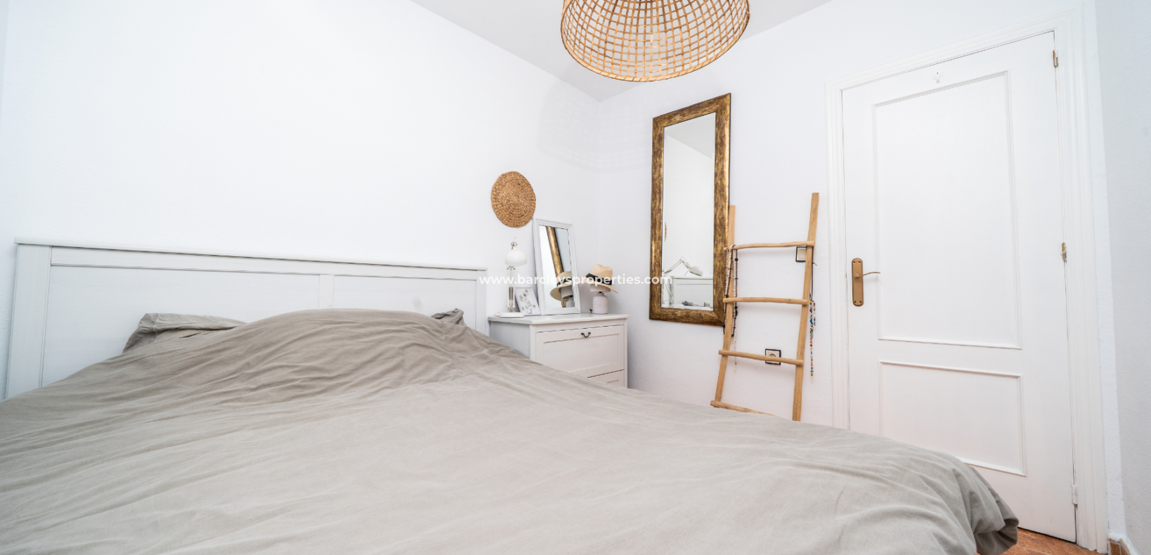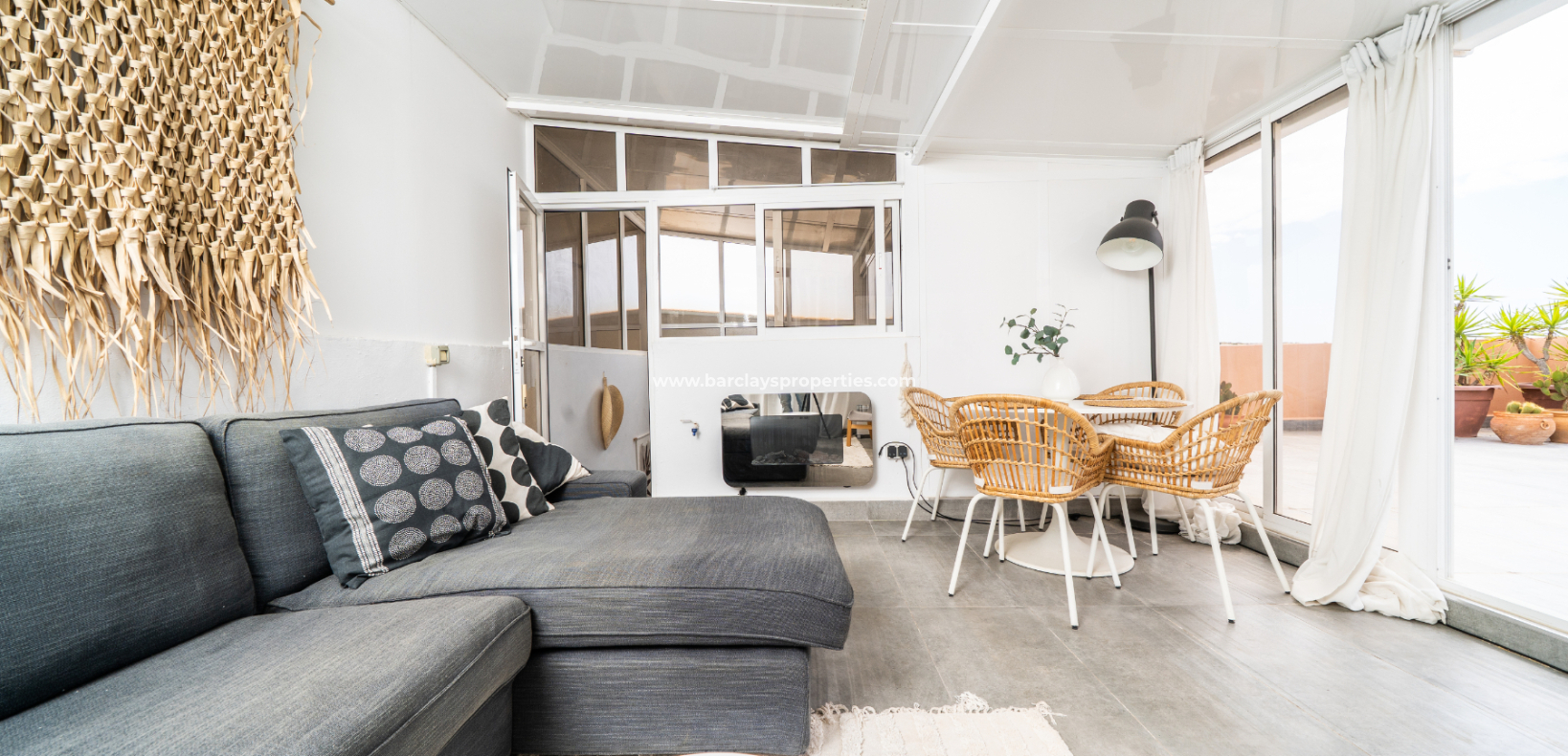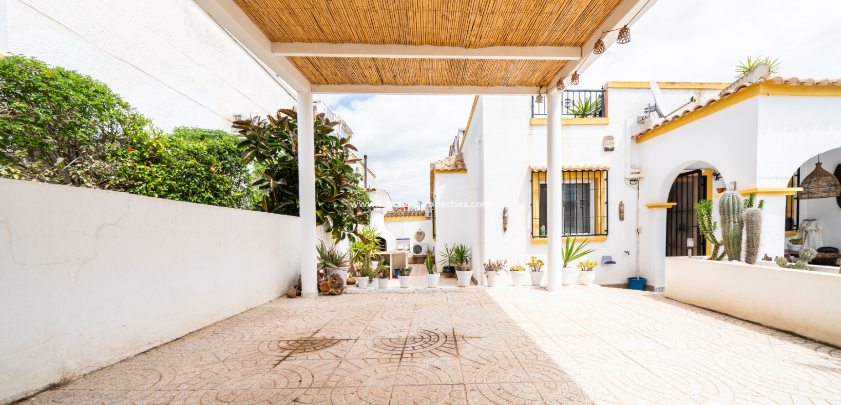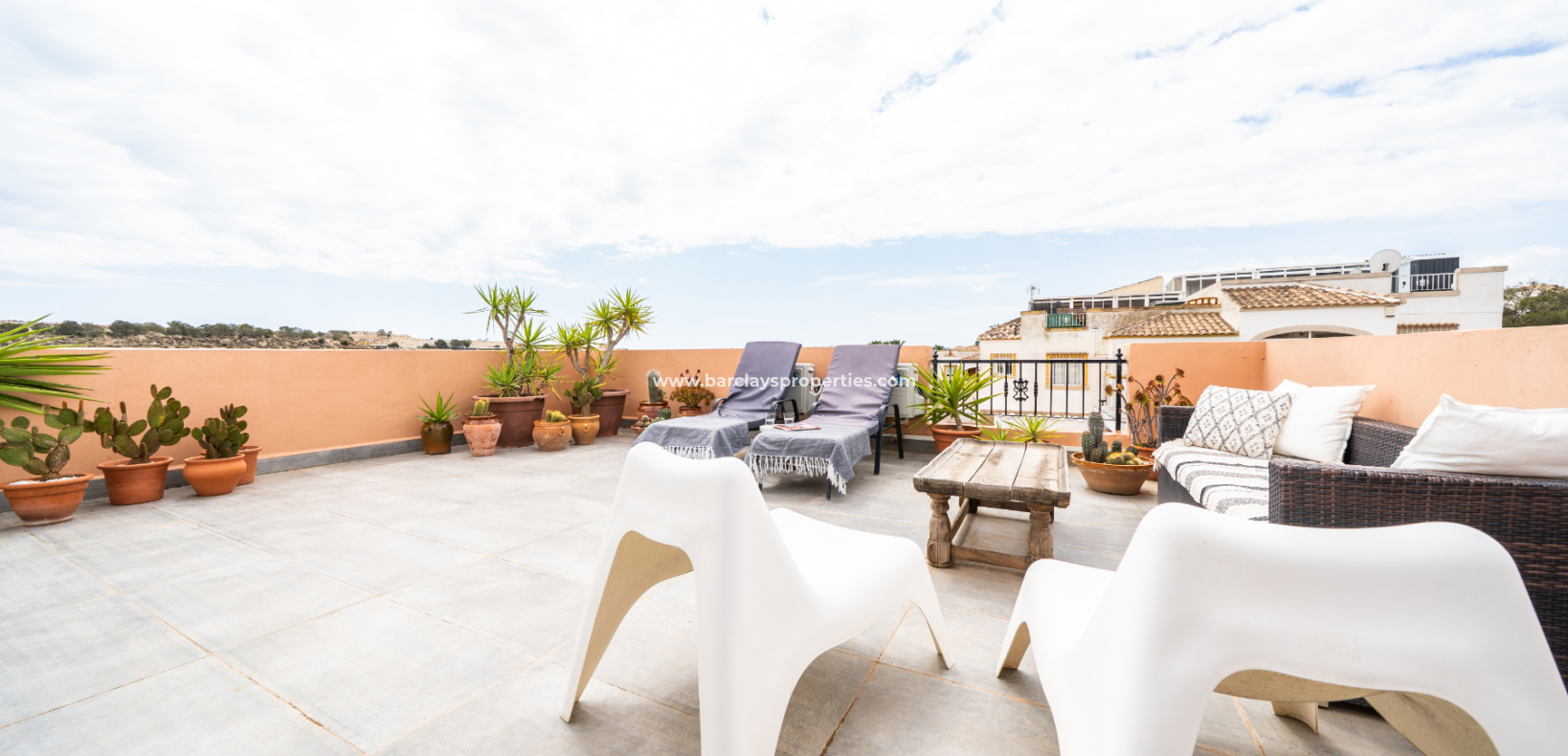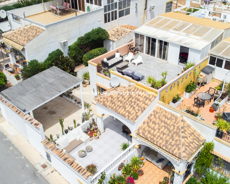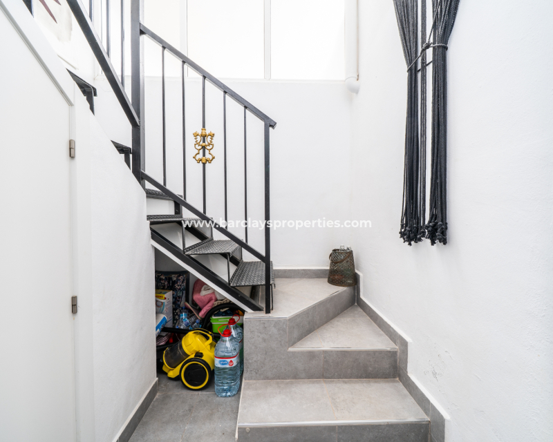 L’un des grands atouts de cette maison est la véranda spacieuse, qui a été agrandie pour offrir un espace de vie supplémentaire lumineux – idéal pour les repas, la détente ou recevoir des invités. Le solarium a été récemment carrelé et comprend un espace de rangement supplémentaire, avec une vue dégagée vers la ville voisine de Guardamar del Segura.