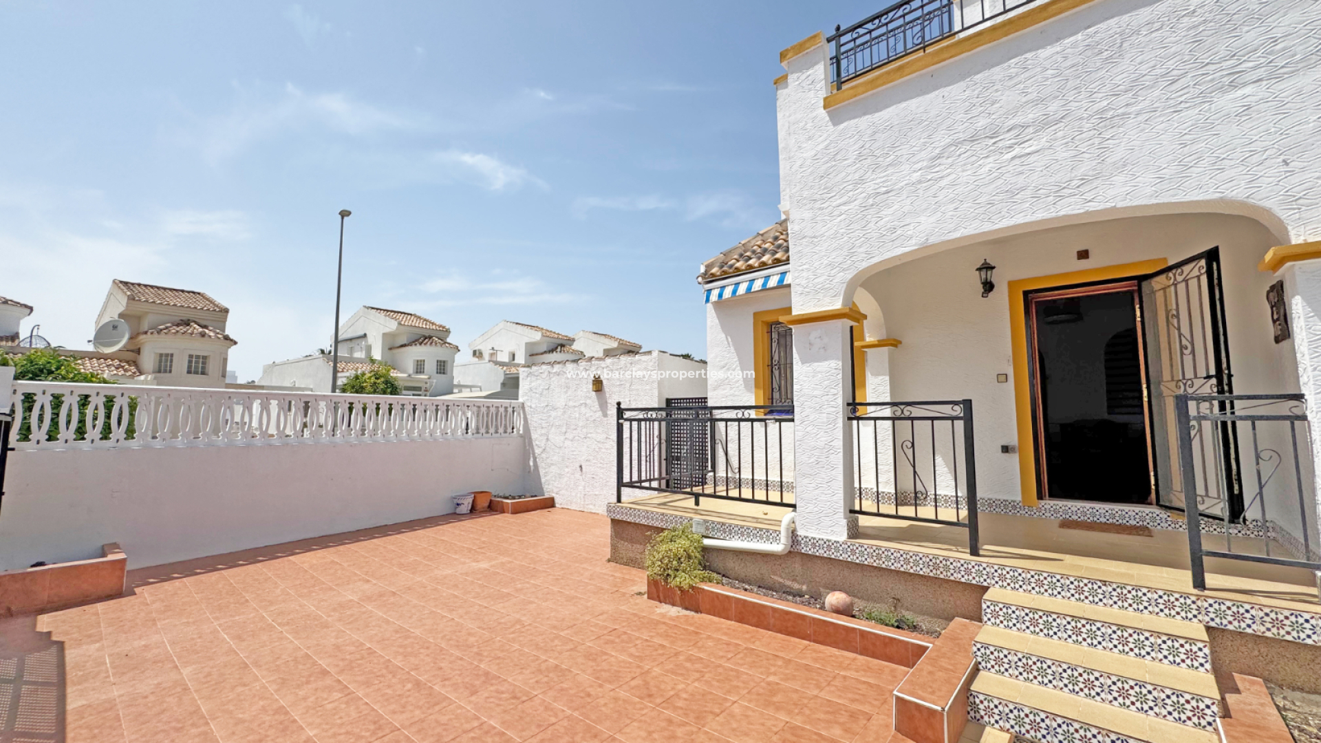 Cette villa de style quad, bien entretenue, est idéalement située sur une parcelle d’angle recherchée et dispose d’un jardin entièrement carrelé, parfait pour une vie en extérieur nécessitant peu d’entretien. Une terrasse avant agrandie avec un store rétractable offre un espace idéal pour les repas ou la détente à l’ombre. Un grand abri de rangement avec fenêtre, une douche extérieure ainsi qu’un espace buanderie équipé d’un lave-linge, d’un sèche-linge et d’une chaudière à gaz apportent un confort supplémentaire au quotidien.