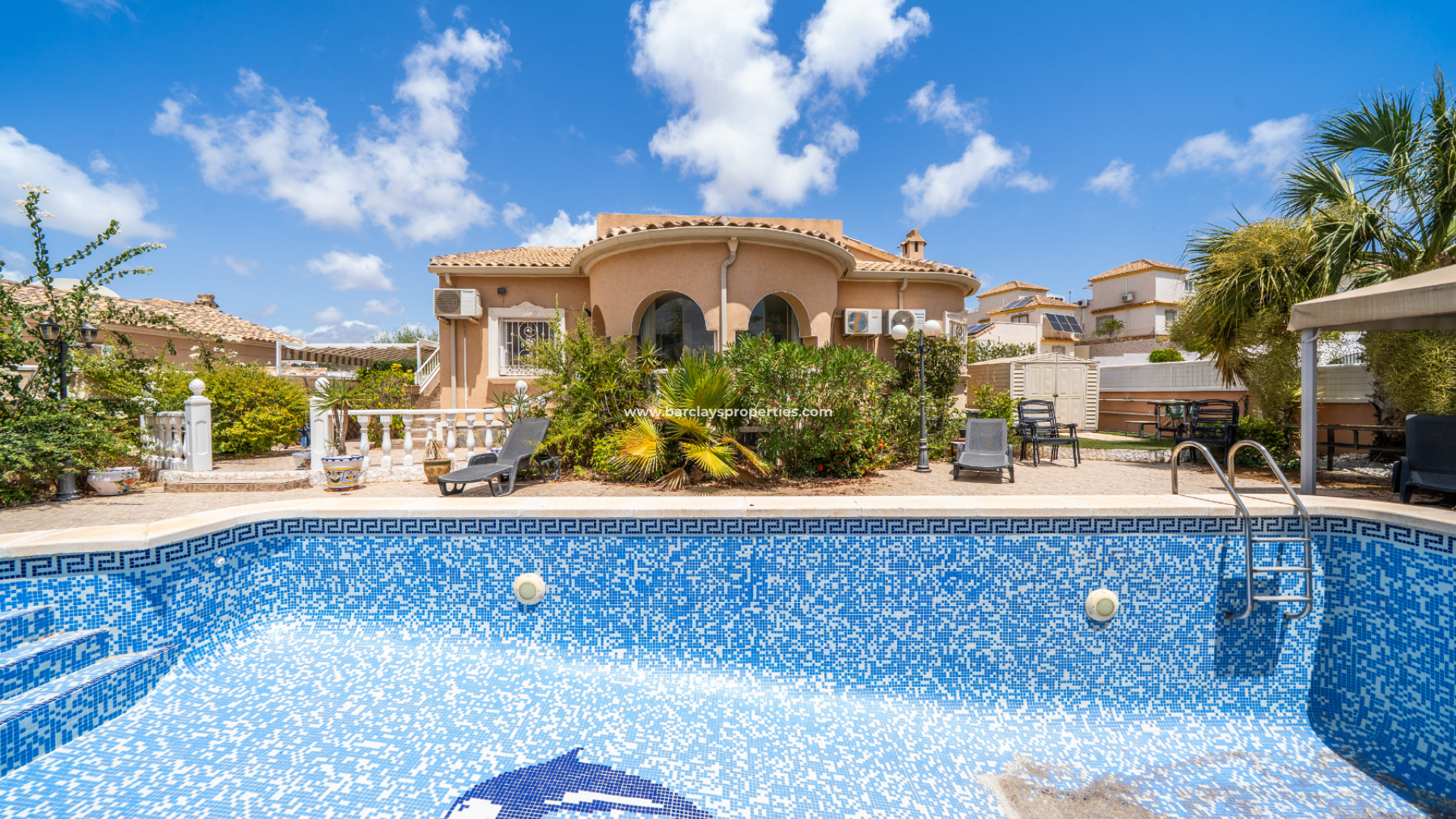 Nous avons le plaisir de vous présenter cette magnifique villa individuelle à vendre dans l'urbanisation très prisée de La Marina. Cette spacieuse propriété de ➡️ plain-pied est située sur un généreux terrain de 503 m² et offre 156 m² de surface habitable construite. La villa comprend trois chambres lumineuses et confortables de bonne taille, deux salles de bains (dont une en suite avec douche mur à mur), ➡️ une cuisine semi-ouverte entièrement équipée d'électroménager, et un salon accueillant avec accès direct à une terrasse vitrée couverte qui donne sur ➡️ la piscine privée de 35 m² et le jardin paysager.
