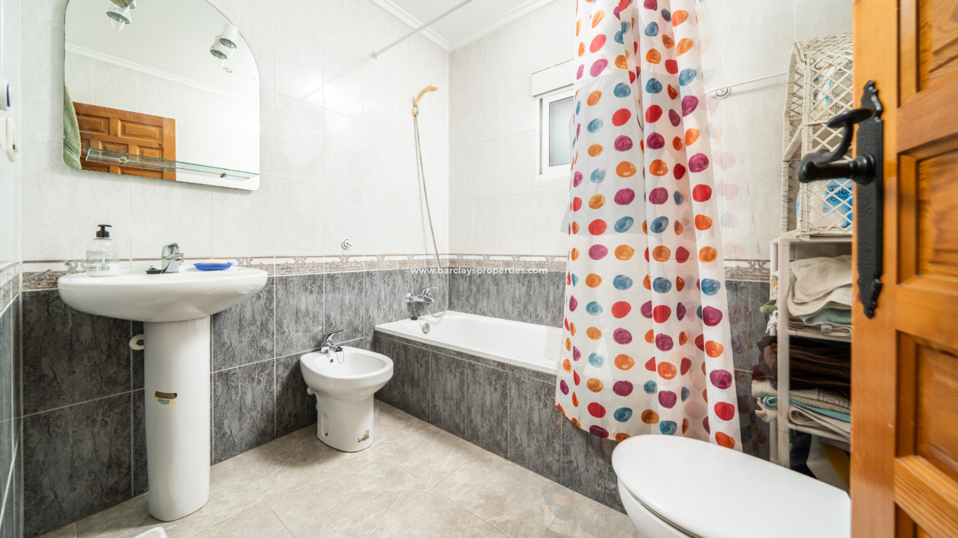 Depuis le couloir, on accède à une grande salle de bains familiale avec baignoire, bidet, WC et lavabo, ainsi qu’à trois autres chambres (dont la principale équipée d’un ventilateur de plafond). Une porte mène à un balcon privé où vous pourrez profiter du soleil et des vues dégagées sur l’urbanisation et la campagne environnante.