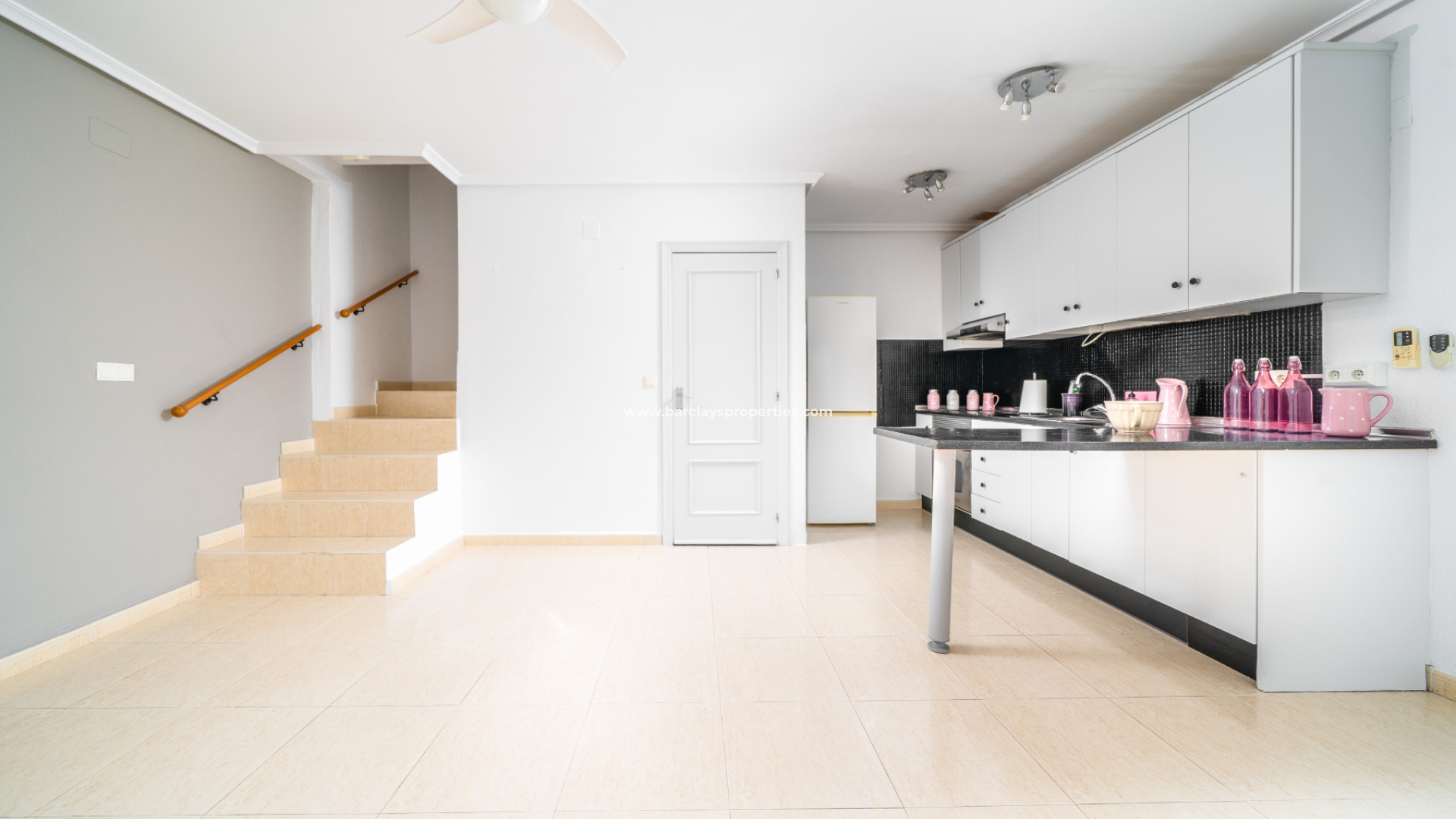 Une terrasse ensoleillée mène à l’intérieur de la propriété, comprenant un salon lumineux et spacieux avec climatisation, ventilateur de plafond et un placard de rangement pratique. La cuisine récemment rénovée est bien agencée et dispose d’un bar pour le petit-déjeuner, optimisant l’espace.