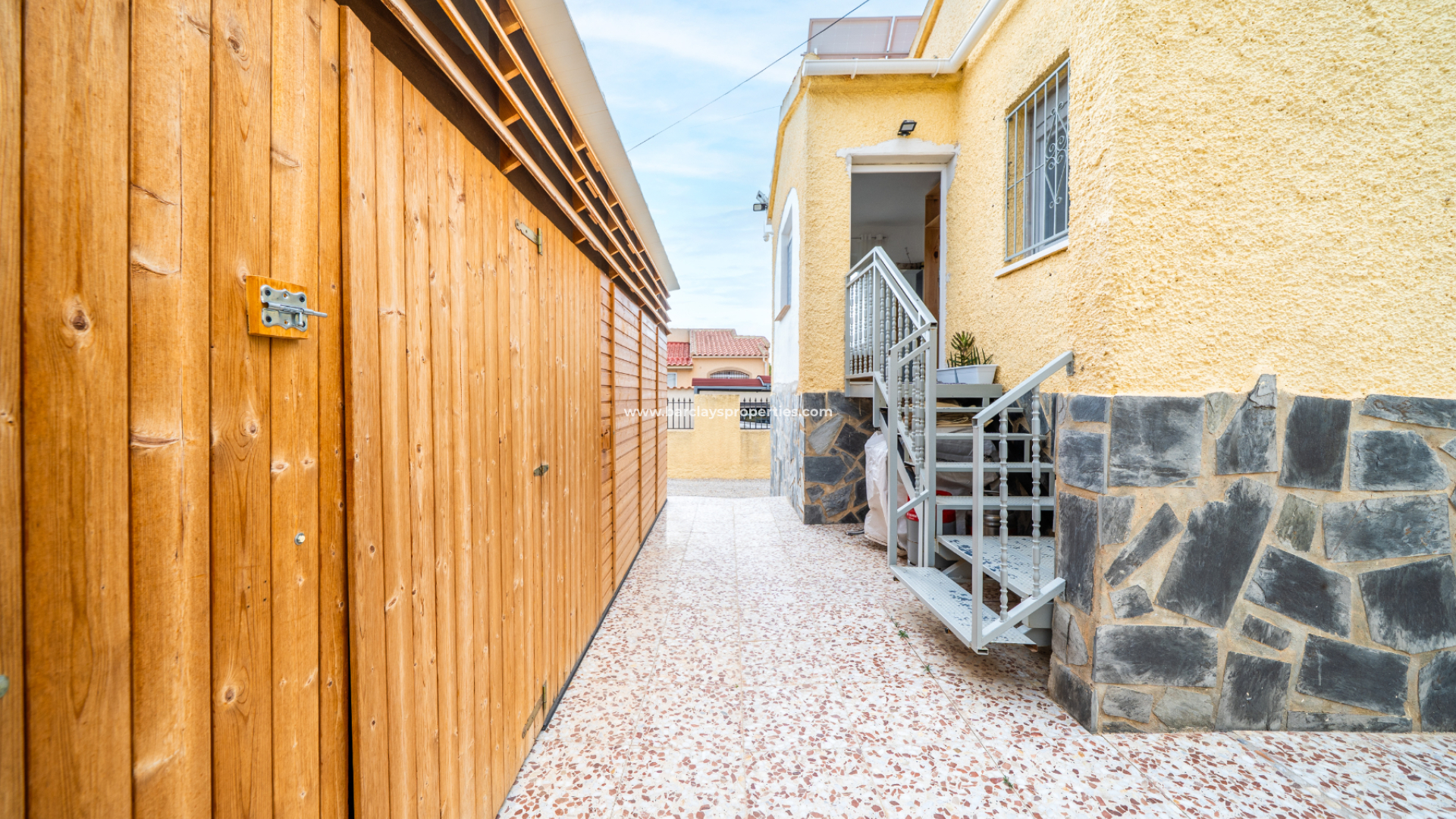 Des marches mènent de la véranda au jardin arrière, où vous trouverez un bain à remous, une douche solaire et une élégante pergola en aluminium, parfaite pour profiter de l'extérieur toute l'année. Un portail mène directement à un sentier vert, ce qui renforce l'environnement paisible.