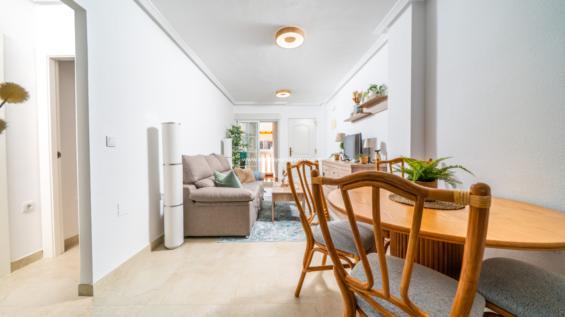 À l'intérieur, le salon lumineux et accueillant avec climatisation et un coin repas dédié s'ouvre sur une cuisine moderne et entièrement électrique, avec une porte d'accès à une buanderie séparée offrant de l'espace pour la chaudière et la machine à laver. La chambre principale comprend des armoires encastrées et une salle de bain privée avec douche, meuble-lavabo et toilettes. La deuxième chambre est une chambre à lits jumeaux, et il y a une salle de bain séparée avec douche, meuble-lavabo et toilettes.