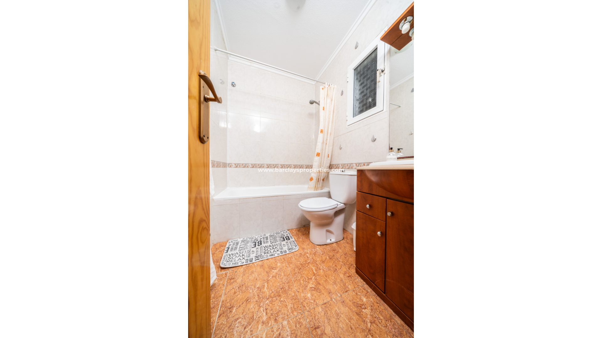 Il y a trois chambres au total. La première chambre est une chambre double avec placards intégrés, ventilateur de plafond et climatisation. La deuxième chambre est une chambre avec deux lits simples, également avec placards intégrés, ventilateur de plafond et climatisation. La troisième chambre est une autre chambre double, équipée d'un ventilateur de plafond et de la climatisation. La salle de bain comprend une baignoire, un WC, un meuble-lavabo et un sèche-serviettes électrique.