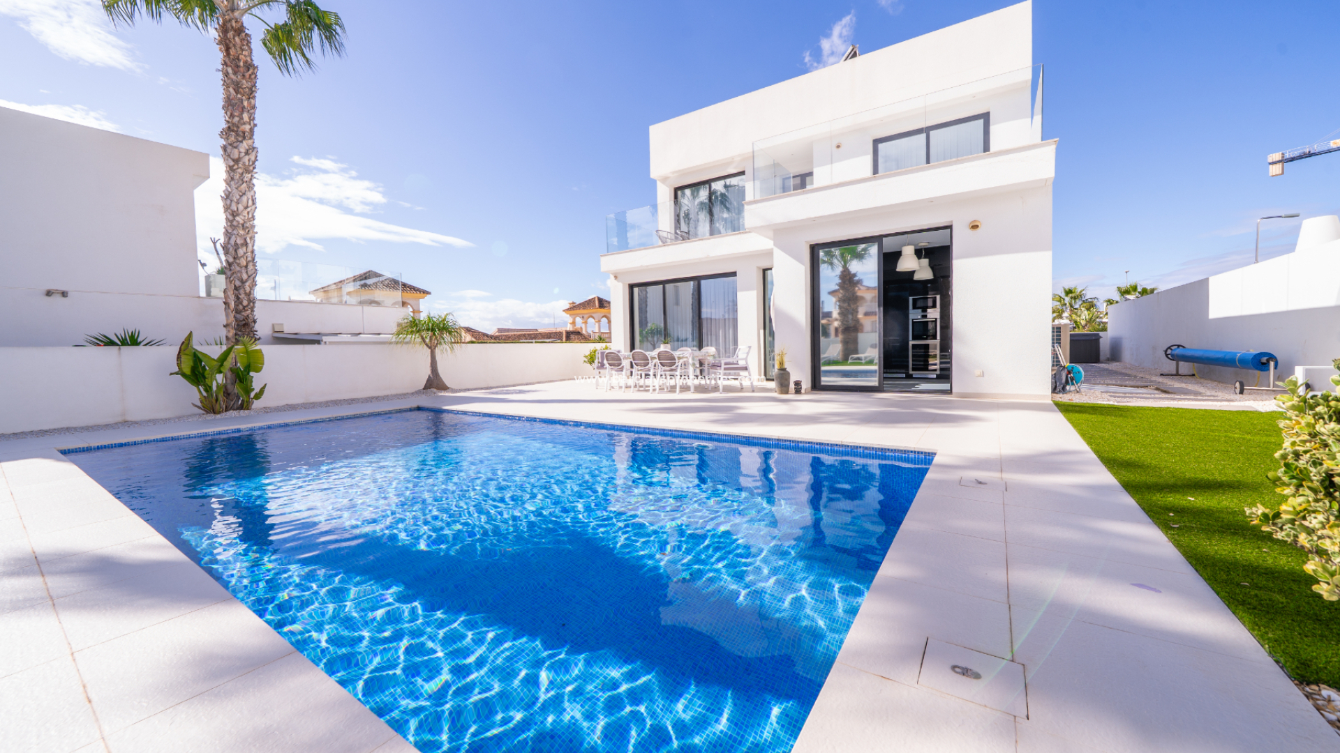 Présentation de cette impressionnante villa de luxe individuelle moderne située à Urb. La Marina, San Fulgencio, à seulement 5-10 minutes des commodités locales. ➡️ Située sur un terrain de 500 m² mêlant carrelage, gravier et gazon artificiel, la propriété offre 160 m² d'espace de vie lumineux et moderne avec de grandes fenêtres et une orientation à l'est qui profite au maximum du soleil du matin.
