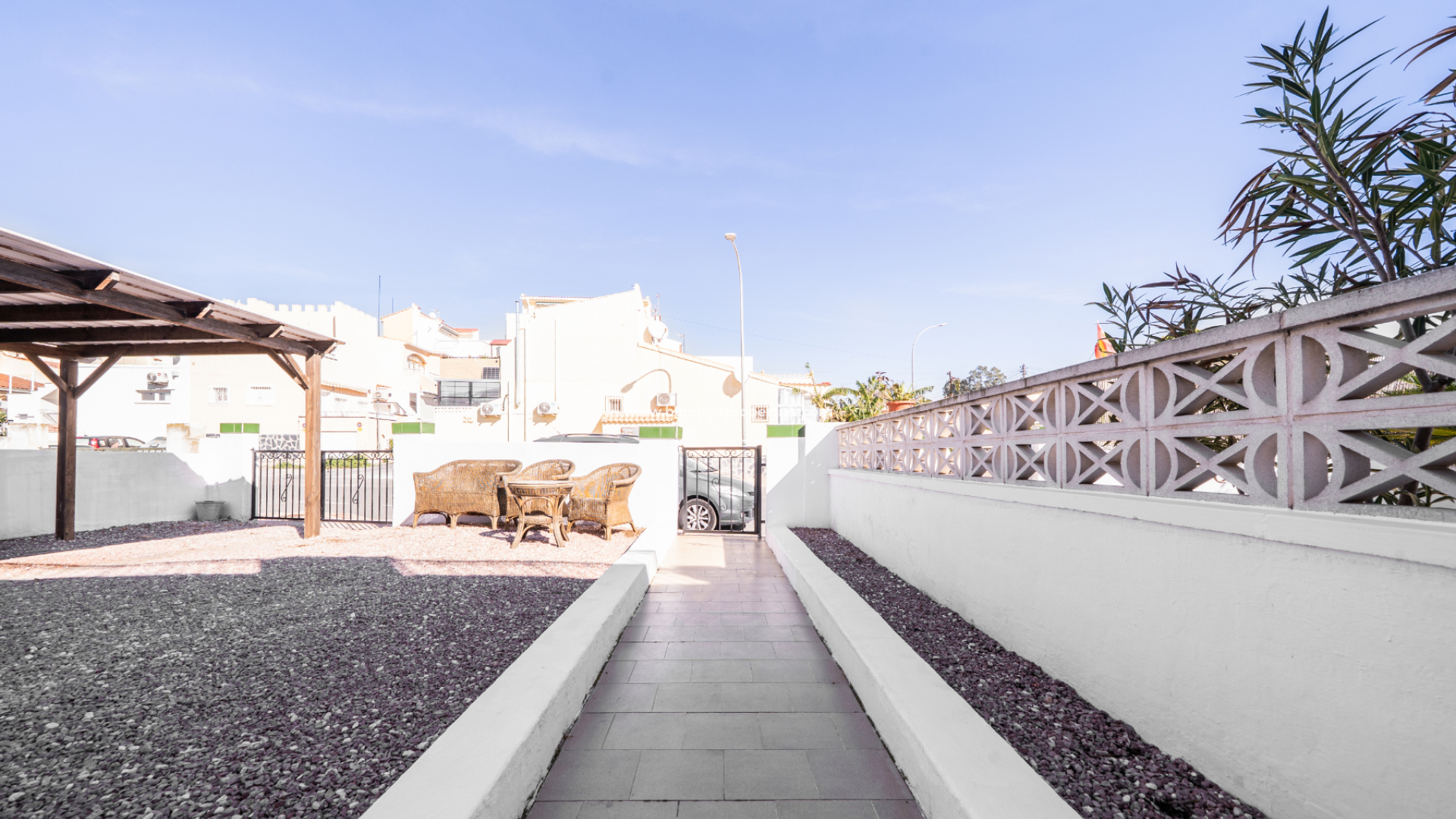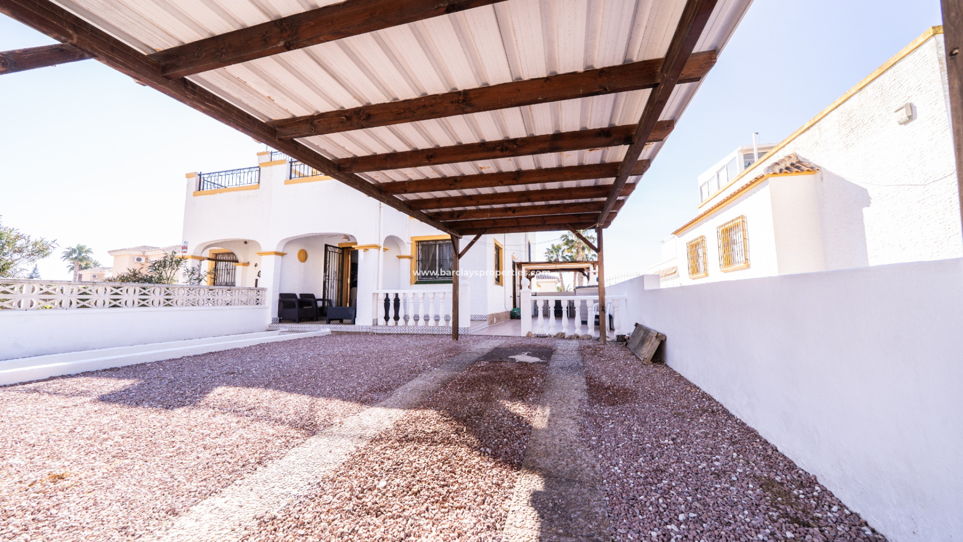 À l'avant, on trouve un jardin de gravier facile d'entretien doté d'une pergola en bois et d'un espace de préparation extérieur dédié avec un coin repas et un barbecue, idéal pour recevoir la famille et les amis. ➡️ Un abri de voiture en bois offre un stationnement pratique hors voirie, et un porche couvert crée une entrée accueillante et un endroit agréable pour se détendre à l'ombre.