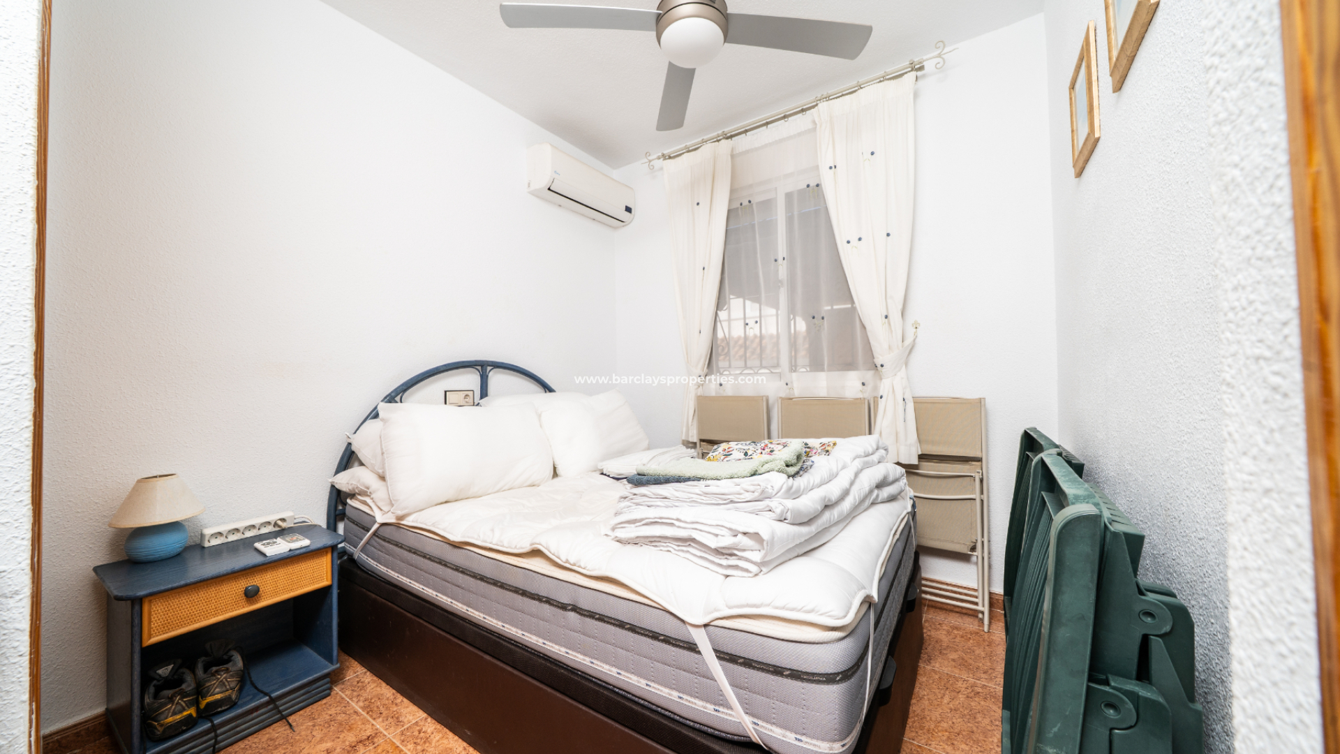 La propriété offre trois chambres, toutes avec placards intégrés, climatisation et ventilateur de plafond. La première est une chambre double, la seconde est une chambre avec deux lits simples, et enfin la chambre principale qui dispose de portes-fenêtres menant à un balcon privé. Il y a une salle de douche avec WC et lavabo, ainsi qu'une salle de bain familiale équipée d'une baignoire avec douche, bidet, WC et lavabo.