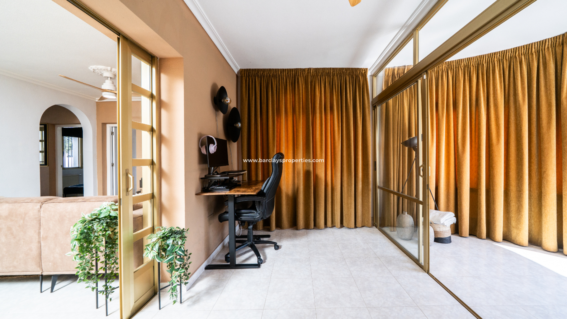 Les espaces intérieurs additionnels comprennent une buanderie et une pièce vitrée avec ventilateur de plafond, actuellement utilisée comme bureau à domicile, ce qui ajoute de la polyvalence à l'agencement.
