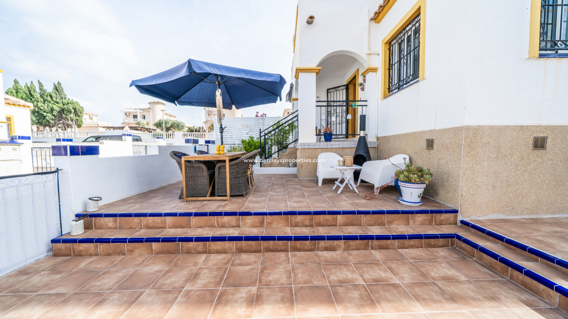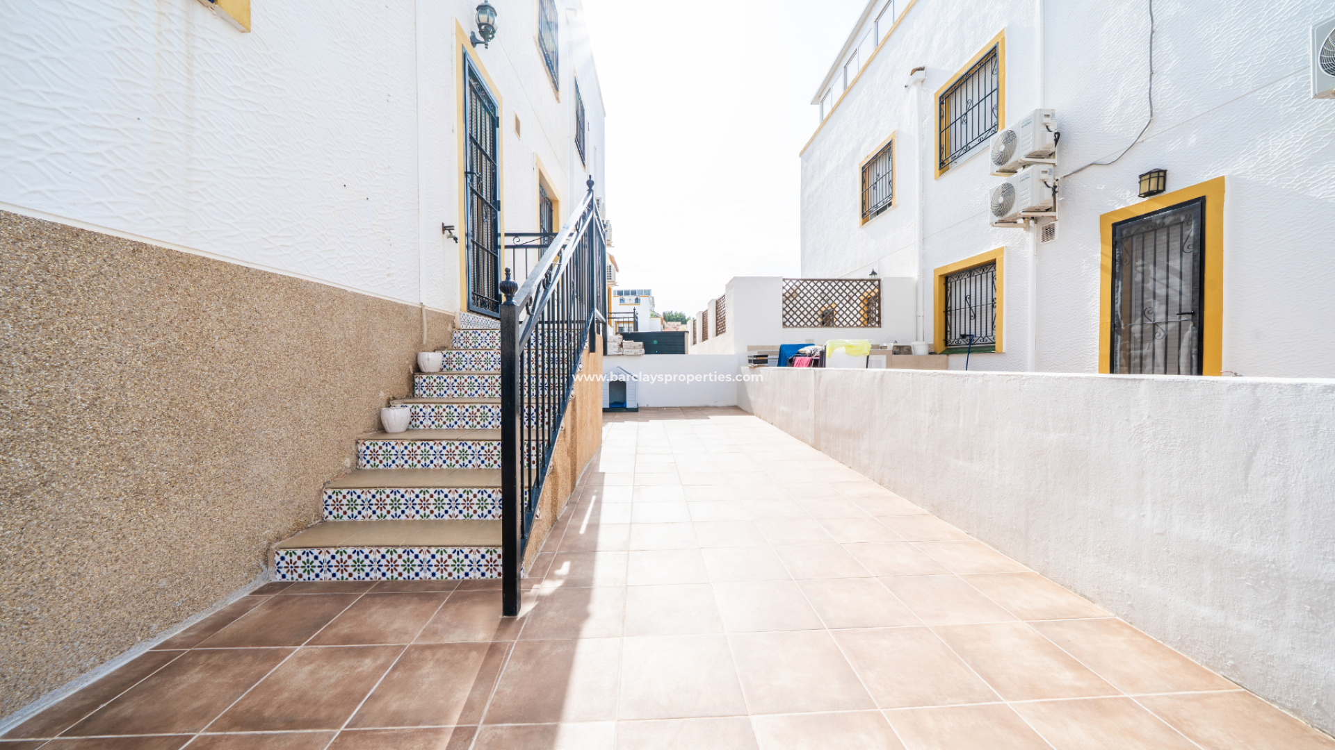 La propriété dispose d'un jardin entièrement carrelé, offrant un espace extérieur nécessitant peu d'entretien, idéal pour se détendre ou recevoir des invités. Un parking est disponible sur le terrain, assurant la sécurité de votre véhicule. Quelques marches mènent à un porche couvert et à l'intérieur de la villa.
