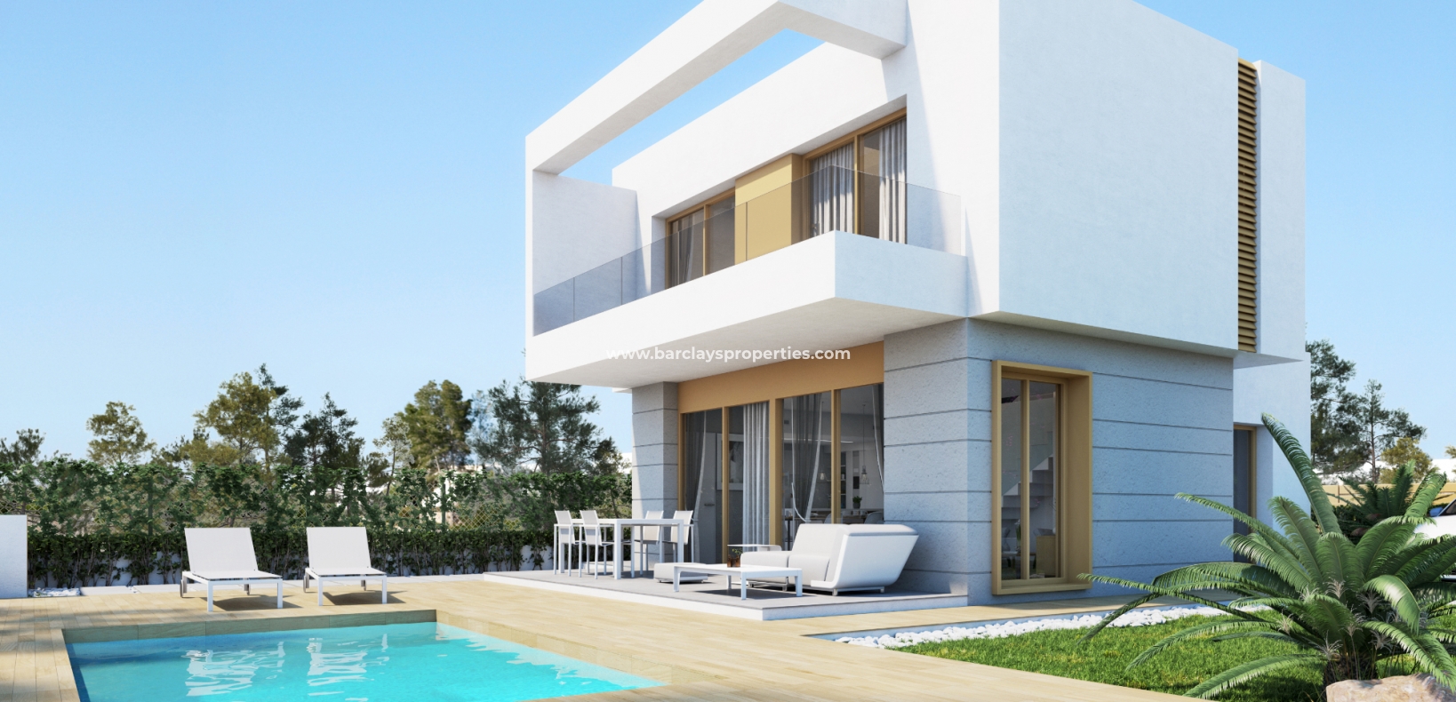 Nouvelles villas de trois chambres à coucher et trois salles de bains construites sur deux étages à proximité des commodités, de la plage et du terrain de golf de Vistabella, près de Torrevieja, sur la Costa Blanca.
