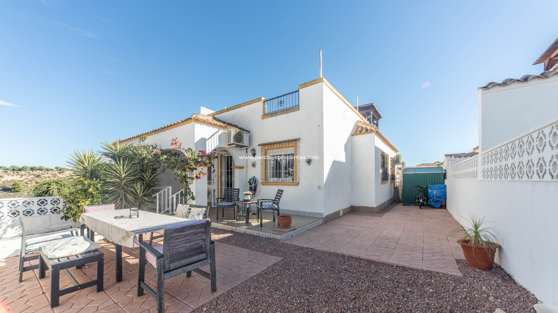 Une arche mène au couloir où se trouvent trois chambres doubles (deux d'entre elles ont des armoires encastrées et des ventilateurs de plafond et une des chambres a la climatisation). Une salle de bain de taille familiale se trouve au bout du couloir, avec une douche murale. De retour à la cuisine, nous trouvons une porte menant à la buanderie / patio avec des escaliers menant au solarium sur le toit avec un fantastique bar couvert, avec des tabourets de bar et même une cloche sur le côté pour ceux qui souhaitent laisser des pourboires pour le barman ! Cette zone est parfaite pour les divertissements pendant les chaudes journées et soirées d'été. Le solarium offre également des sièges pour les bains de soleil ainsi que des vues sur la ville voisine de Guardamar Del Segura.