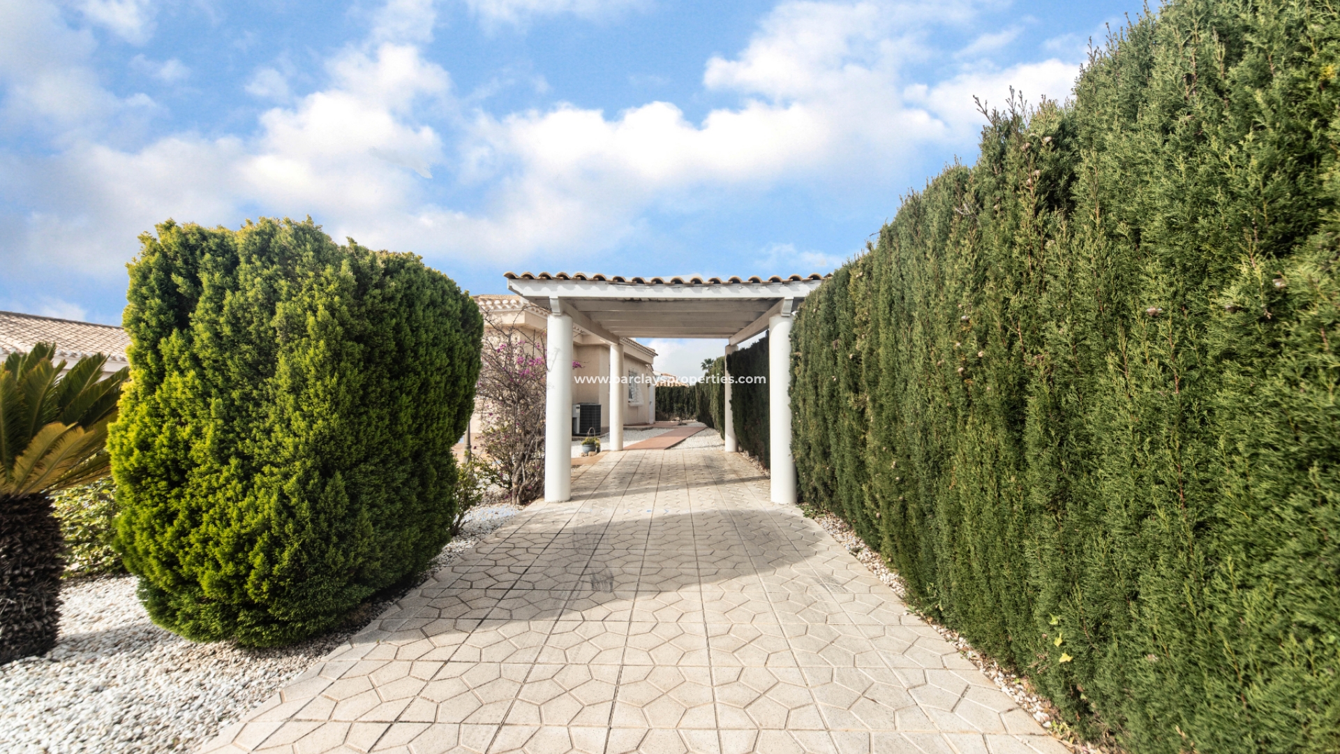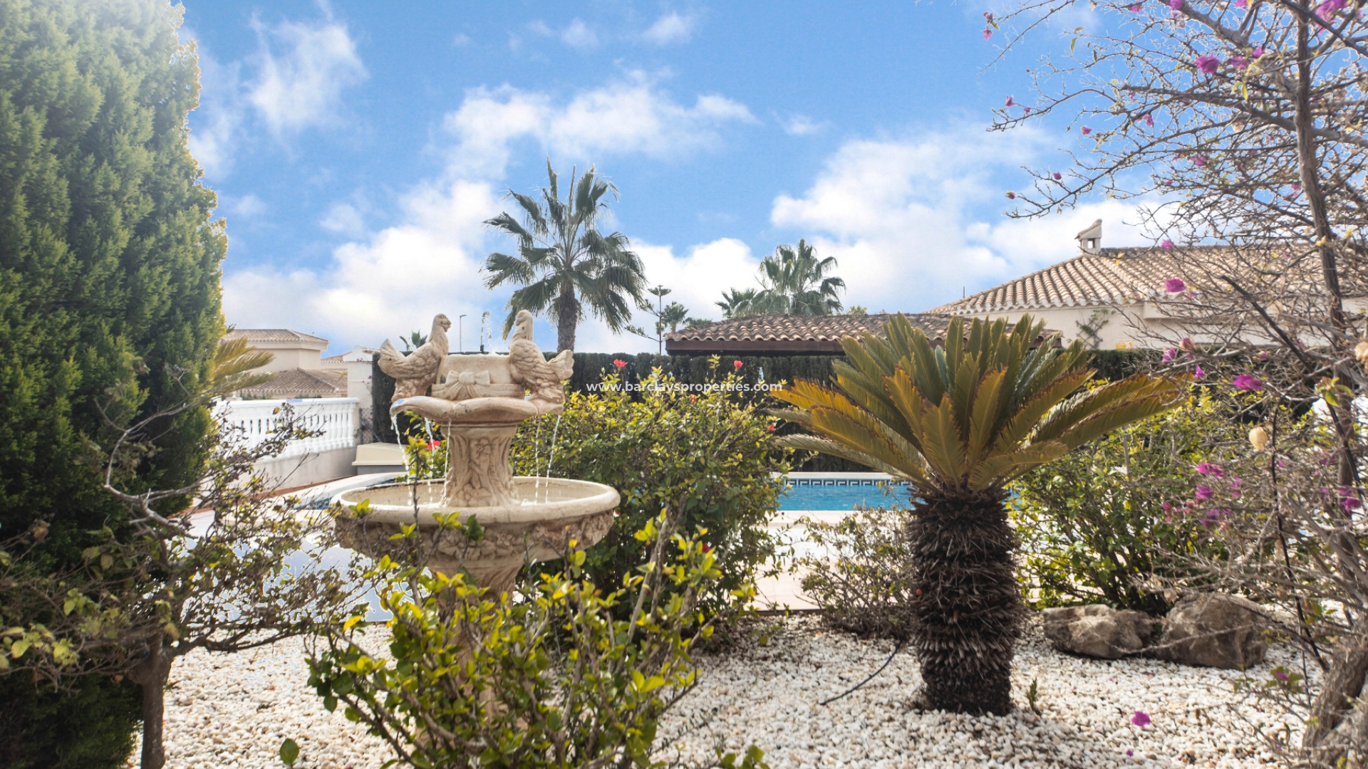 De ruime tuin van 510 m2, die voornamelijk betegeld is met wat grind, is toegankelijk via opritten en een voetgangerspoort met intercomsysteem, waar zich het prachtige privézwembad van 8 x 4 met buitendouche, parkeergelegenheid met carport, buitenverlichting en een waterfontein bevinden. Bovendien is de tuin voorzien van een irrigatiesysteem om hem het hele jaar door mooi te houden.