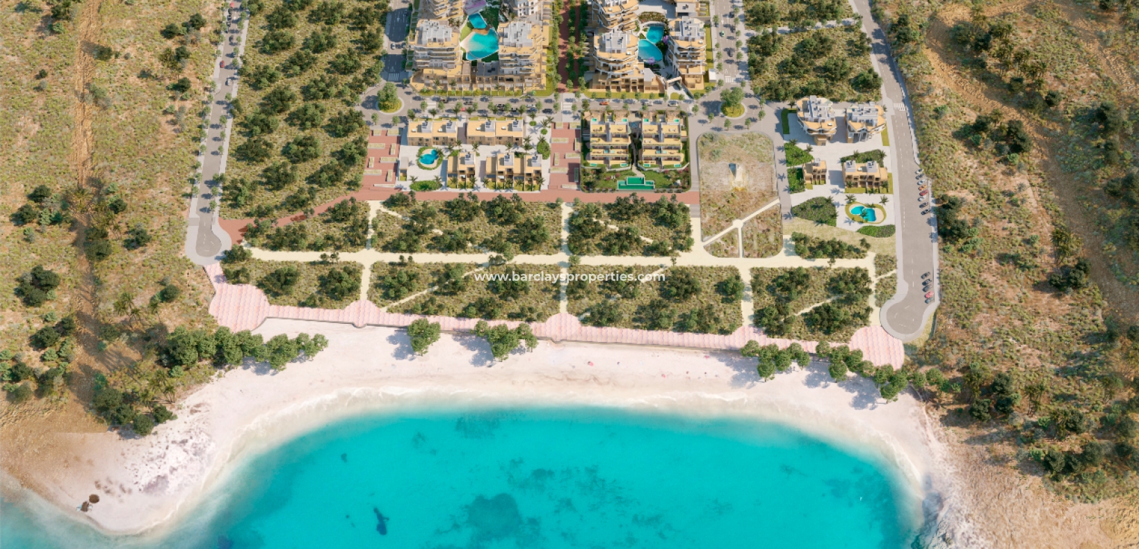 Een exclusief complex met uitzicht op een natuurlijke baai met turquoise blauwe zee en een fijn zandstrand, waar de bevoorrechte bewoners van de rust kunnen genieten.