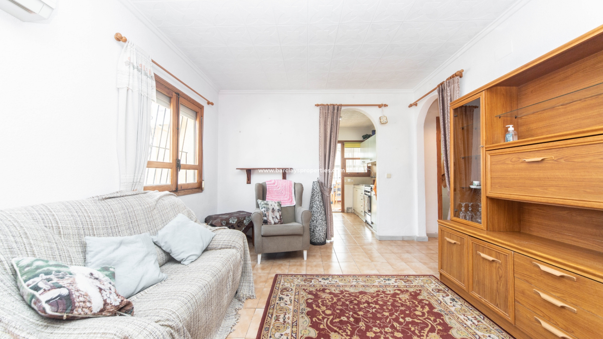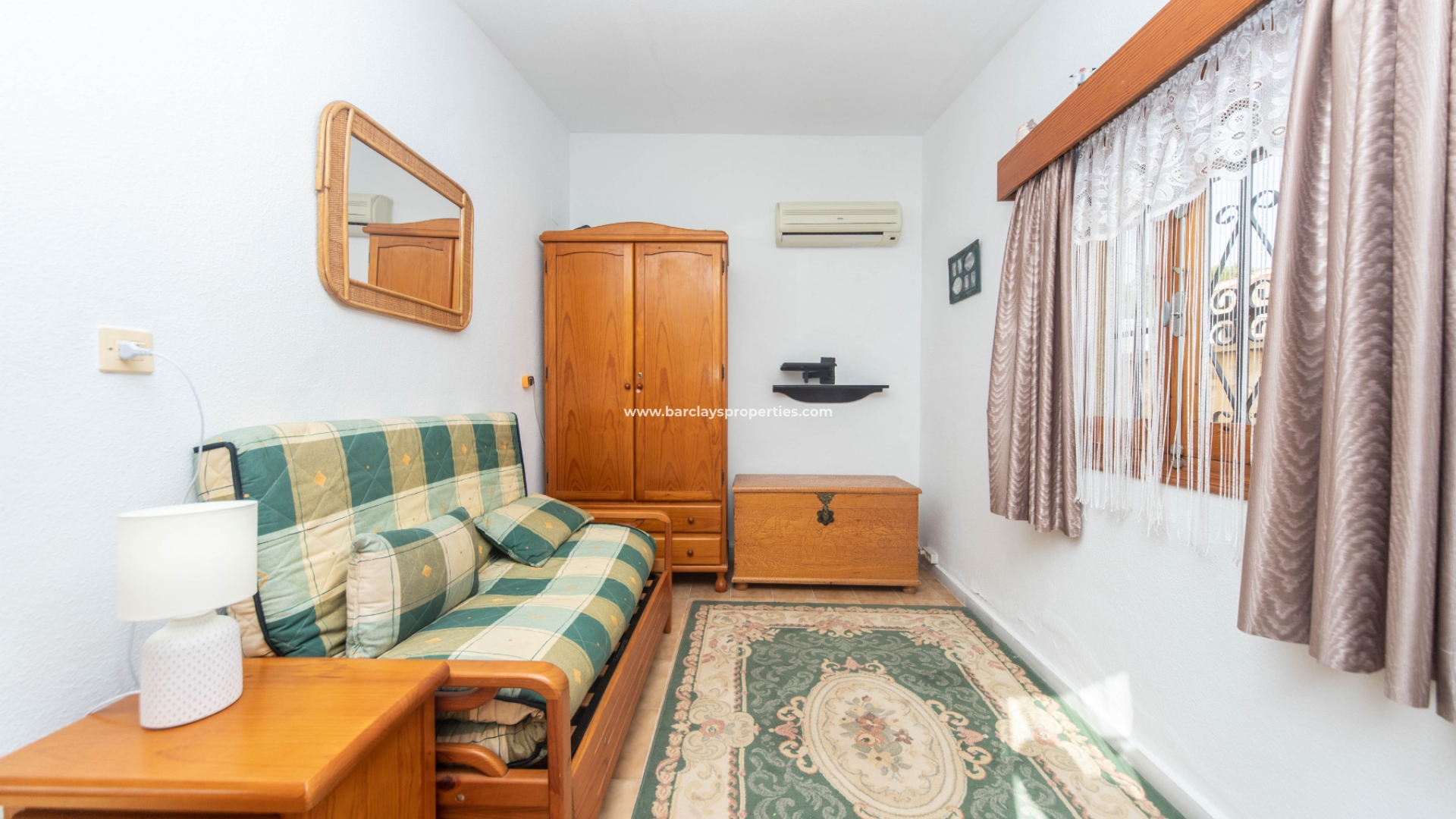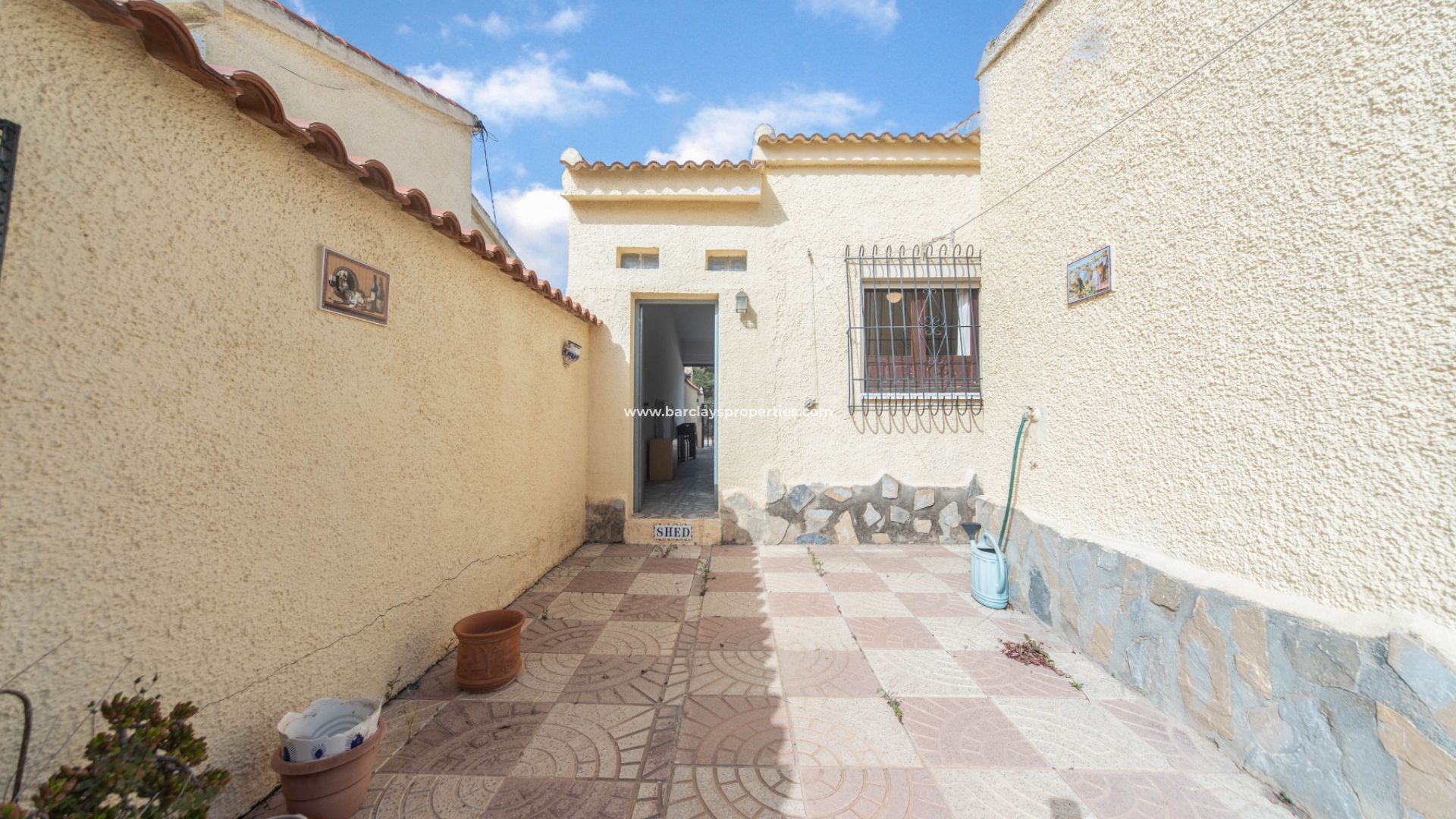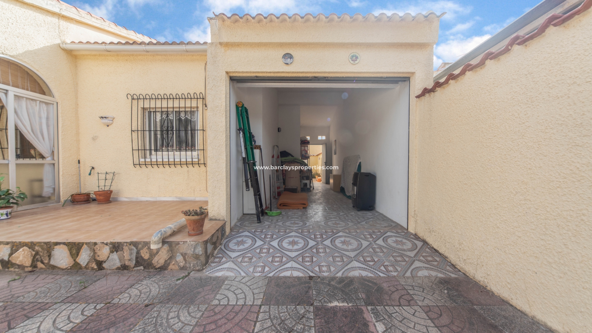 Een schuifpoort leidt naar de privé tuin die volledig verhard is en off-road parking biedt en toegang tot een privé garage. We vinden een zonneterras naast het glazen voorportaal / winterkamer die leidt naar het interieur van het pand waar we worden verwelkomd door de woonkamer die leidt naar een ingerichte keuken met oven, koelkast met vriesvak en magnetron. Vanaf hier vinden we een deur die leidt naar een ruime eetkamer/bijkeuken met wasmachine, gasketel en toegang tot een wasruimte met wc en wastafel. De andere kant van de eetkamer heeft een toegangsdeur naar een tweepersoons slaapkamer met airconditioning en een deur naar de op het zuiden gelegen achterpatio met zonnescherm. Vanuit de achtertuin is er een deur naar de privégarage met berging aan de achterzijde.