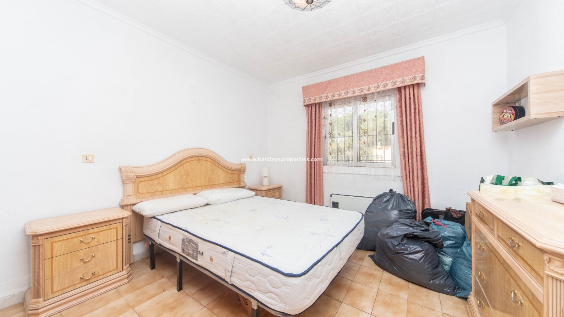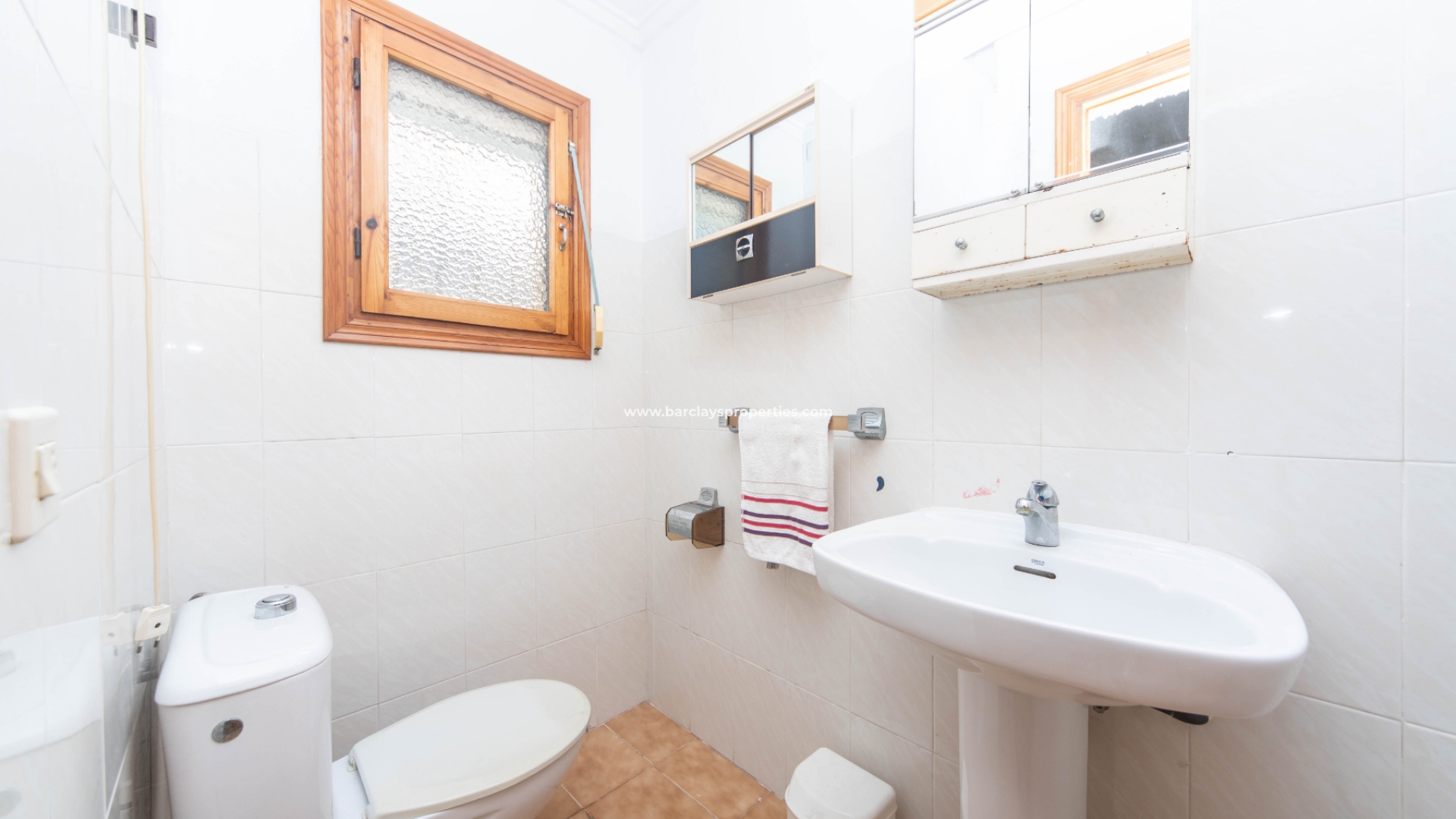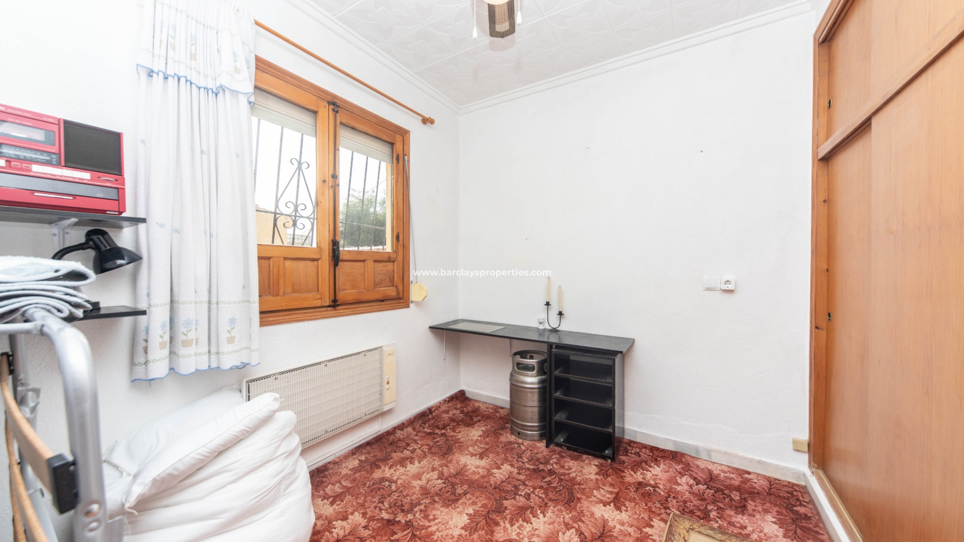 Terug naar het interieur van de woning en vanuit de hal hebben we toegang tot een badkamer met toilet, wastafel en bad/douche, een tweede slaapkamer met inbouwkasten, een radiator aan de muur en een derde slaapkamer met inbouwkasten, een radiator aan de muur en plafondventilatoren.