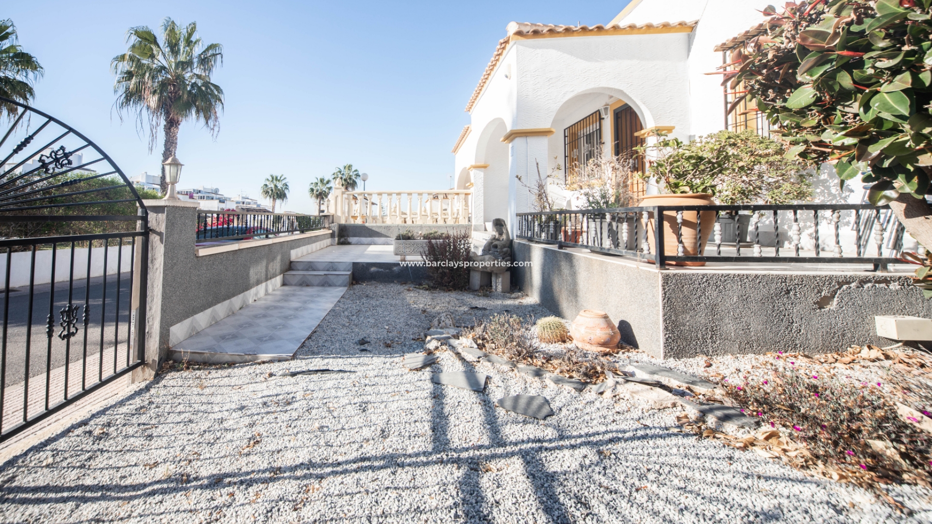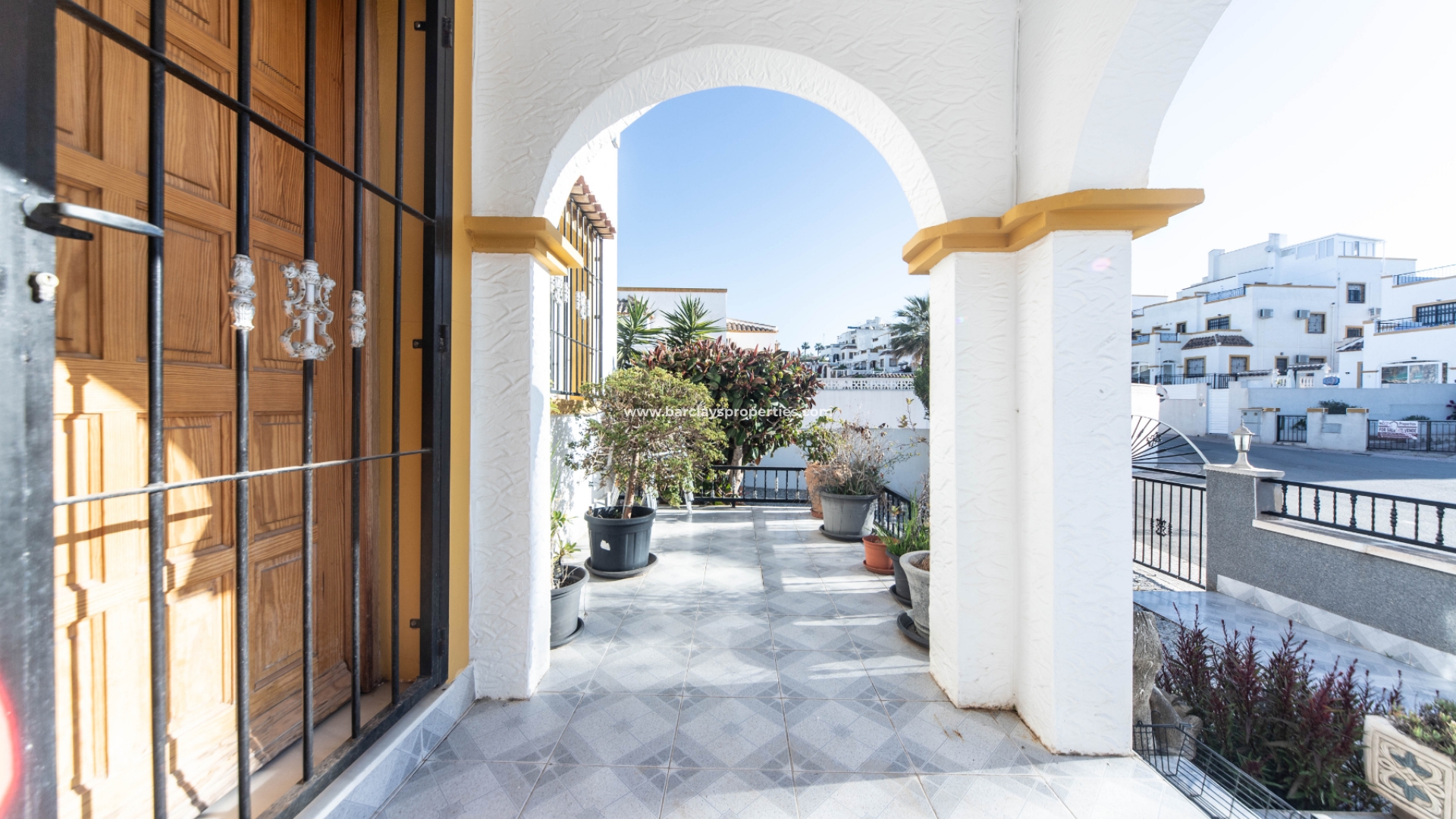 Het overdekte voorportaal leidt naar het interieur van het pand, waar we direct in de ruime woon/eetkamer met plafondventilatoren komen. Vanuit de hal vinden we een dubbele slaapkamer met airconditioning, plafondventilator en een inbouwkast, twee andere dubbele slaapkamers (een met inbouwkast) en een gerenoveerde familiebadkamer met hoekdouche, wc en wastafel. Ook toegankelijk vanuit de woonkamer is de ingerichte keuken die leidt naar een aparte bijkeuken/binnenplaats met een trap naar een serre die leidt naar een ruim solarium met prachtig uitzicht op de bergen en het gemeenschappelijke zwembad.