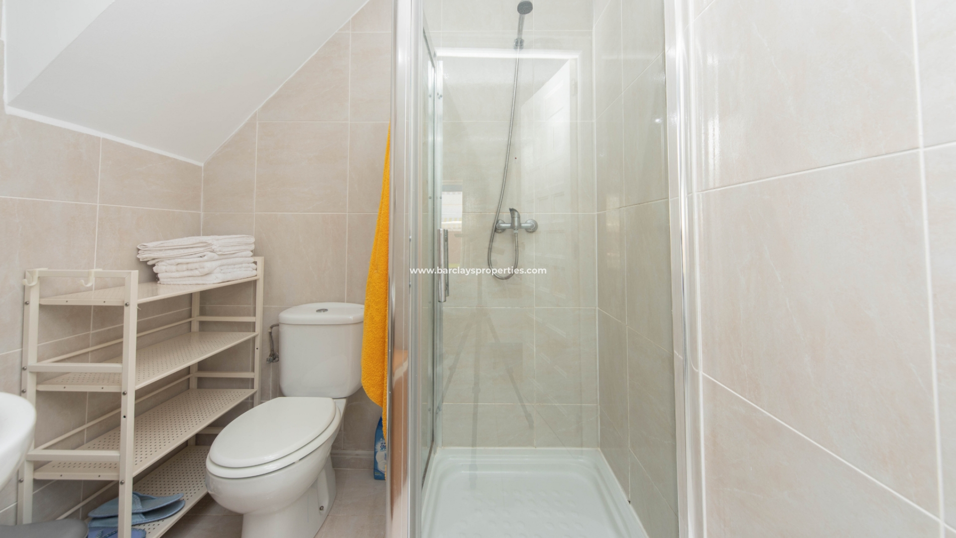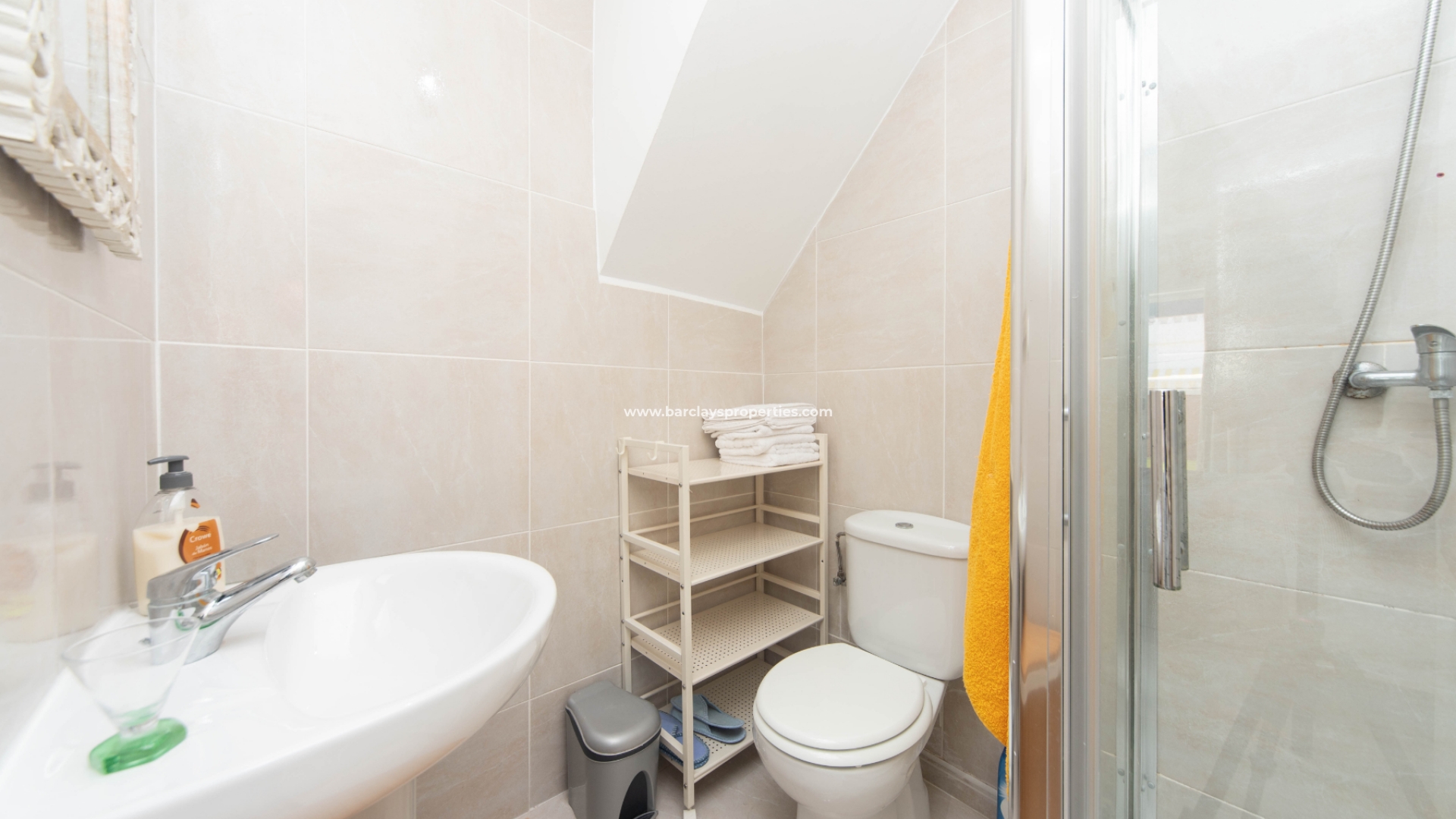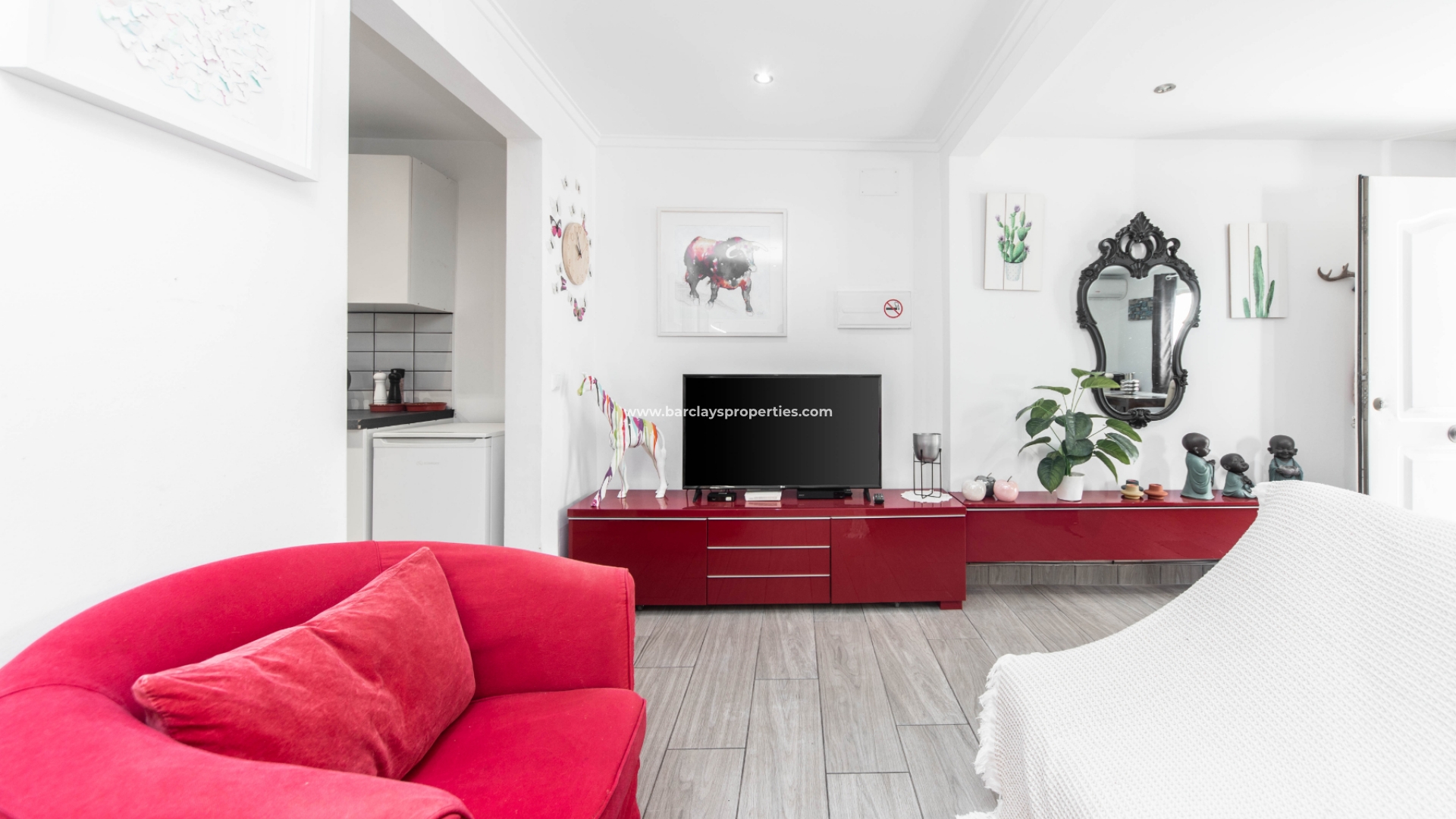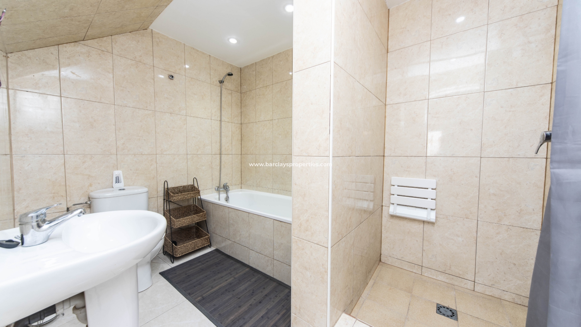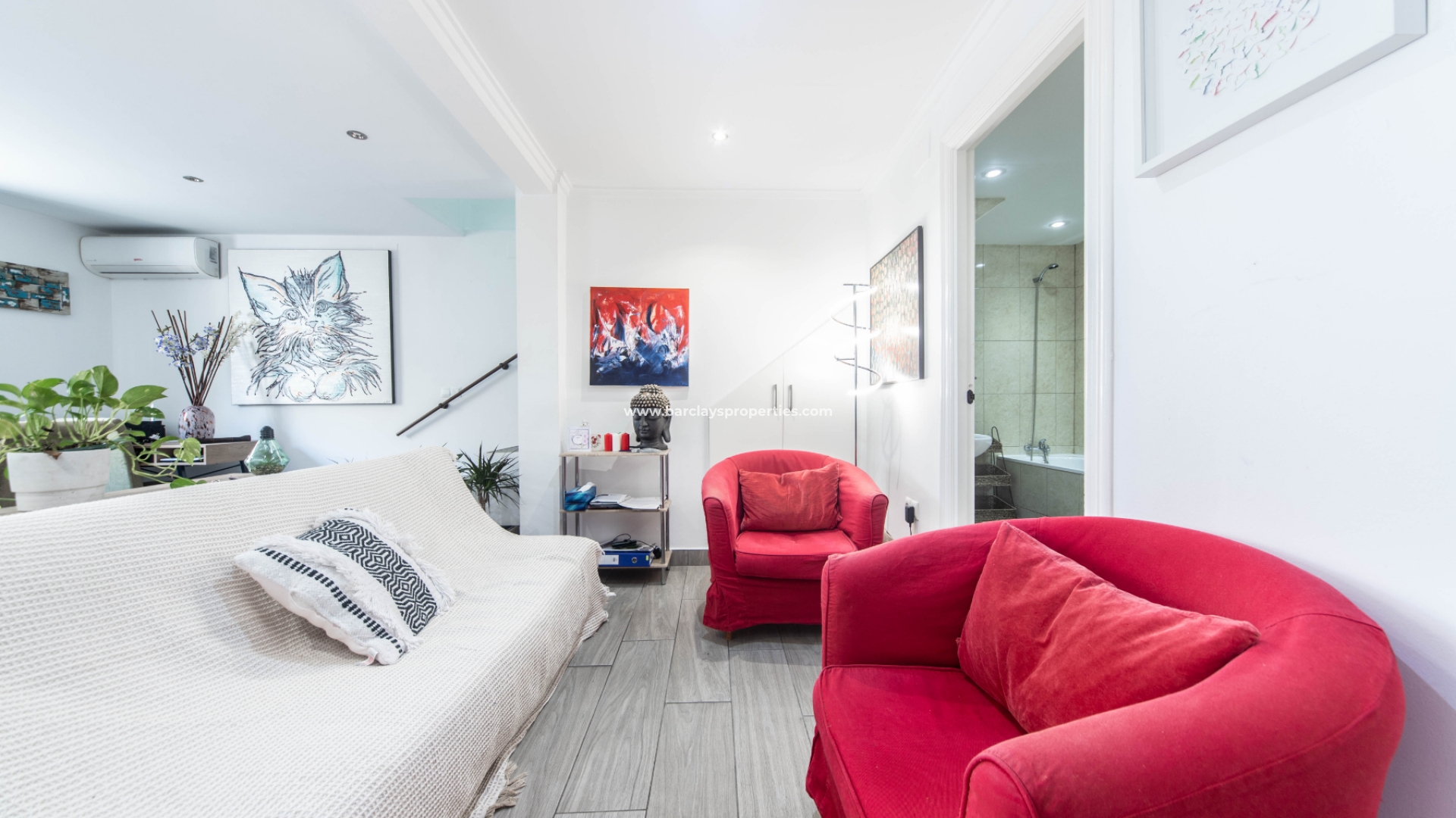We betreden de woning en vinden een moderne, frisse woonkamer met aparte eethoek met airconditioning en een semi-open ingerichte gerenoveerde, moderne keuken. Vanuit de woonkamer vinden we een ruime badkamer uitgerust met een groot bad, een aparte douche, wc en wastafel / badmeubel en spotjes aan het plafond. Een bergkast onder de trap herbergt de wasmachine.