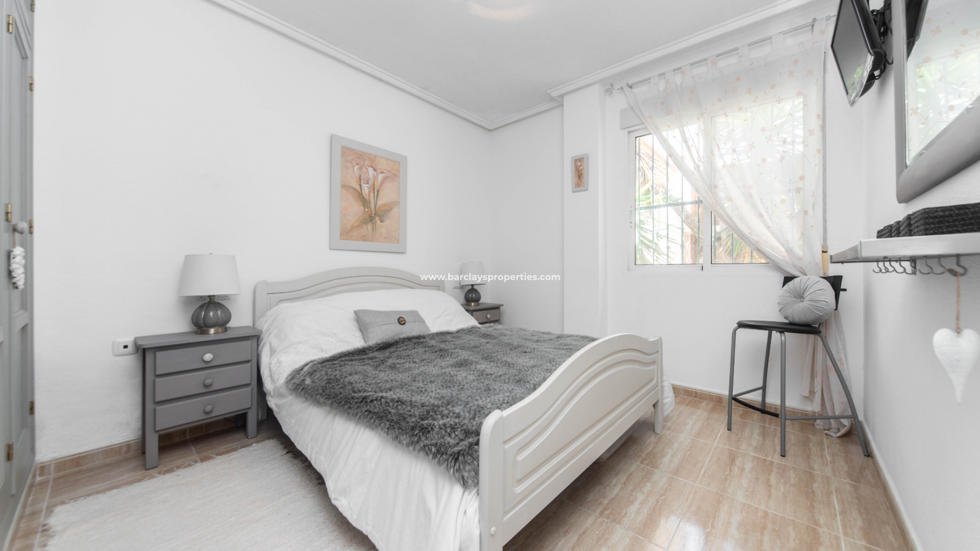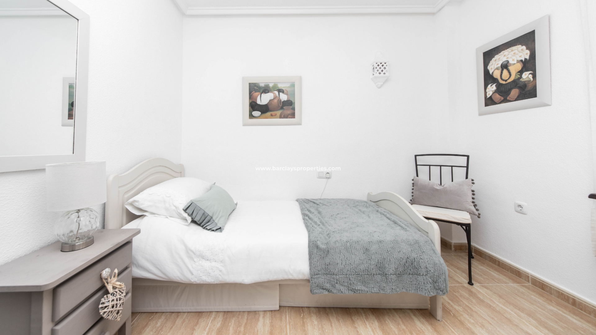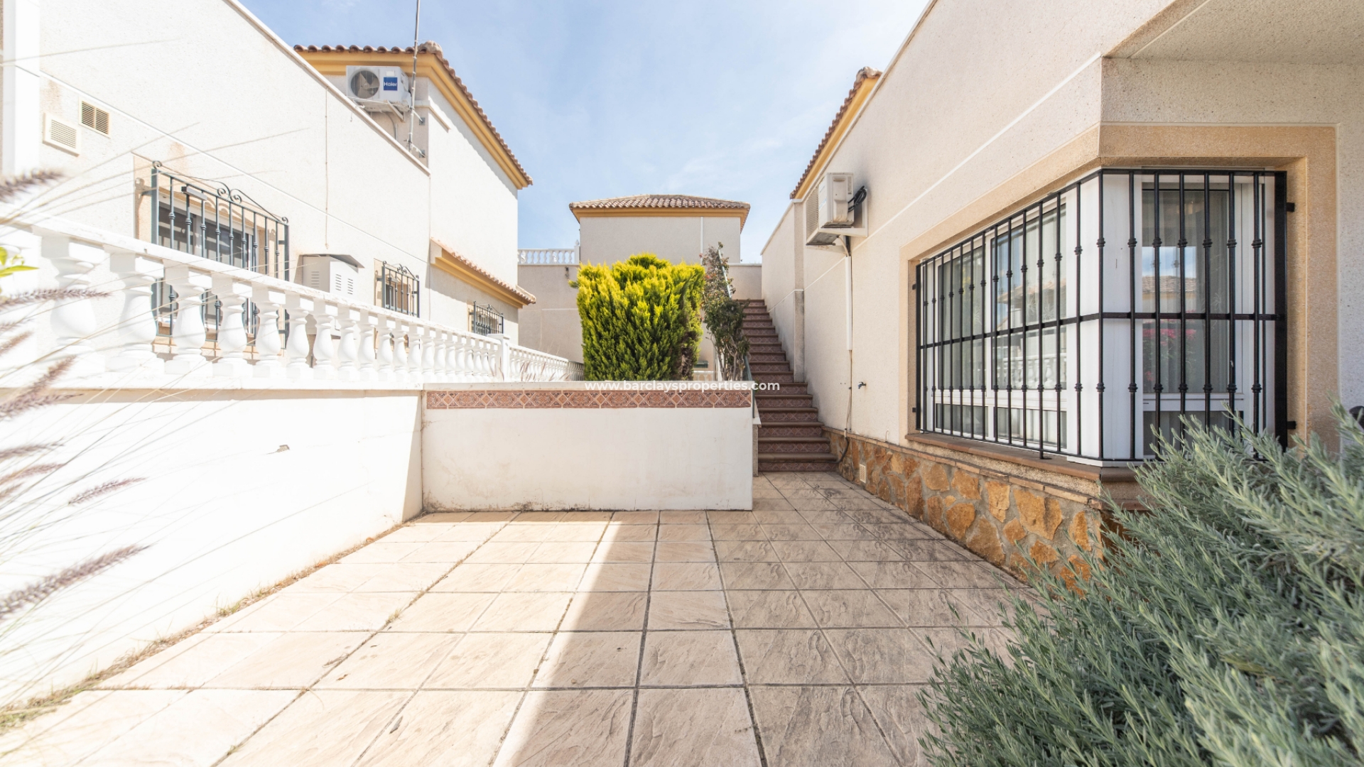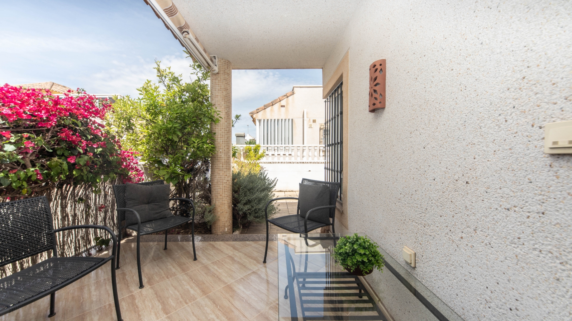 De toegang tot de mooie tuin is via de oprijpoort, waar we een volledig verhard perceel vinden met parkeergelegenheid. De overdekte voorporch met buitenzitje leidt naar het interieur van het pand waar we worden verwelkomd door de lichte en luchtige woon / eetkamer met airconditioning en een onafhankelijke volledig ingerichte keuken met elektrische apparaten die leidt naar een bijkeuken. Vanuit de hal vinden we twee slaapkamers met inbouwkasten en een ruime badkamer uitgerust met een ligbad, bidet, wc, wastafel, elektrisch verwarmd handdoekenrek en deurverwarming.