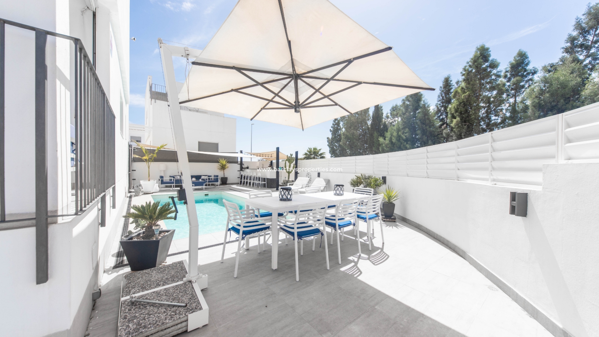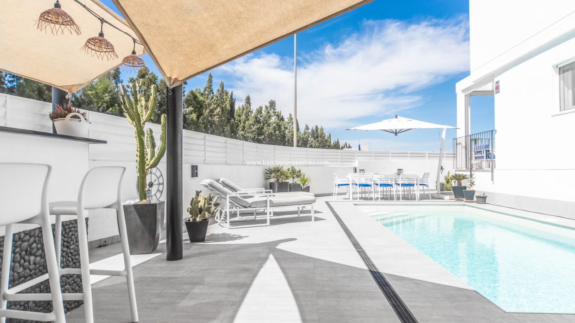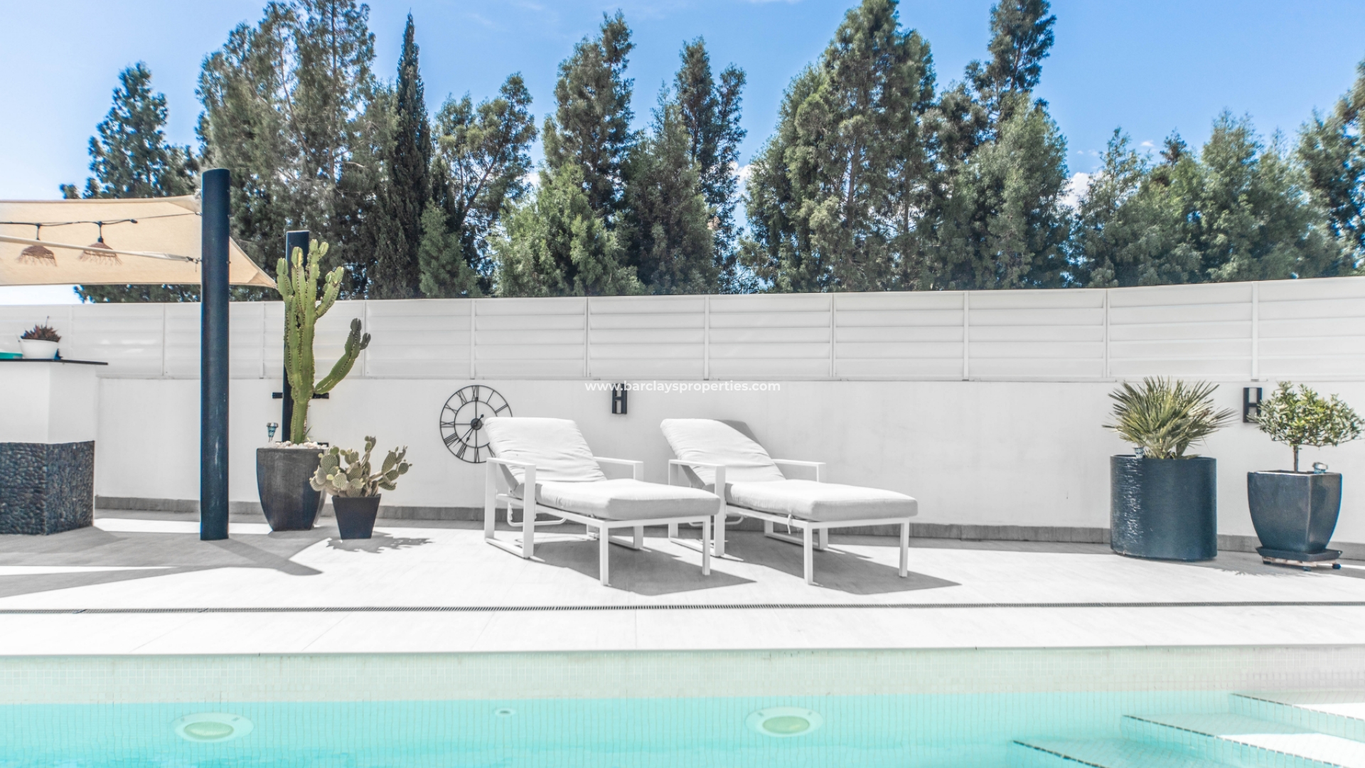 Te koop in urbanisatie La Marina, San Fulgencio is deze fantastische nieuwbouw luxe vrijstaande villa met een verwarmd privé zwembad van 7 x 3 en toegang tot een gemeenschappelijk zwembad. De woning is gelegen in een gemeenschap van 21 woningen op slechts 10 minuten lopen van alle voorzieningen.