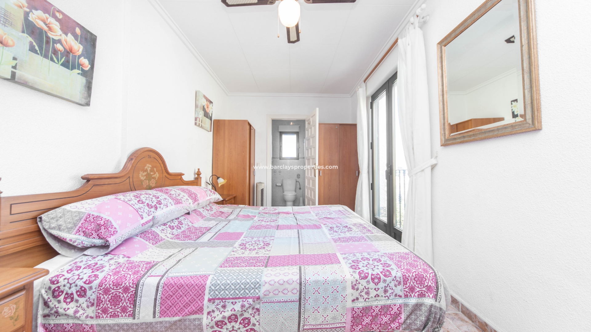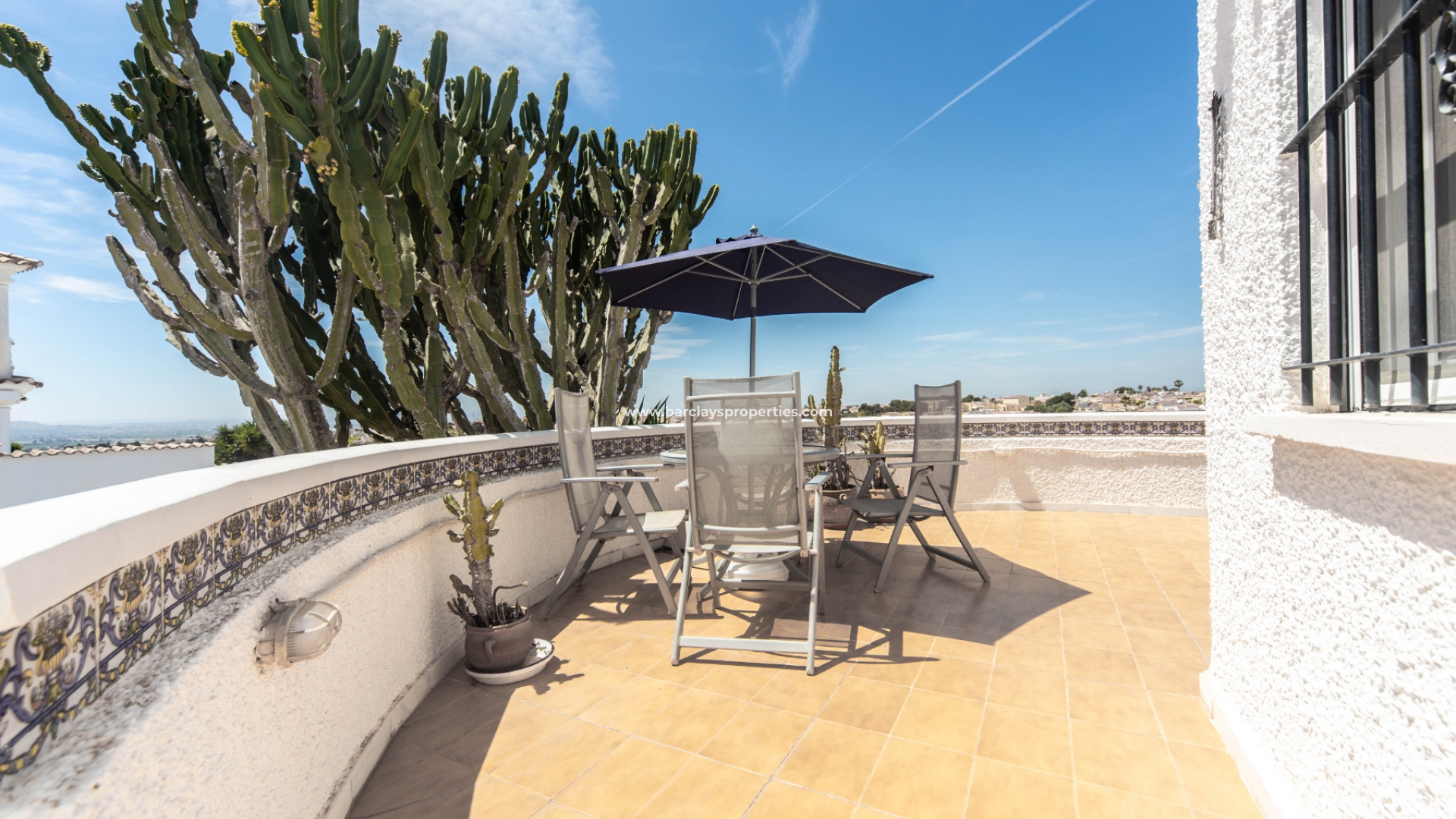 Een trap leidt naar een gebogen zonneterras met prachtig uitzicht op de bergendat toegang geeft tot het interieur van de woning waar we worden verwelkomd door een eetkamer, een open keuken met kookplaat, oven, afzuigkap, koelkast/vriezer, een ruime uitgebreide woonkamer met houtkachel, airconditioning en openslaande deuren naar het achterste zonneterras. Vanuit de hal vinden we een badkamer met douche, wc en wastafel, twee tweepersoons slaapkamers met plafondventilatoren en inbouwkasten en een van de slaapkamers heeft toegang tot een en-suite badkamer met douche, wc en wastafel en toegang tot een Frans balkon via openslaande deuren. Een derde slaapkamer met plafondventilator bevindt zich links van de openslaande deuren van de woonkamer.