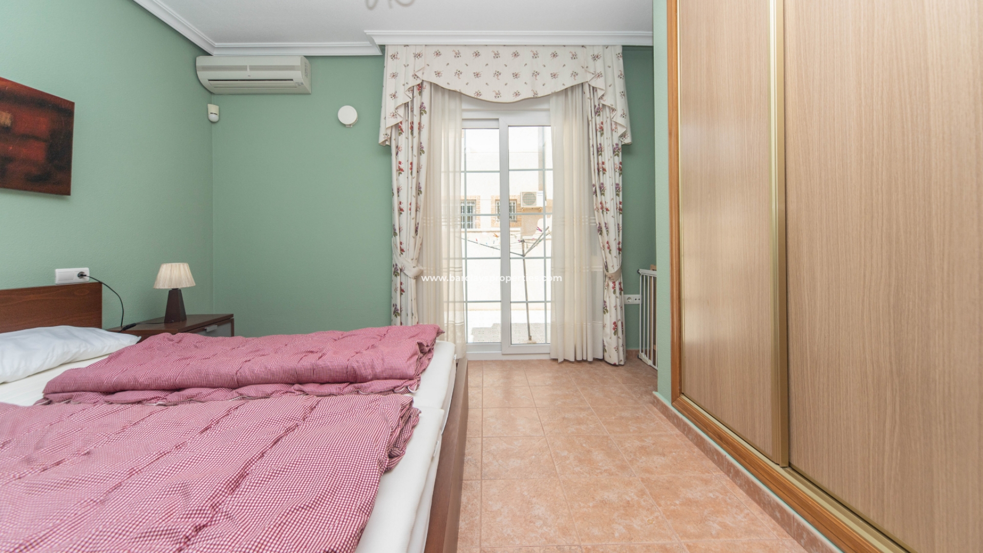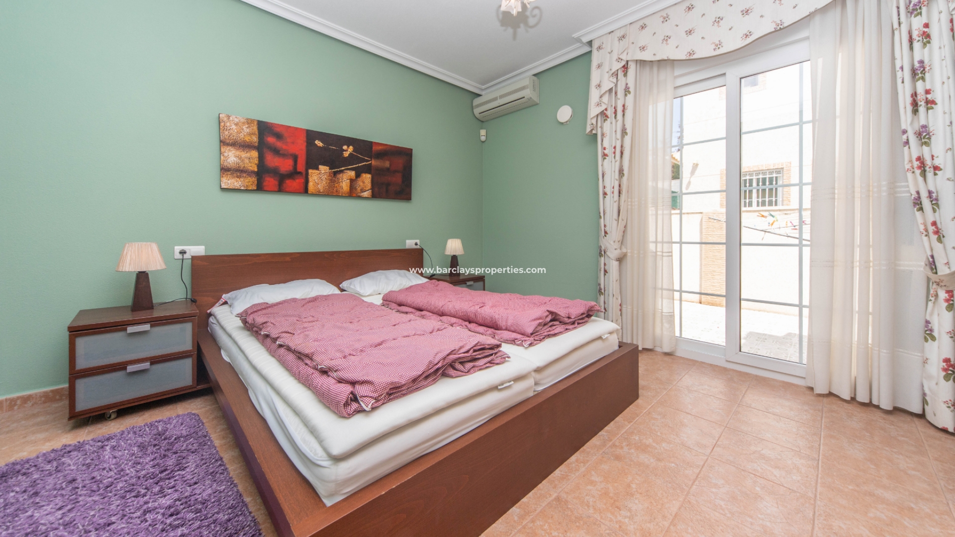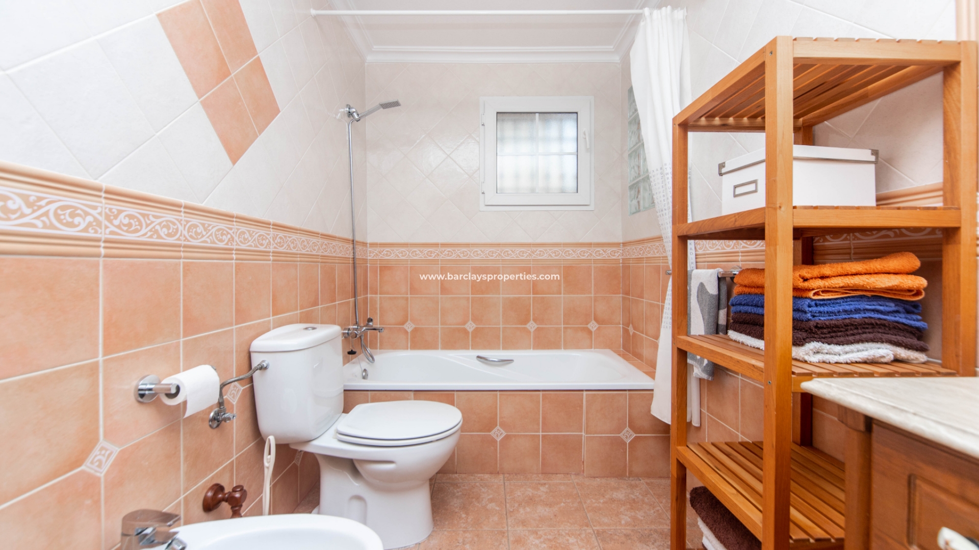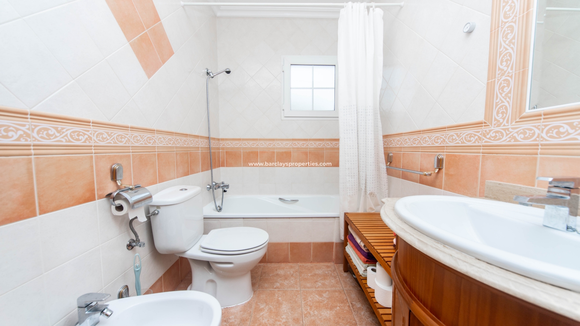 Een trap leidt naar het overdekte voorportaal met zonnescherm en een zonneterras dat naar het interieur van het pand leidt, waar we worden verwelkomd door een grote open geplande woon/eetkamer en keuken met ontbijtbar en airconditioning, een bijkeuken met wasmachine. Ook op de begane grond is een grote tweepersoons slaapkamer met inbouwkasten en airconditioning en een familie badkamer met een groot bad, bidet, wastafel/unit en WC.