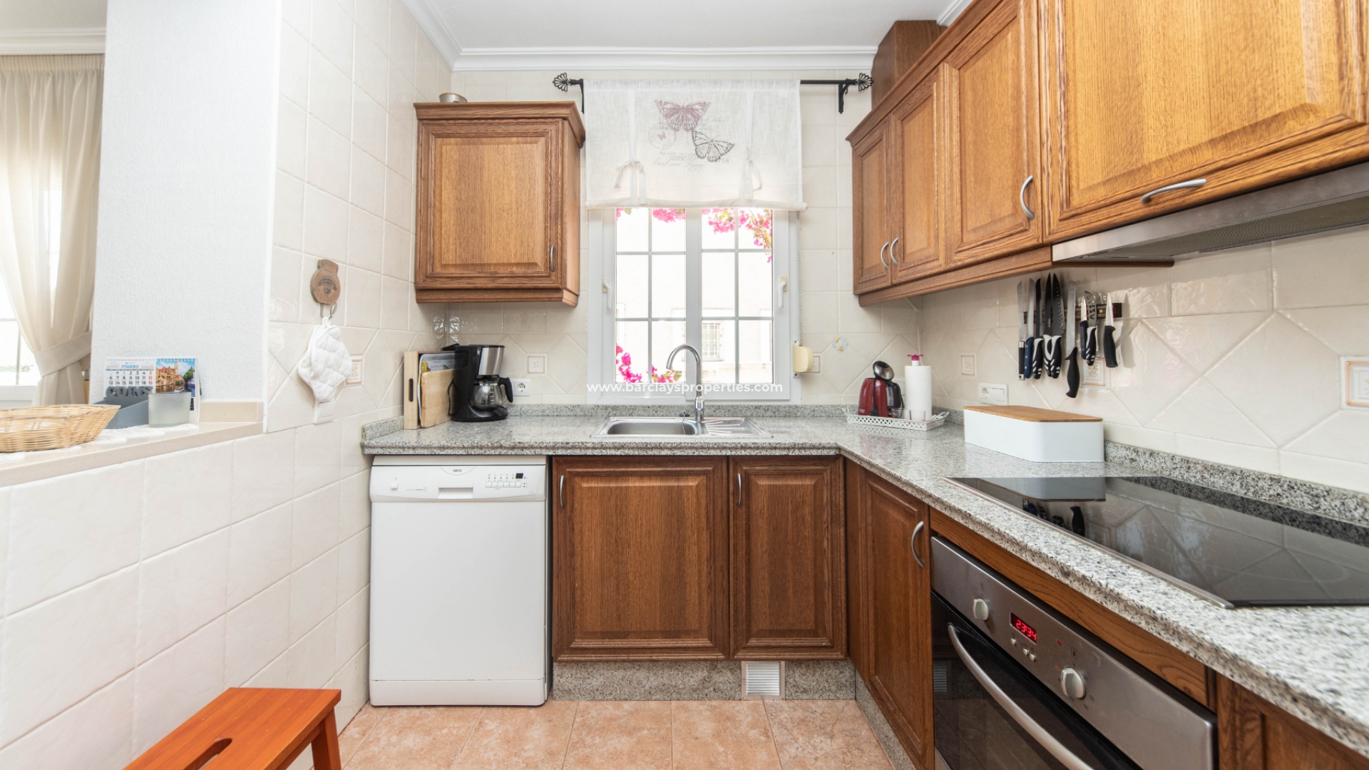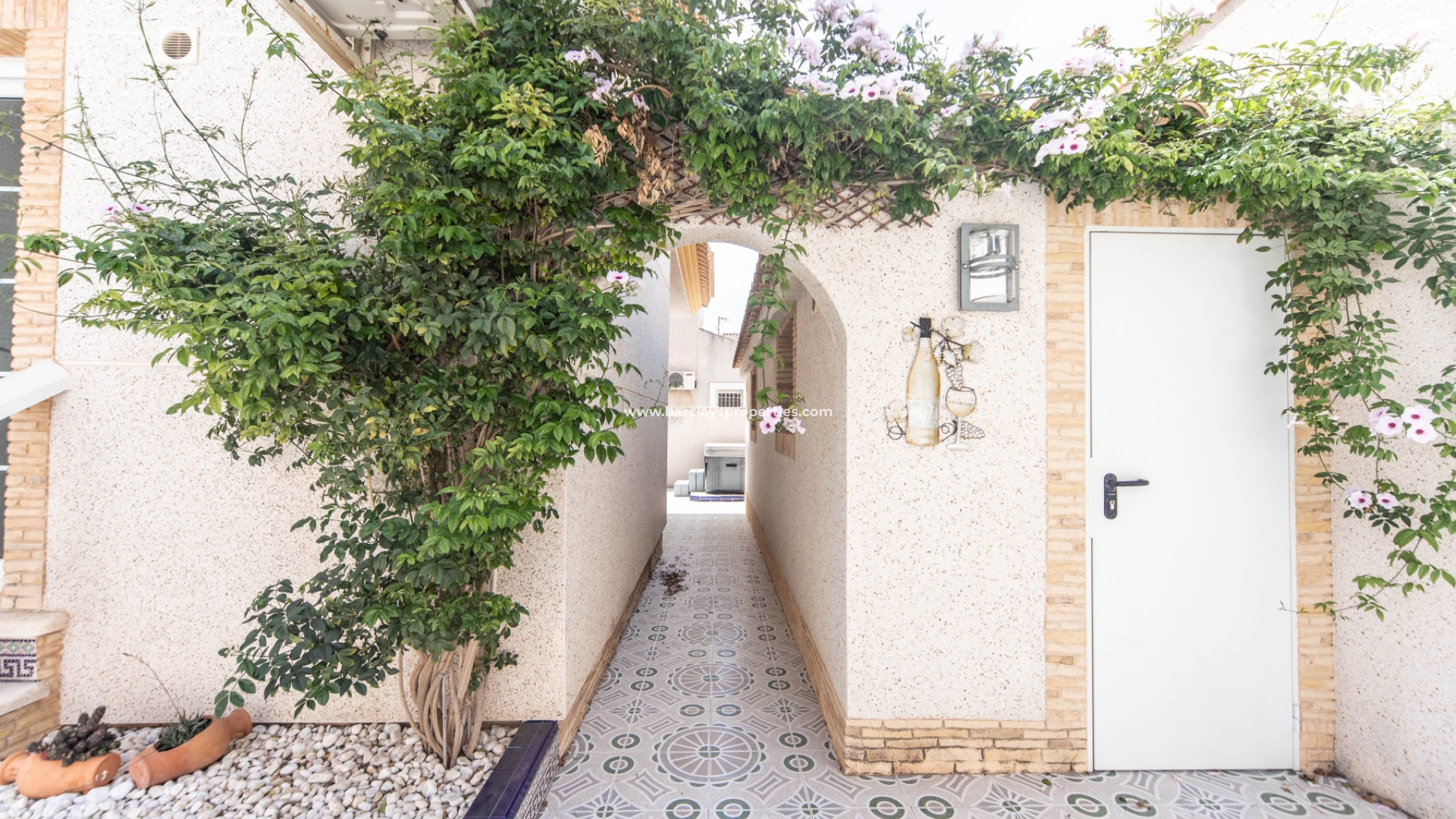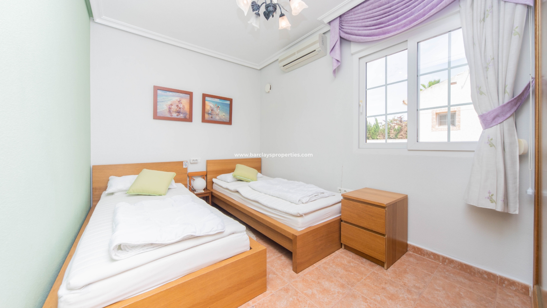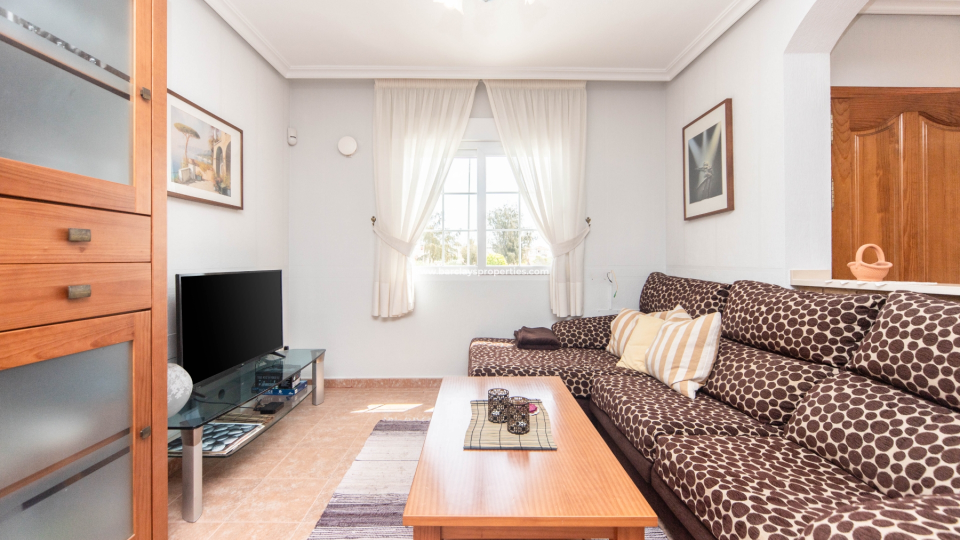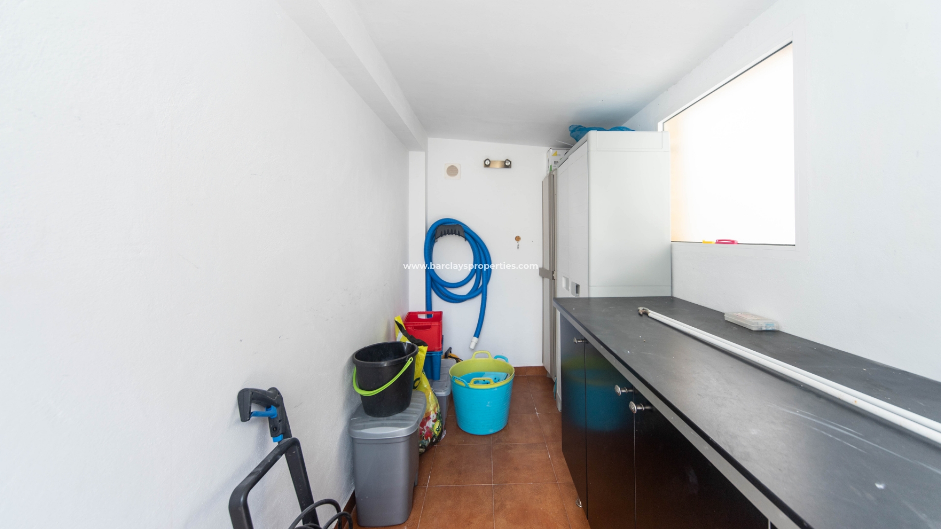 Een trap leidt naar het overdekte voorportaal met zonnescherm en een zonneterras dat naar het interieur van het pand leidt, waar we worden verwelkomd door een grote open geplande woon/eetkamer en keuken met ontbijtbar en airconditioning, een bijkeuken met wasmachine. Ook op de begane grond is een grote tweepersoons slaapkamer met inbouwkasten en airconditioning en een familie badkamer met een groot bad, bidet, wastafel/unit en WC.