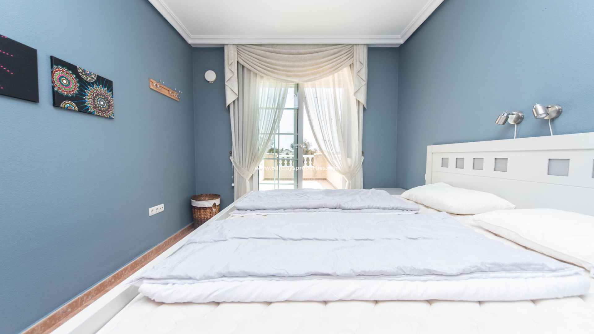 De eerste verdieping van deze prachtige villa wordt bereikt door een marmeren trap waar we nog twee slaapkamers met inbouwkasten en airconditioning vinden. De hoofdslaapkamer heeft openslaande deuren naar een ruim, privé zonneterras met prachtig uitzicht over het park, de bergen en naar de naburige stad Guardamar Del Segura.